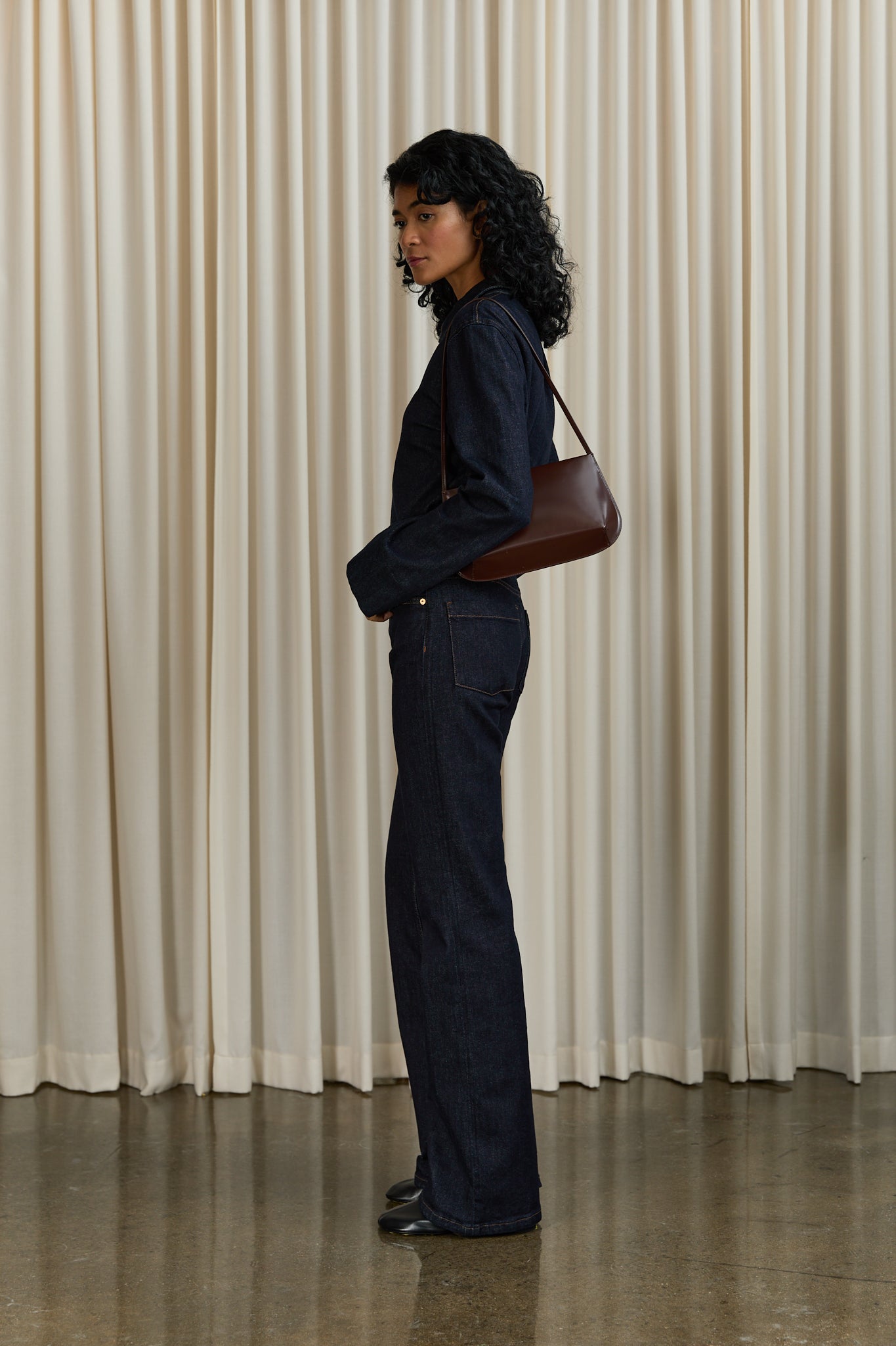 Shoulder bag with a slim, ribbon-like strap featuring magnetic closure and inner pocket.