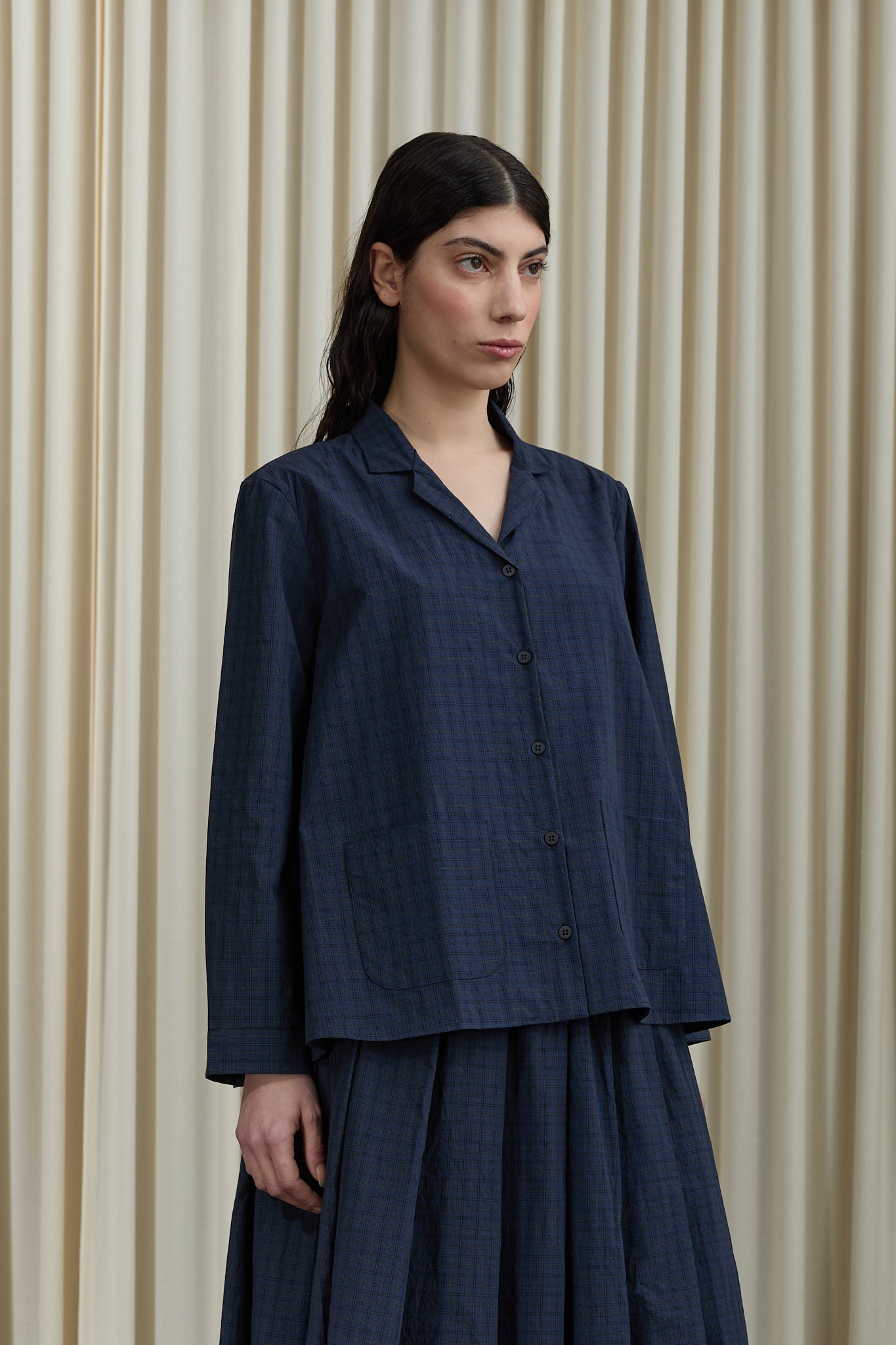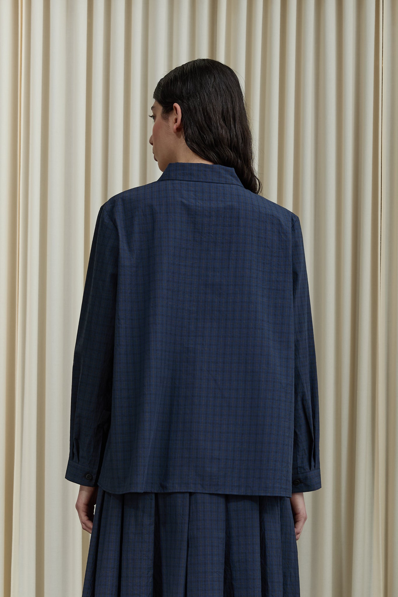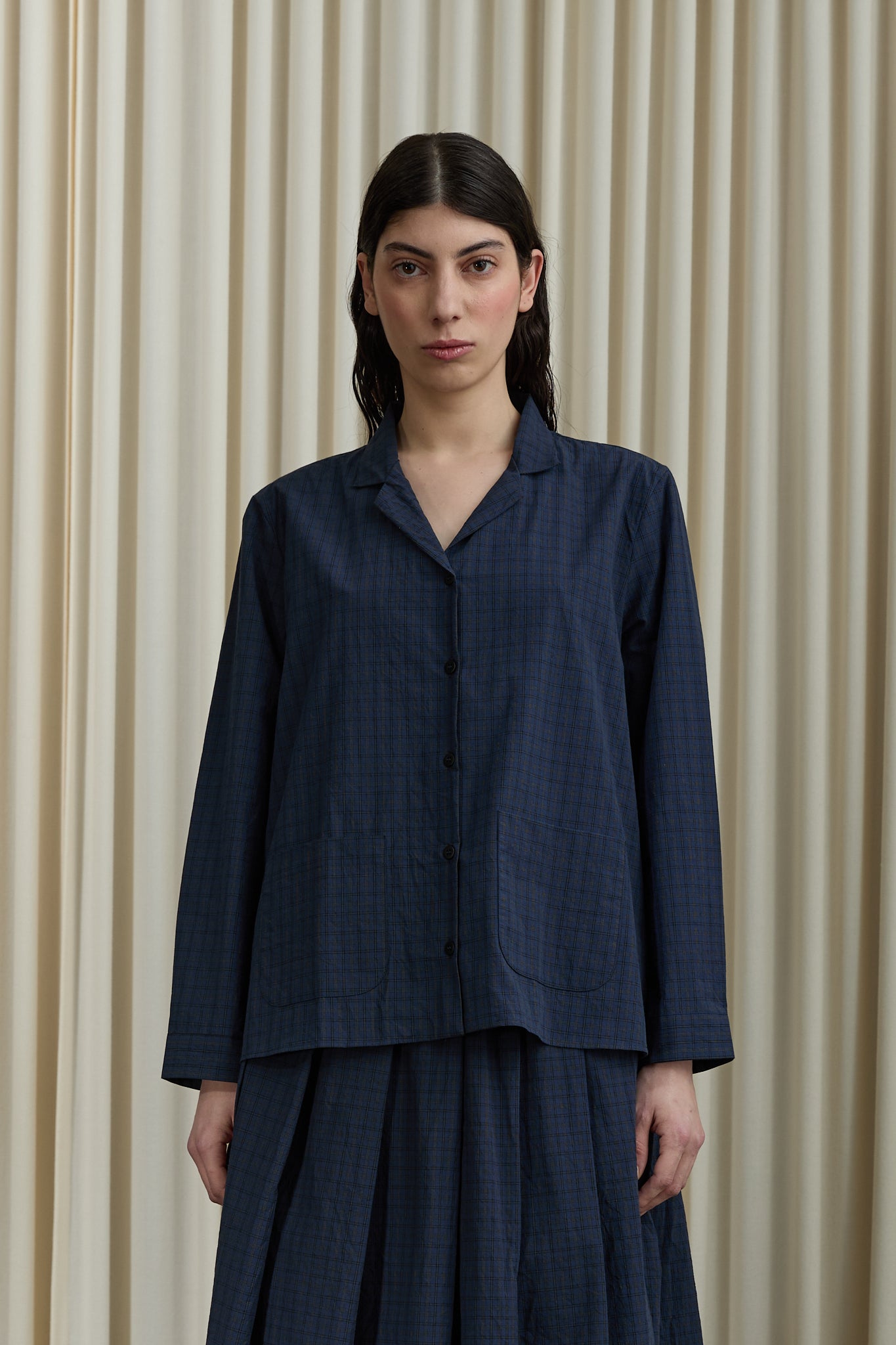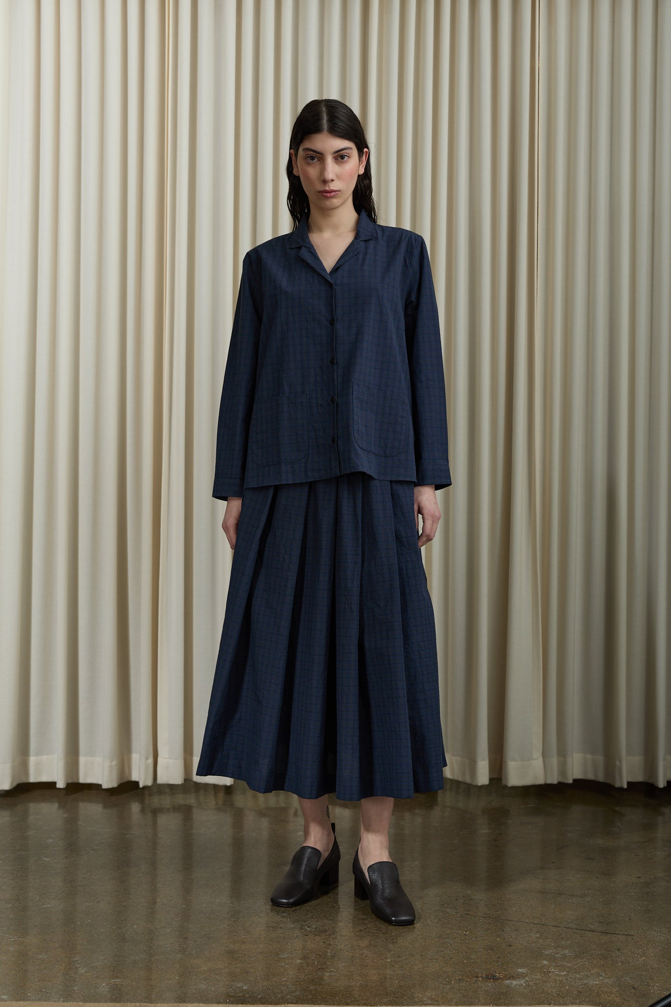 Worn with Berfabel Matilde Skirt in Navy Check and Studio Nicholson Moon Car Shoe in Brown.