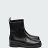 Ankle boots with angular toe shape and stacked heel. Features side zip, heel pull tab, paneled upper, and a Vibram sole.