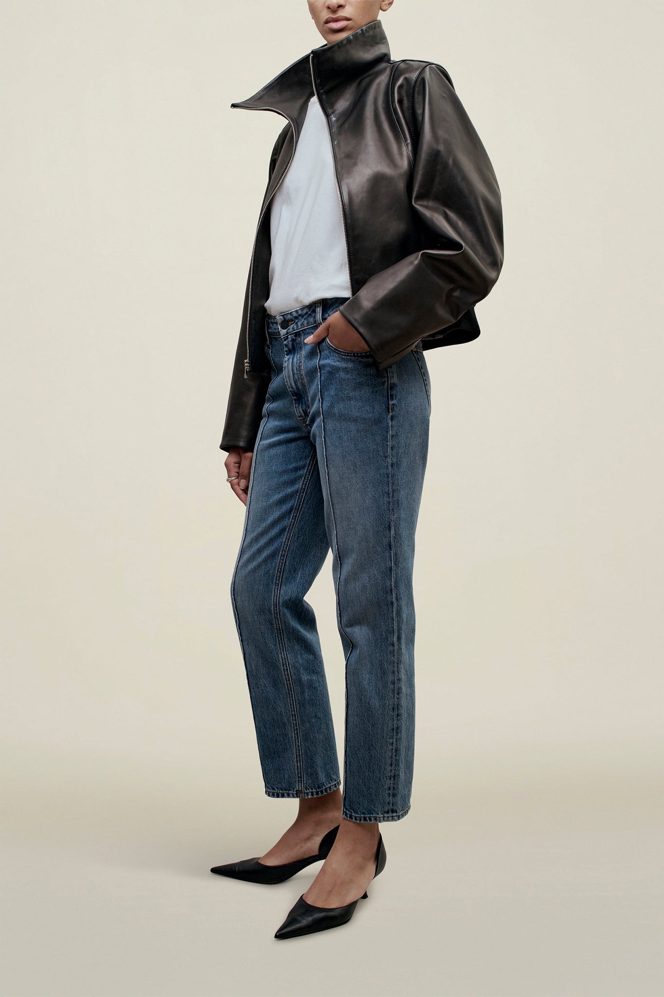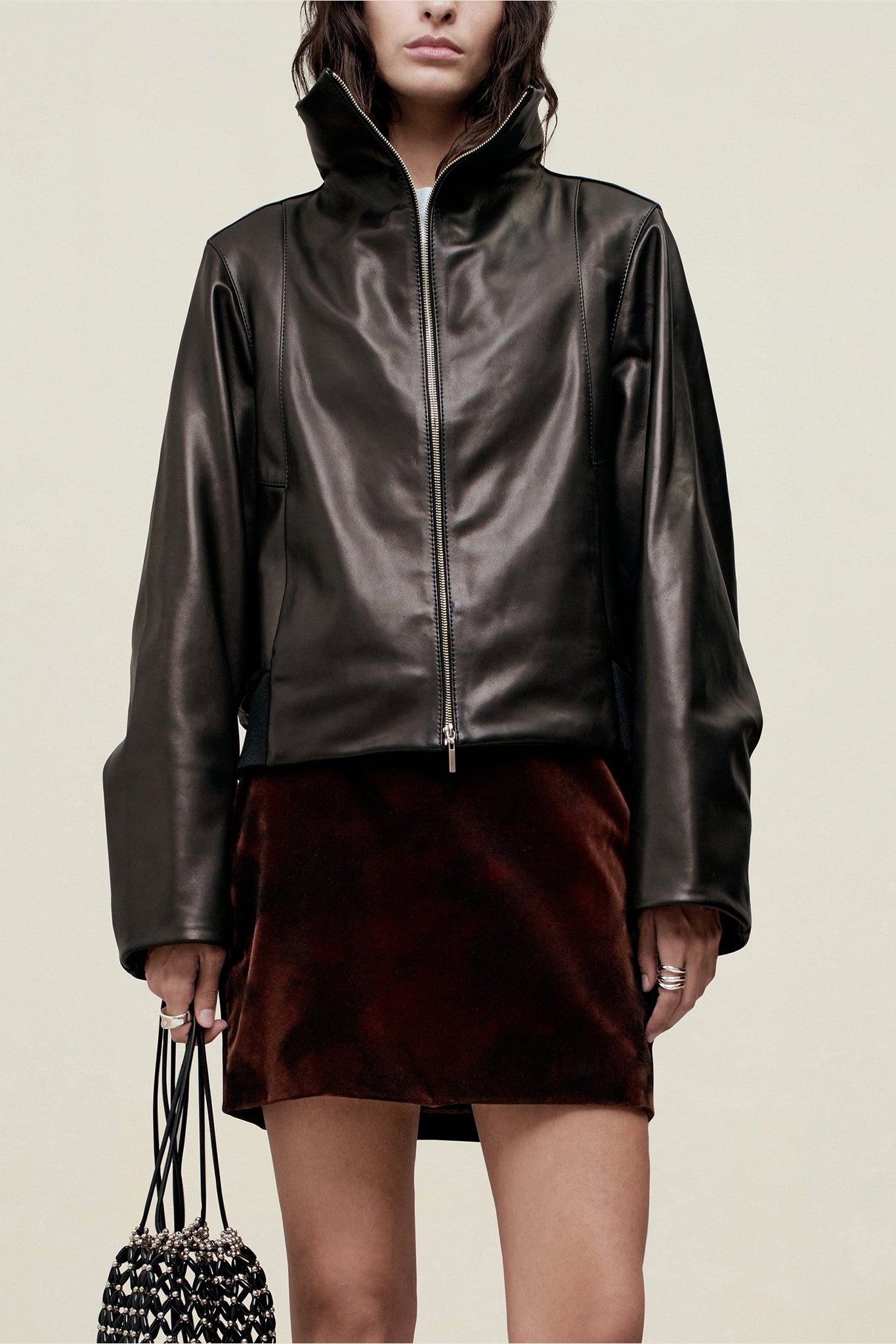 Cropped leather bomber jacket in soft black leather with a relaxed fit. Stand collar, zip front, long sleeves, side pockets, and a ribbed back hem.