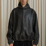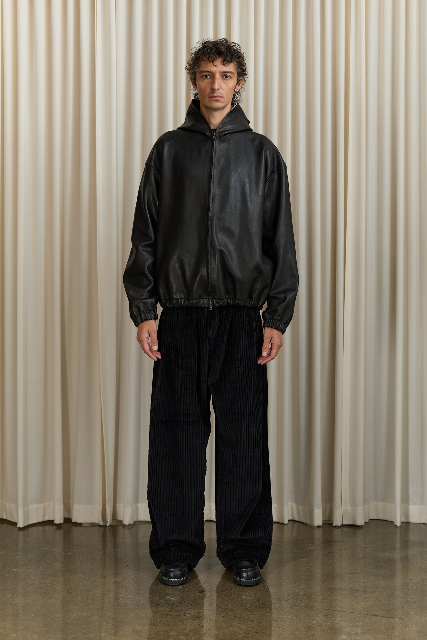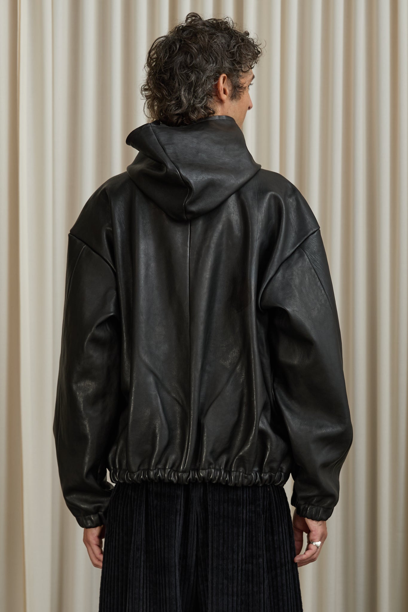 Hooded leather jacket in a relaxed, oversized fit featuring two-way zipper closure, side seam pockets, and gathered cuffs and hem.