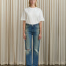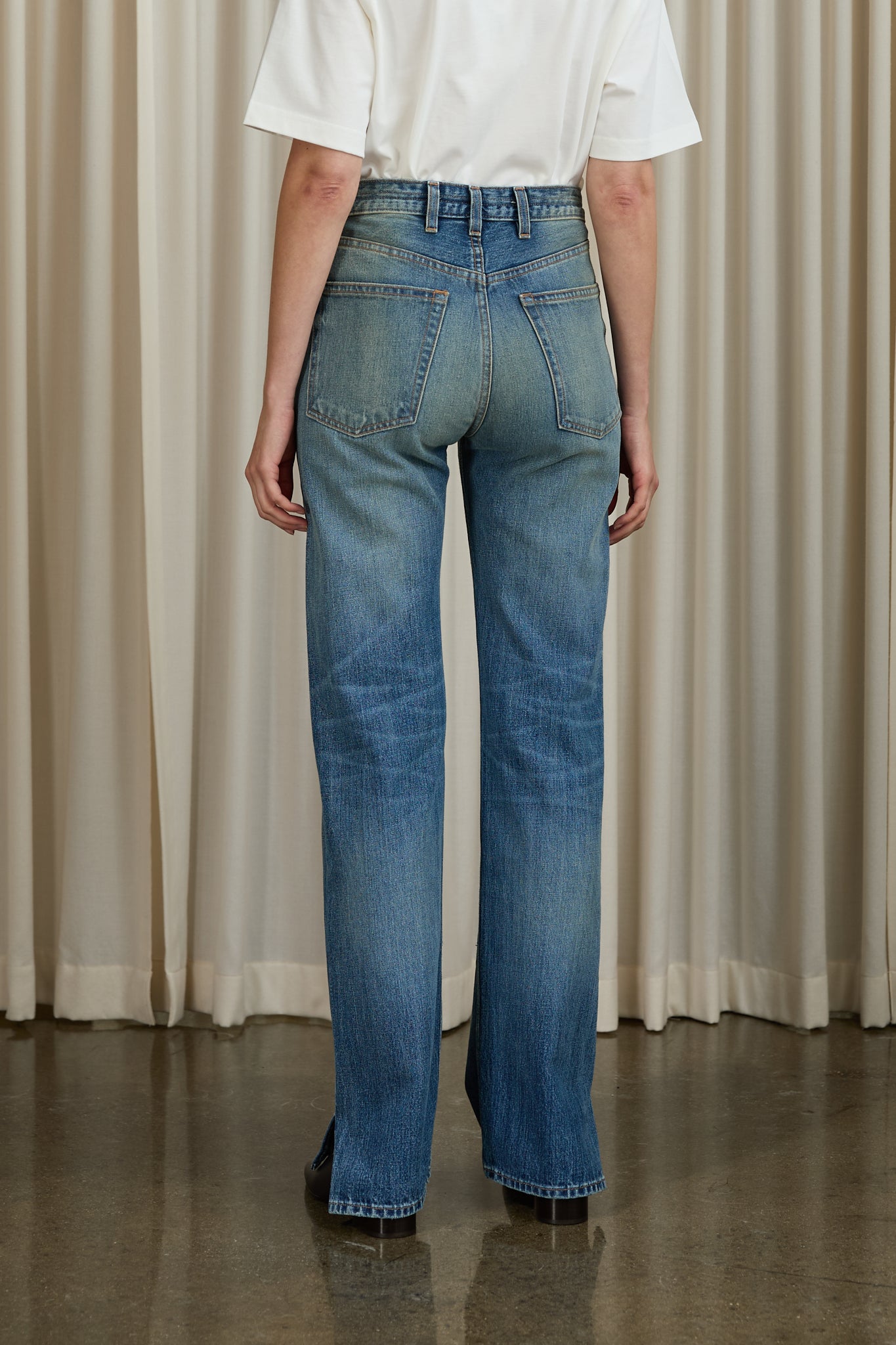 A mid-rise, 5-pocket jeans in a vintage wash. Sculpted tightly through the waist, hip and thigh, then open out to a slim straight leg shape. Finishes by hand with semi-precious gold hardware in 60% recycled brass and 100% stainless steel tacks from Italy.