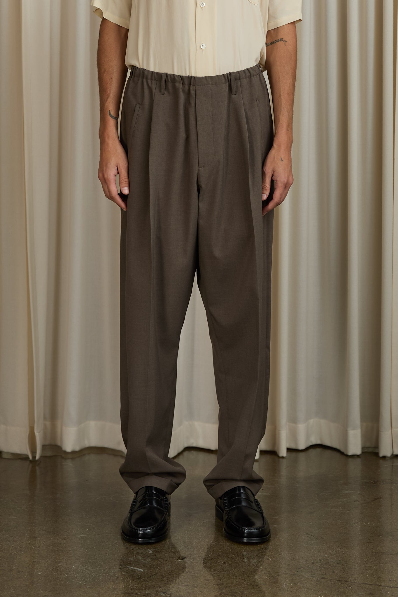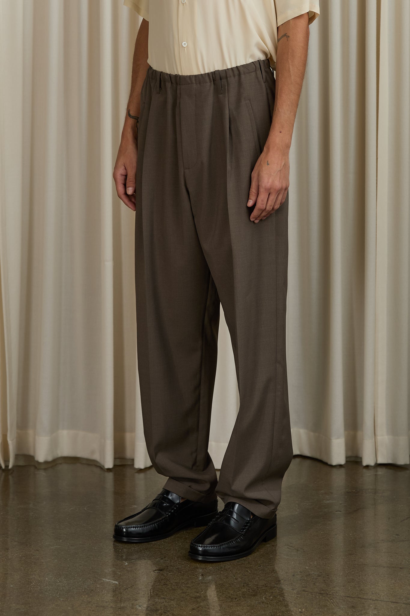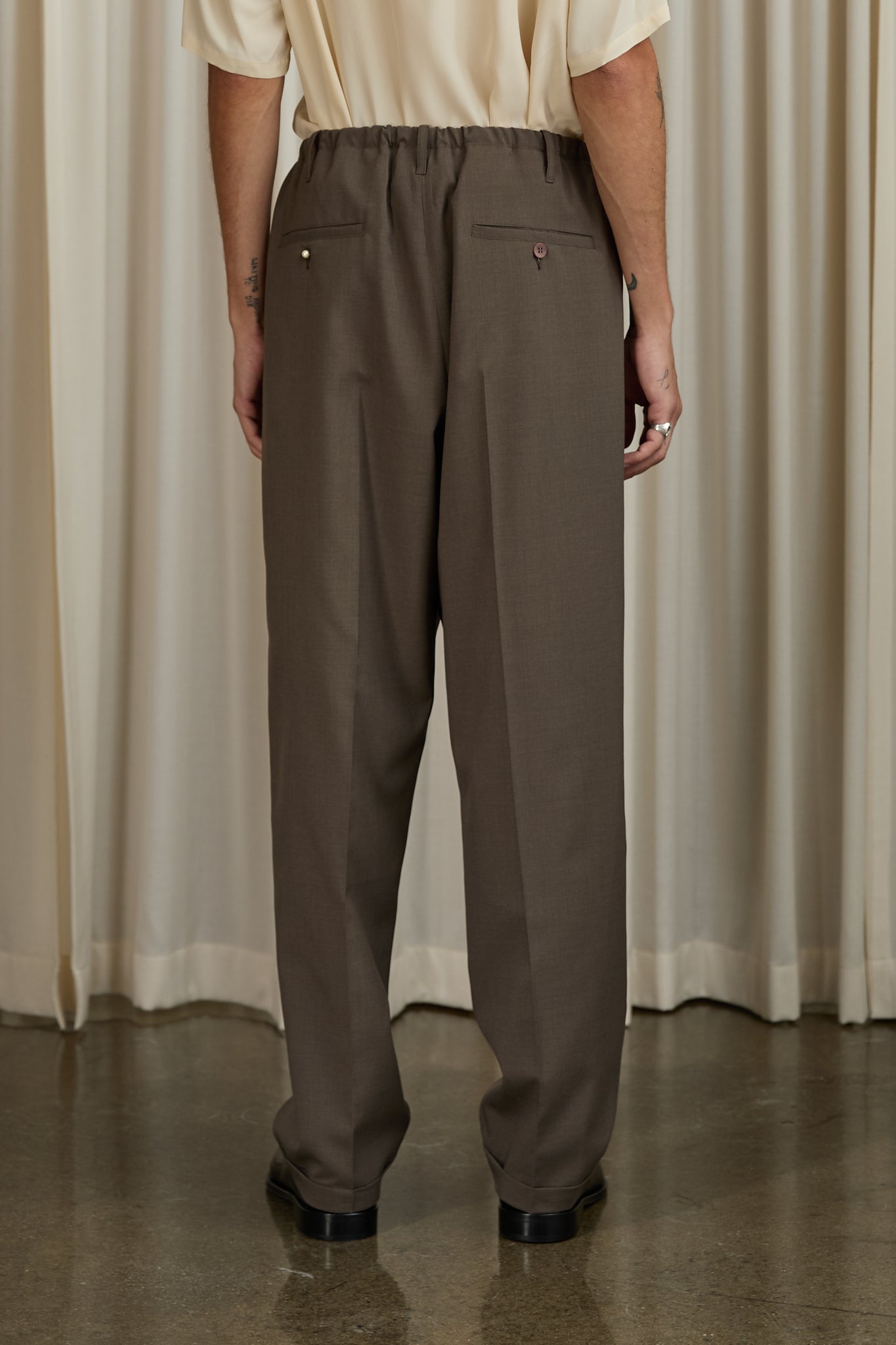 Tailored mid-rise straight-leg trousers in twill with front pleat detailing. Features elasticated waistband, belt loops, and two rear button-fastening pockets with signature mother-of-pearl detail.