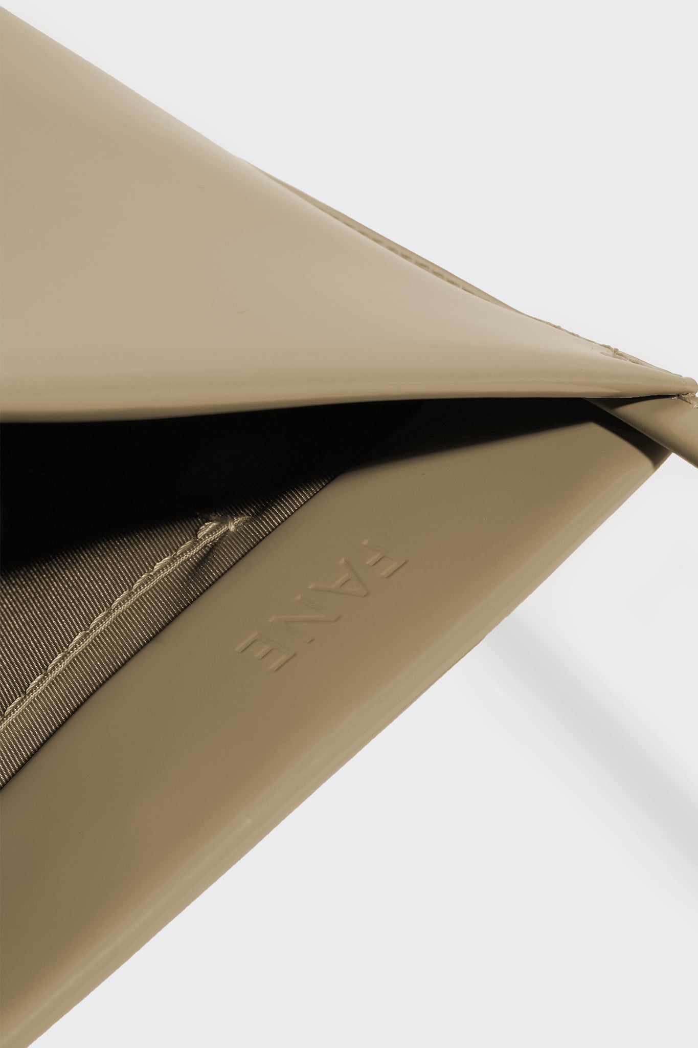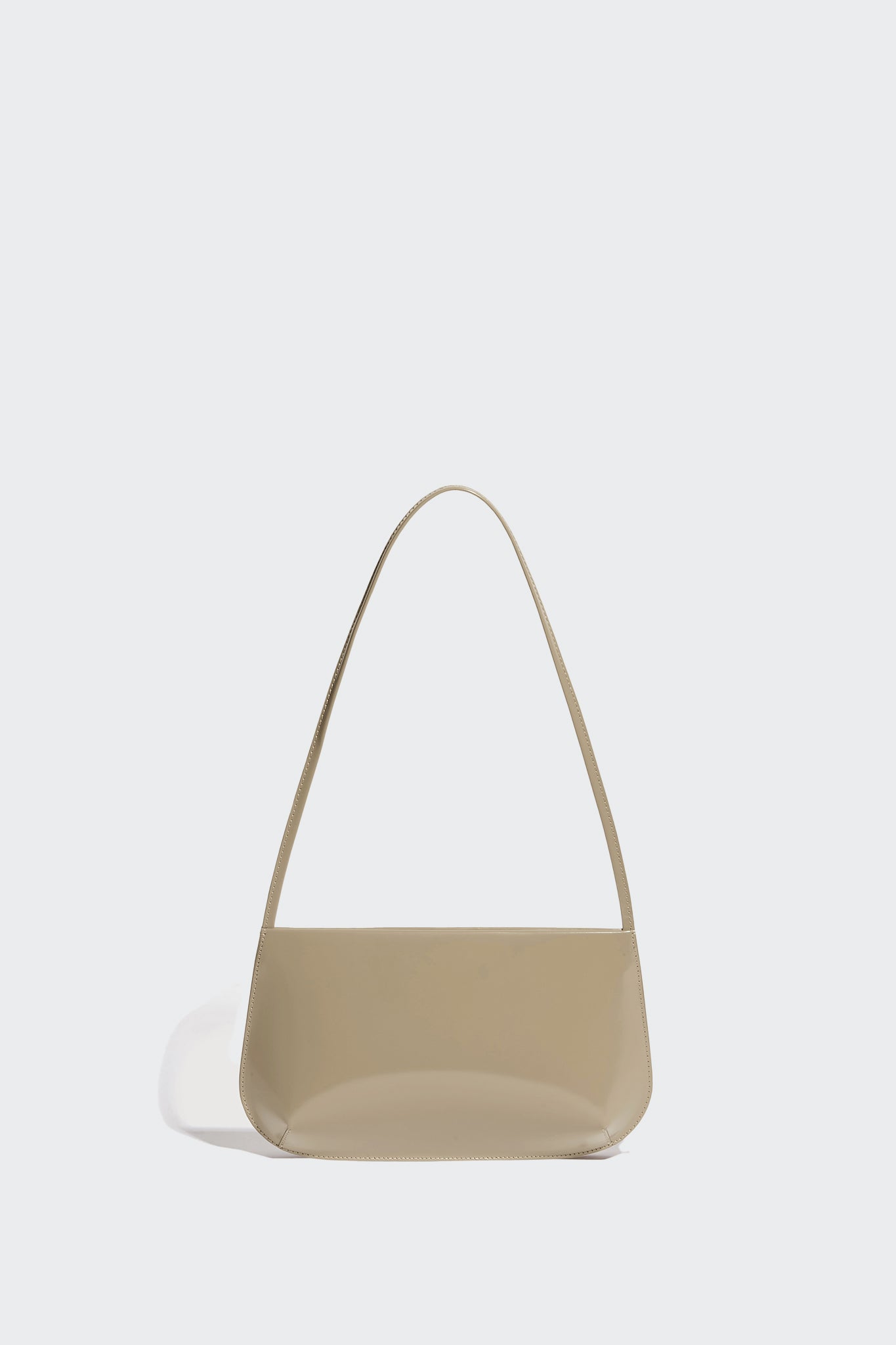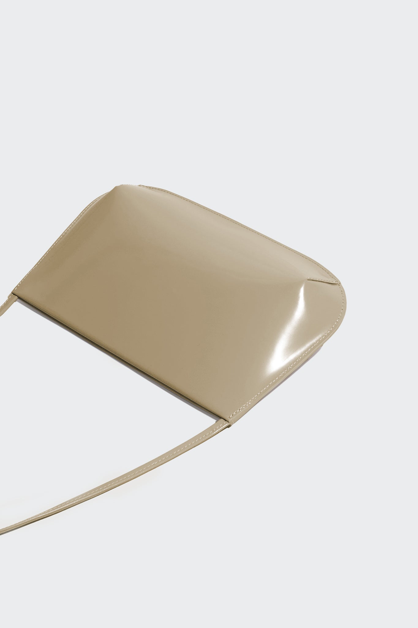 Shoulder bag with a slim, ribbon-like strap featuring magnetic closure and inner pocket.