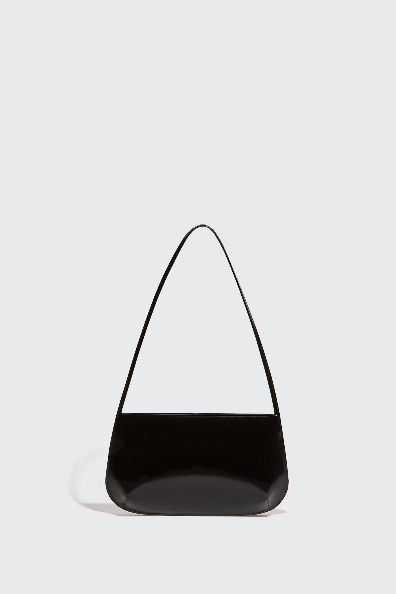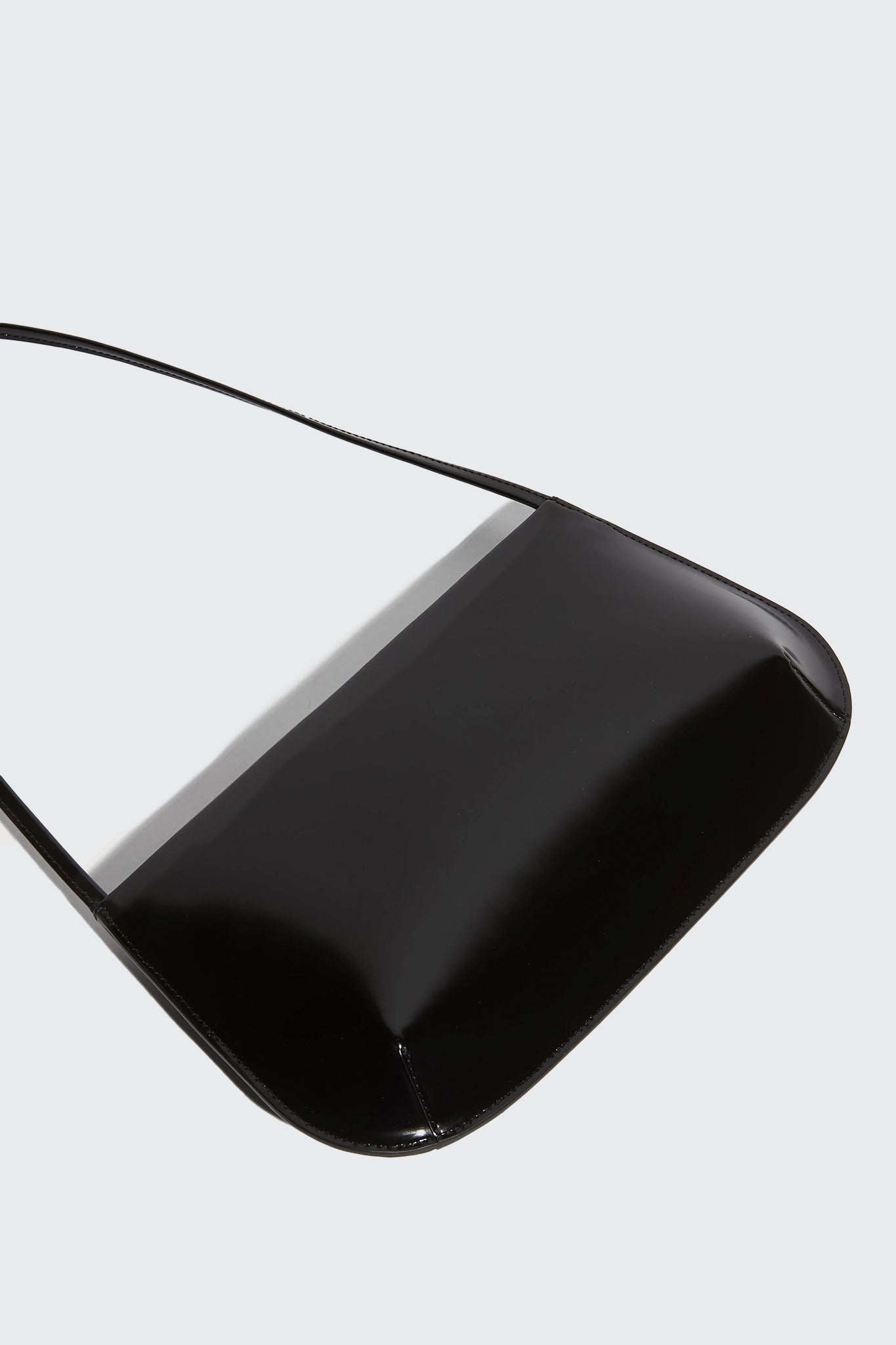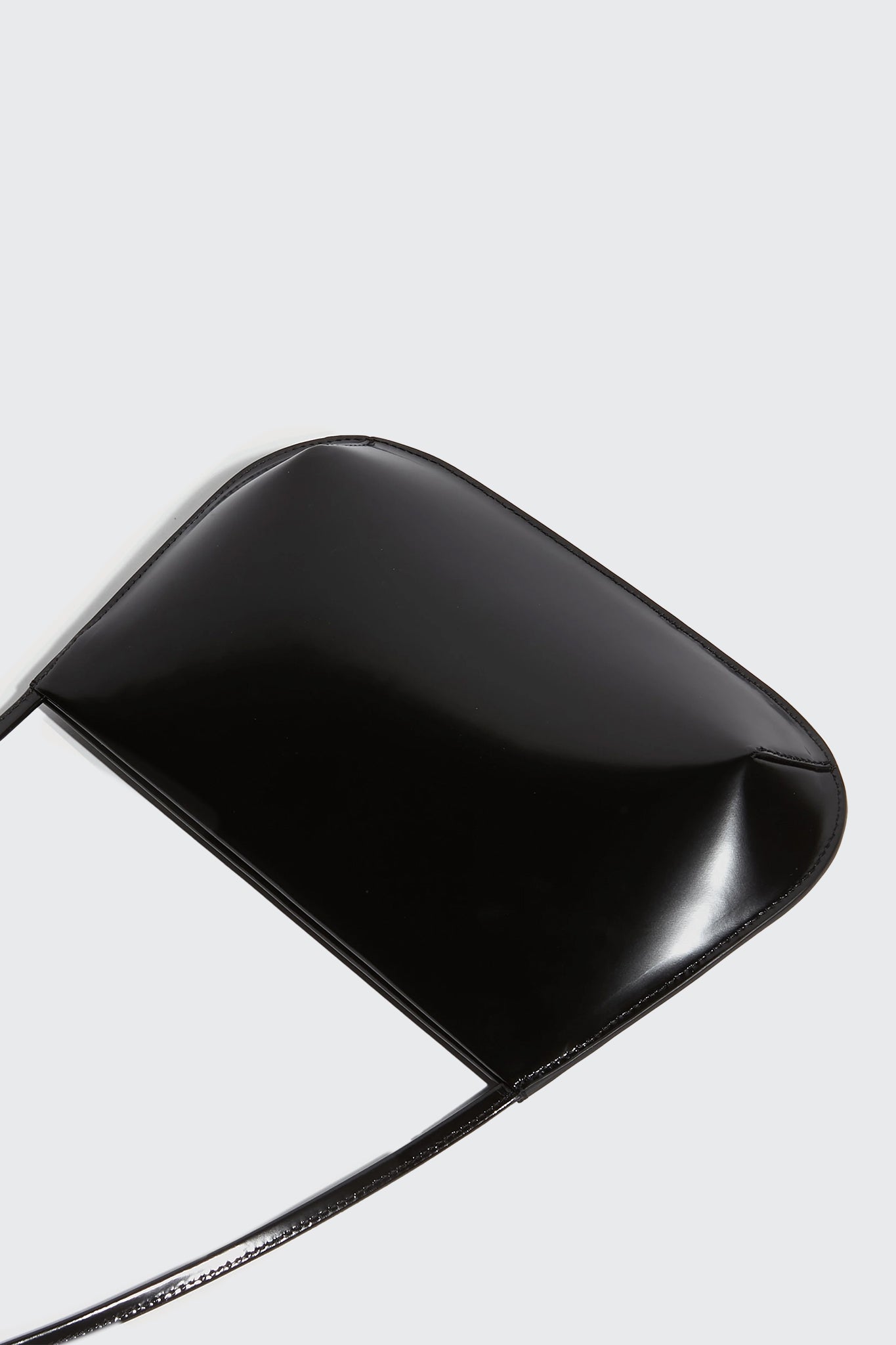Slim shoulder bag in spazzolato leather with a slim, ribbon-like strap featuring magnetic closure and inner pocket.