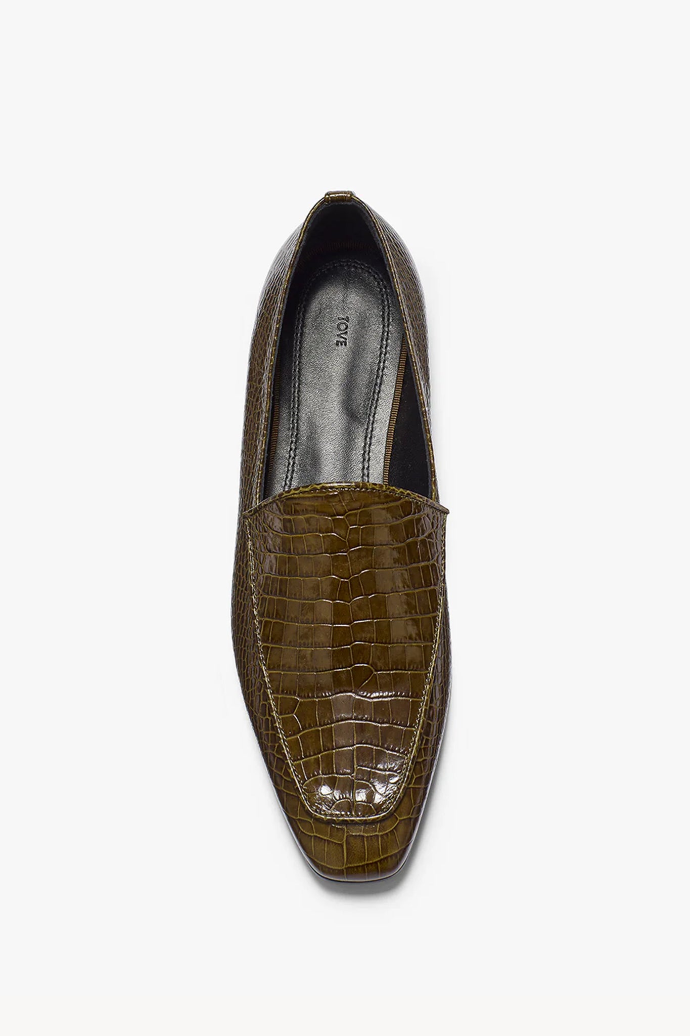 Slim-profile loafers in embossed crocodile design leather. Features raised aprons and almond toes.