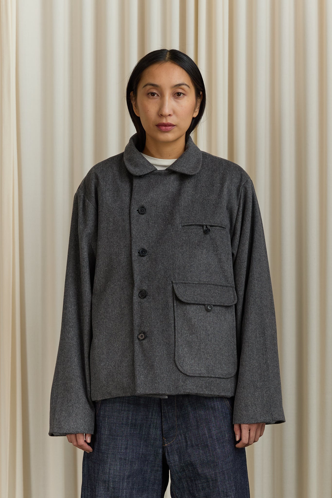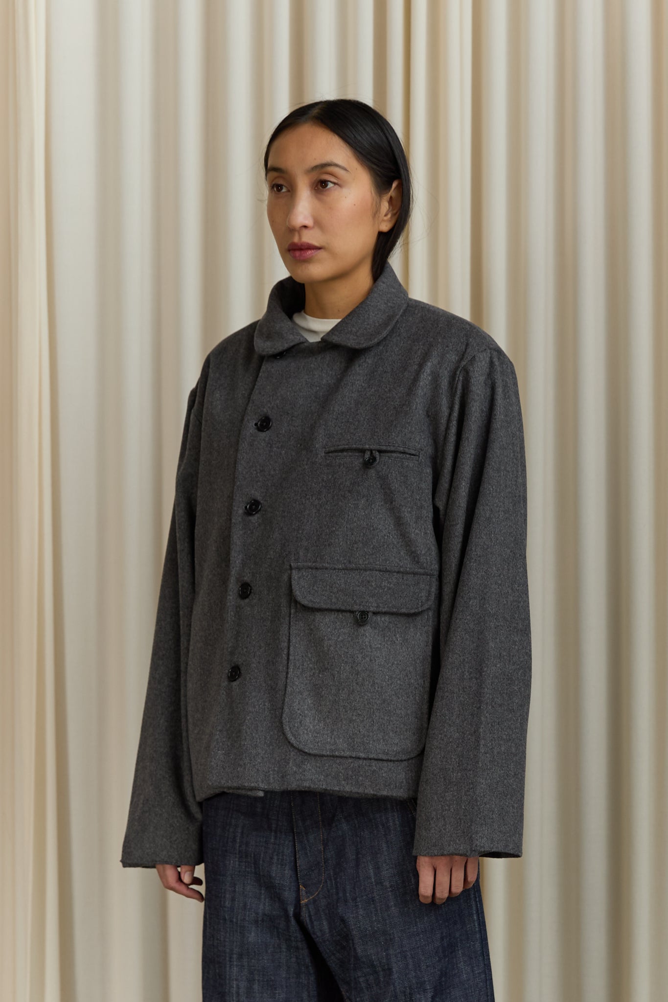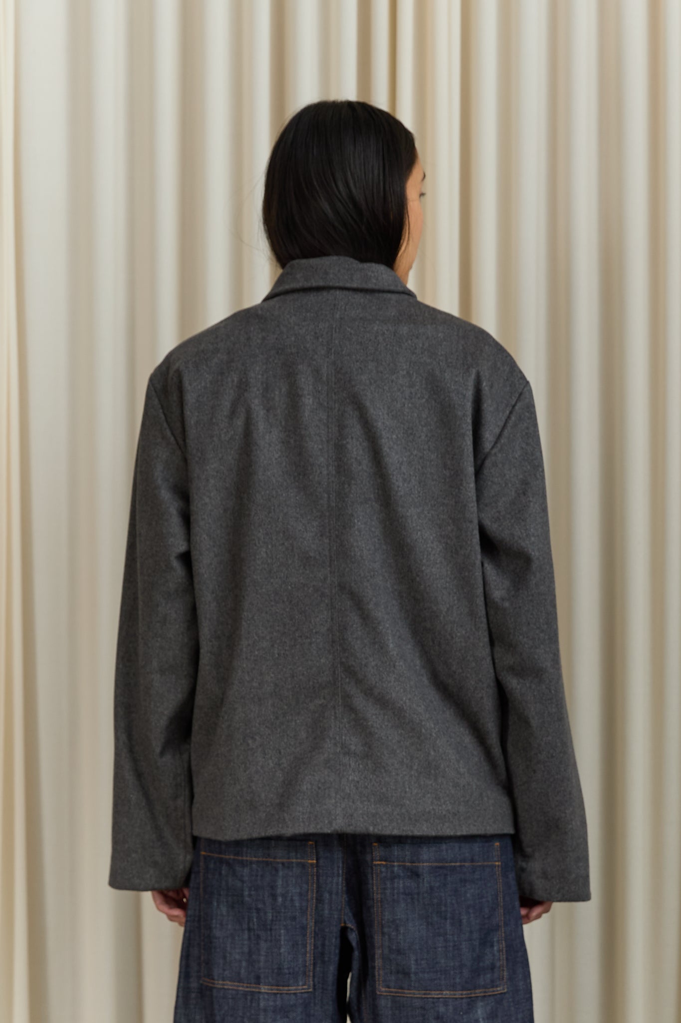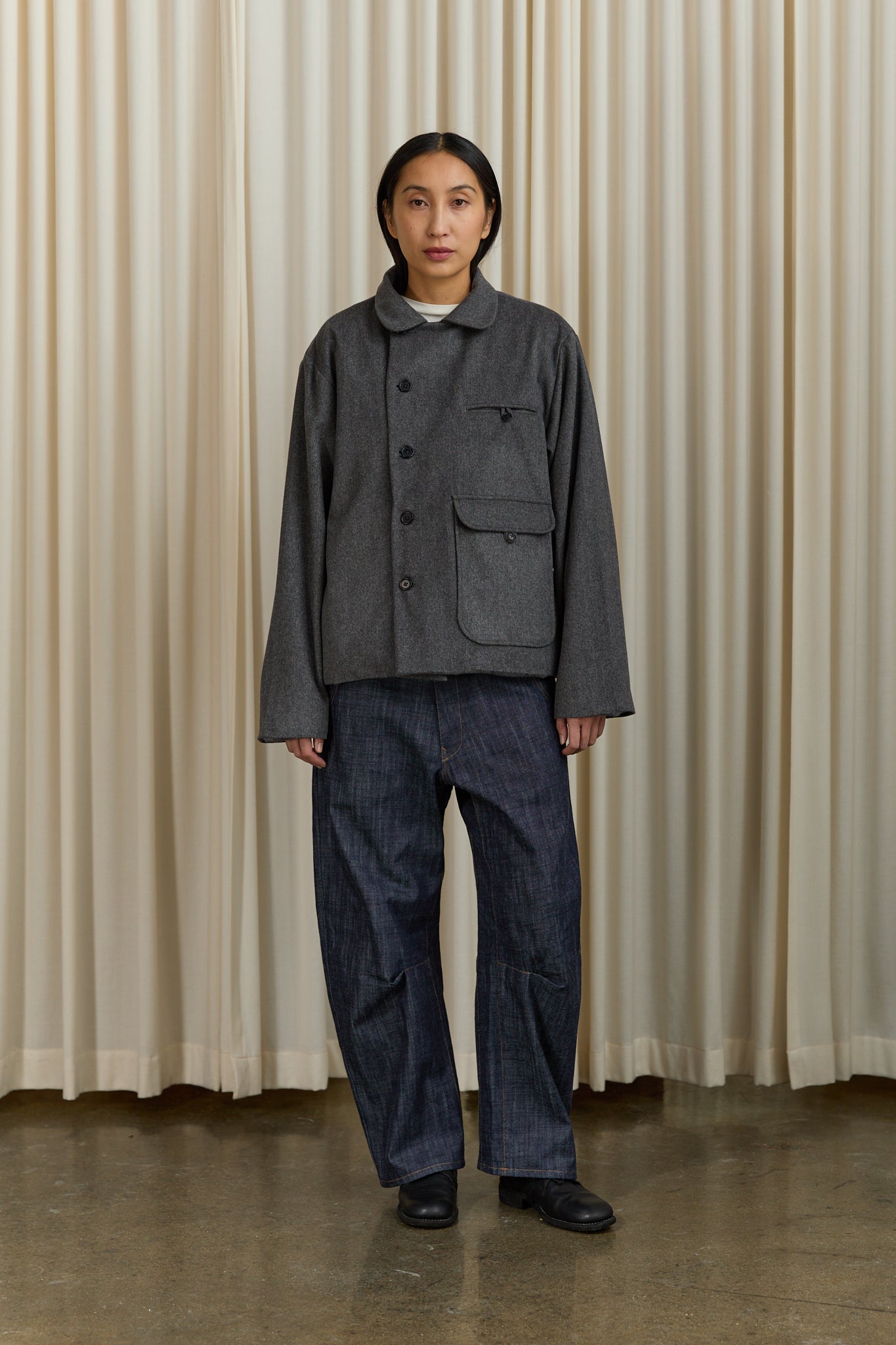 Boxy, slightly cropped jacket with asymmetrical corozo button closure. Featuring a double welt pocket with button loop closure on the left chest, a rounded patch pocket on the lower left front, hidden side seam pockets with bartacking for reinforcement. Fully lined with a brushed cotton twill.