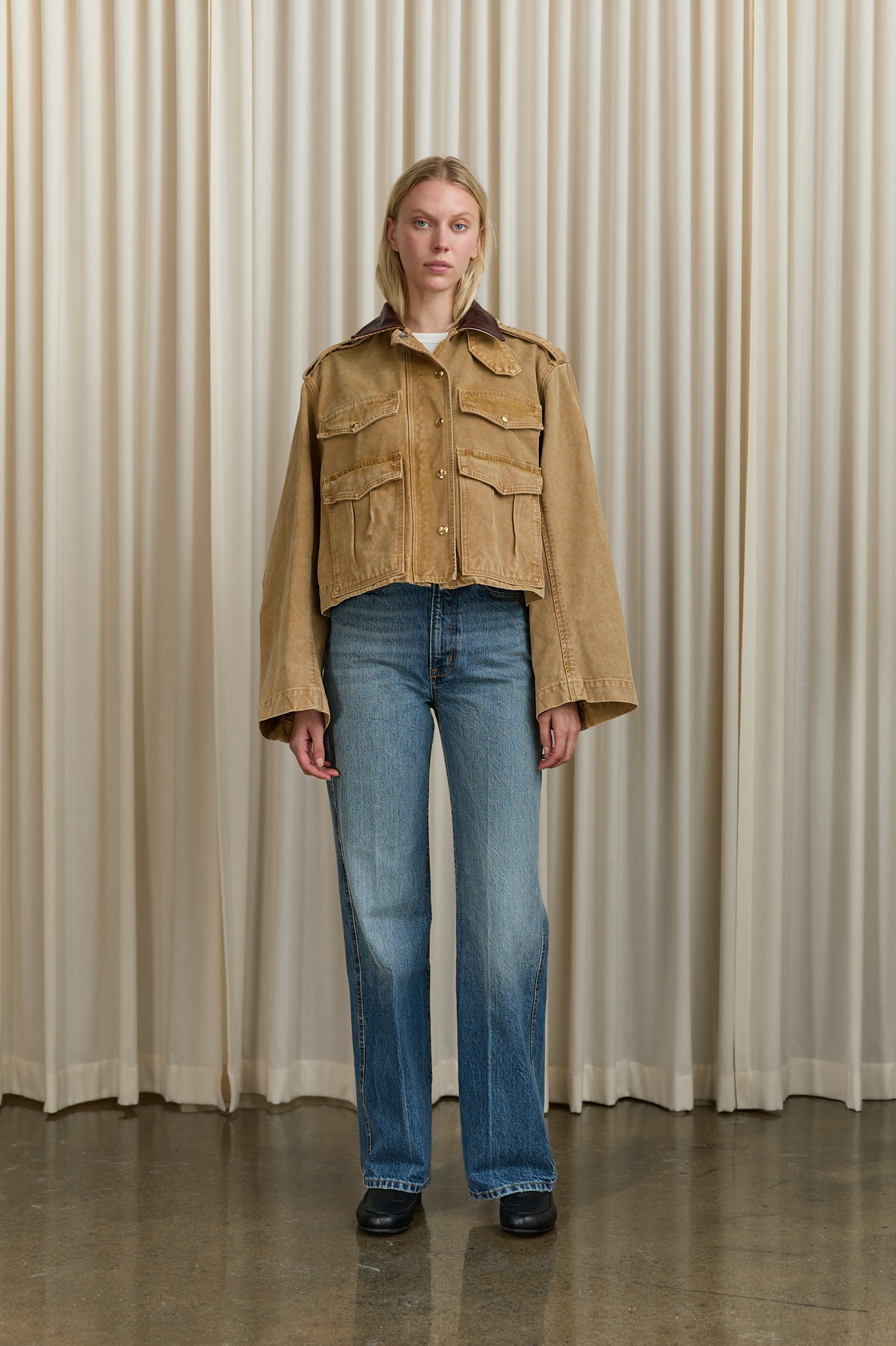 Mid-weight cotton canvas jacket with exaggerated sleeve shape and drop shoulder. Features two-way zipper with branded snap closure, leather collar and signature gold branded RÙADH hardware details.