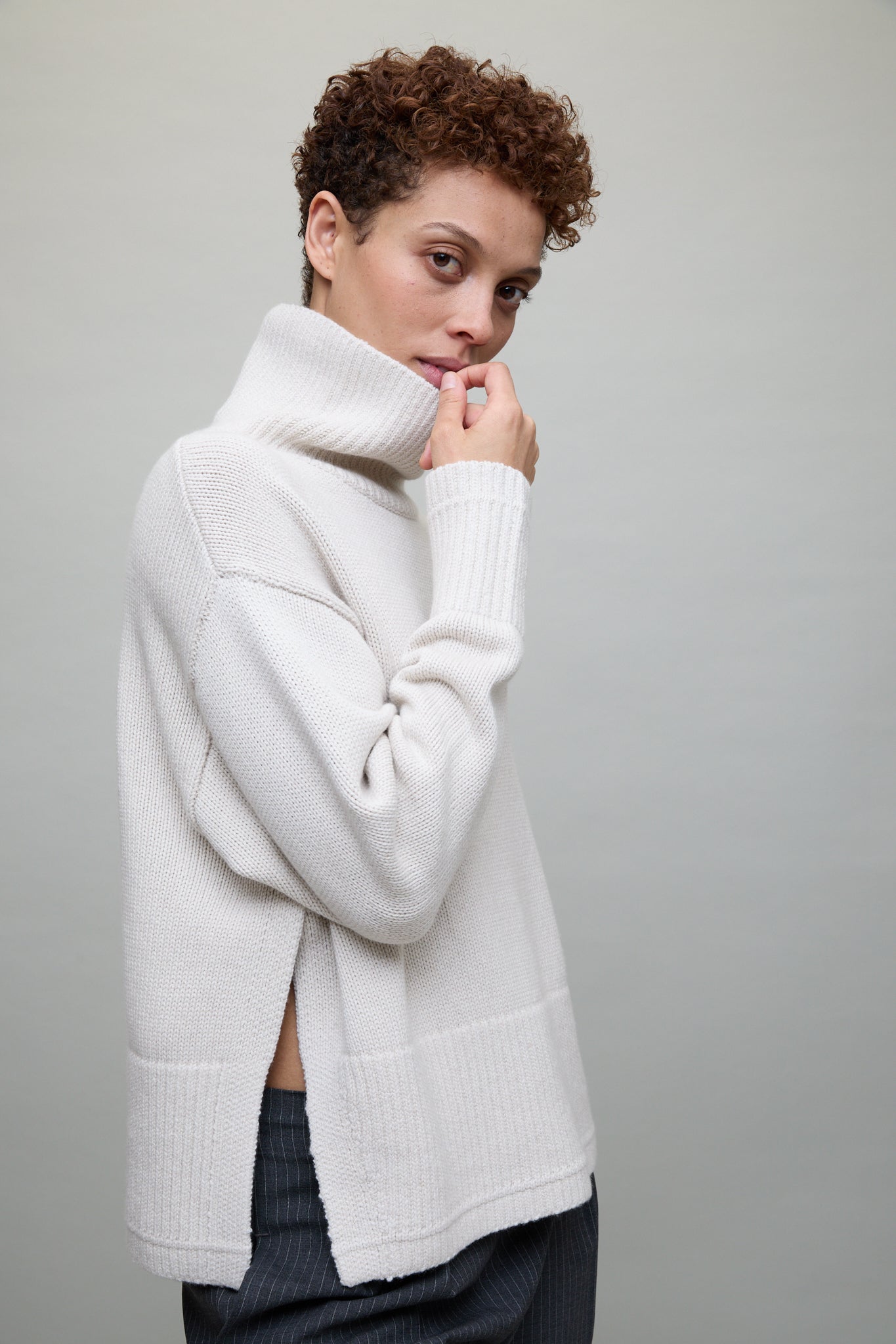 Mock neck sweater designed with an oversized fit and high slits at the side seams. Completed with a wide rib-knit finish at hem and sleeves in a recycled cashmere blend.