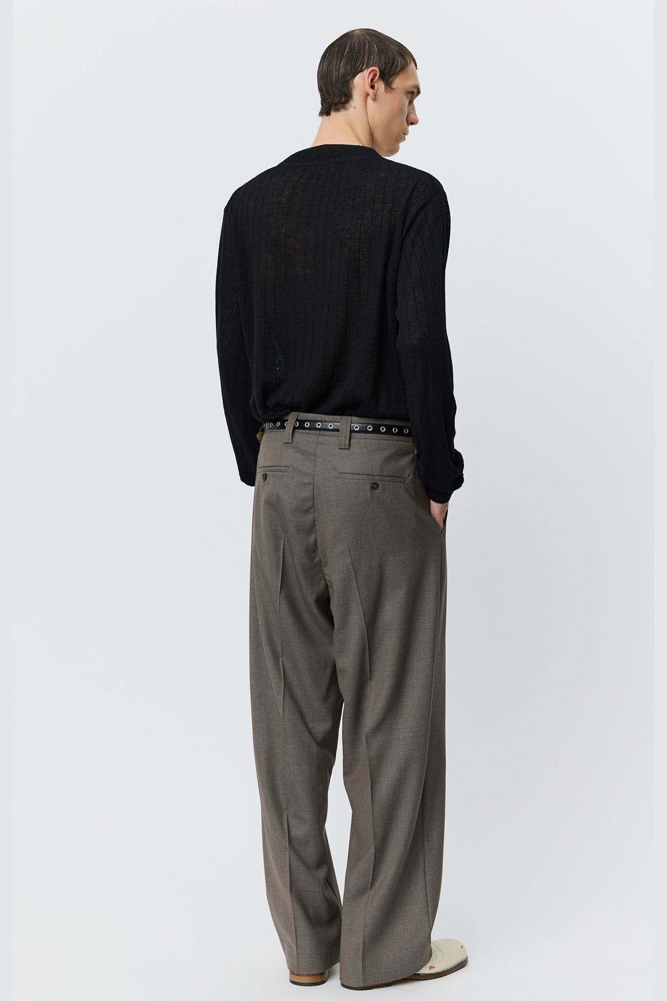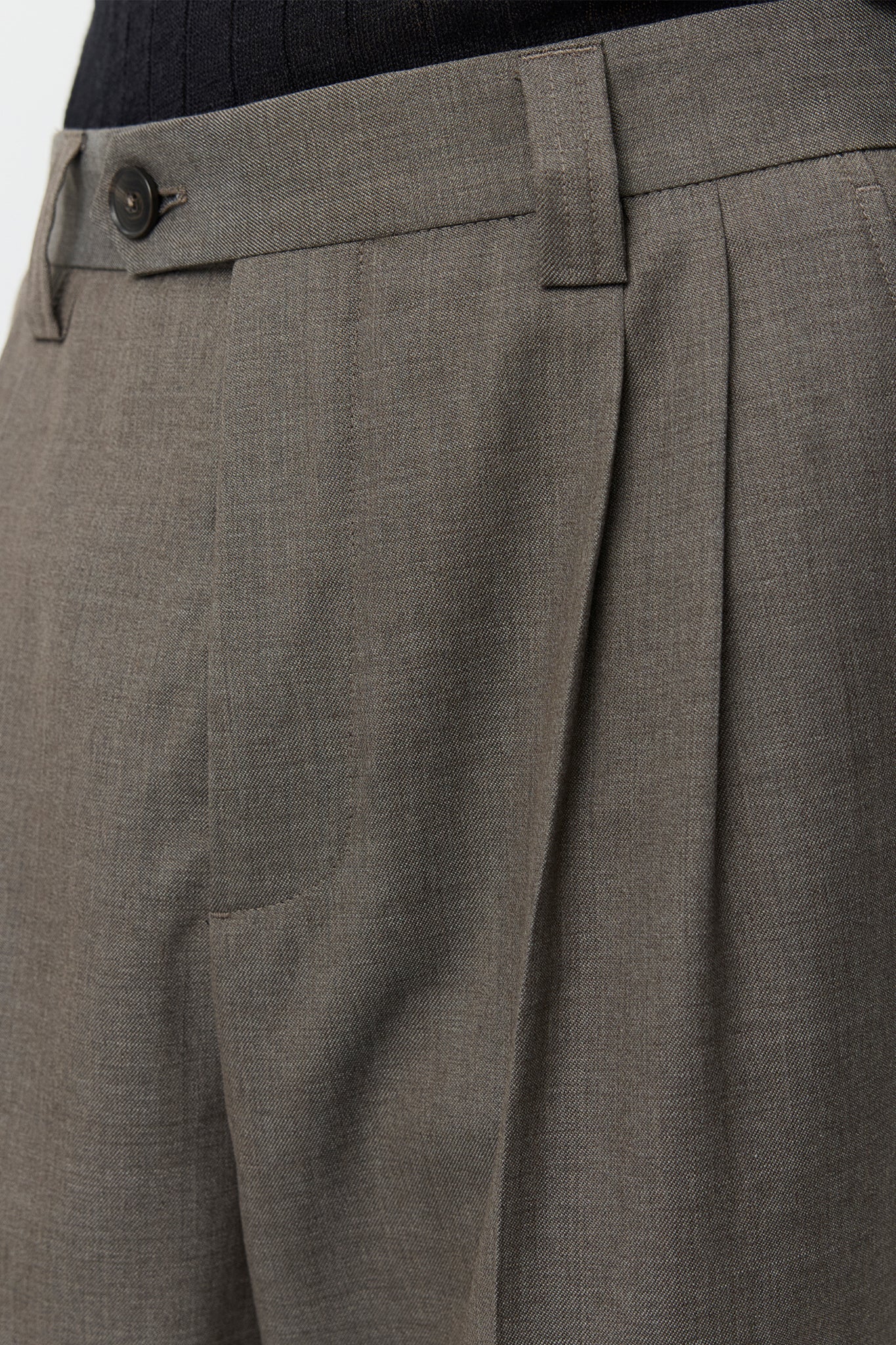 Mid-rise, wide straight leg trousers with double pleats in wool twill. Featuring side pockets, rear welt pockets, button fastening, hook-and-eye closure and YKK zip fly.
