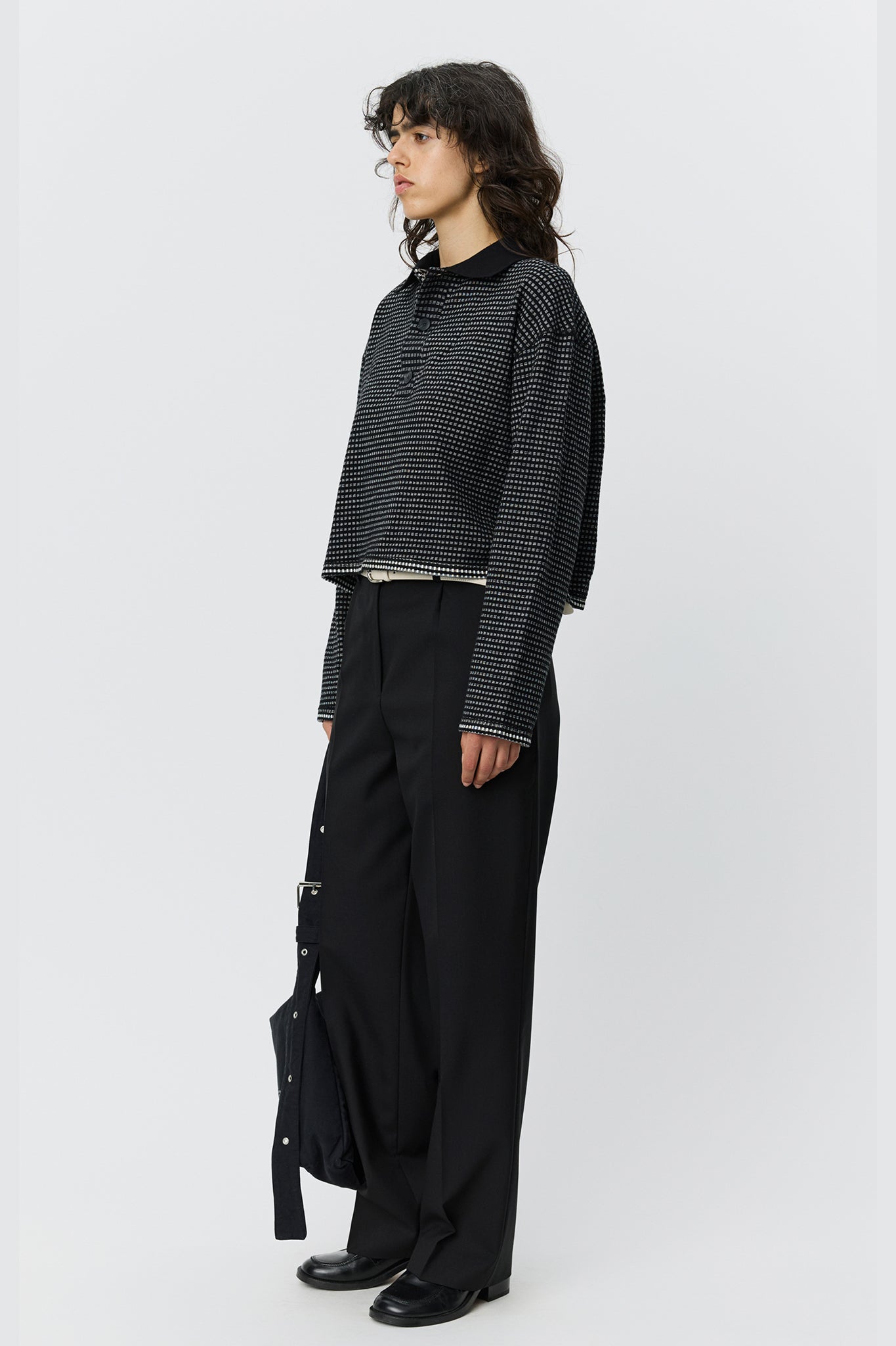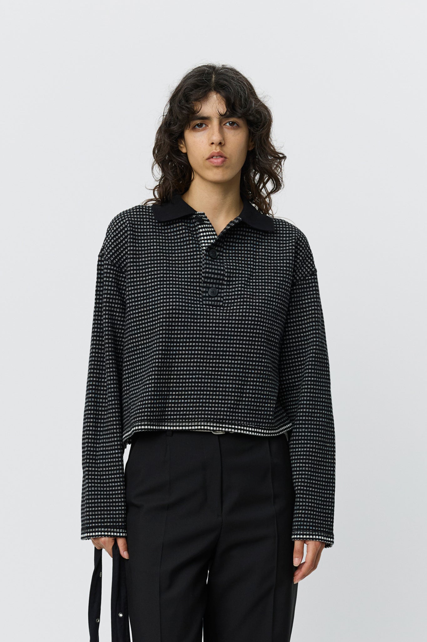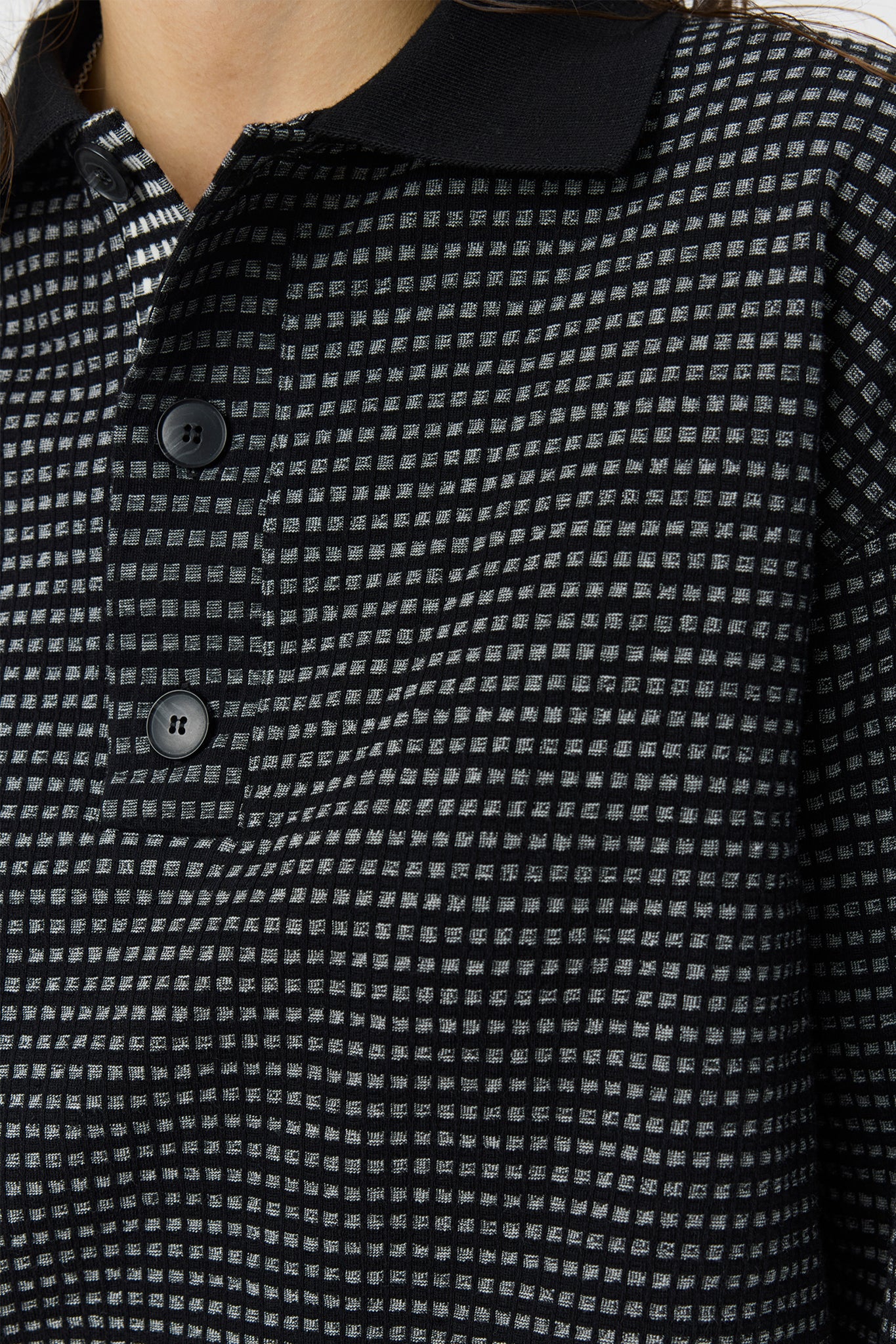 Knitted polo shirt in a soft, lightweight jacquard cotton jersey. Featuring a 3-button placket, drop shoulders, reversed flatlock seams and inside out cuffs and hem.