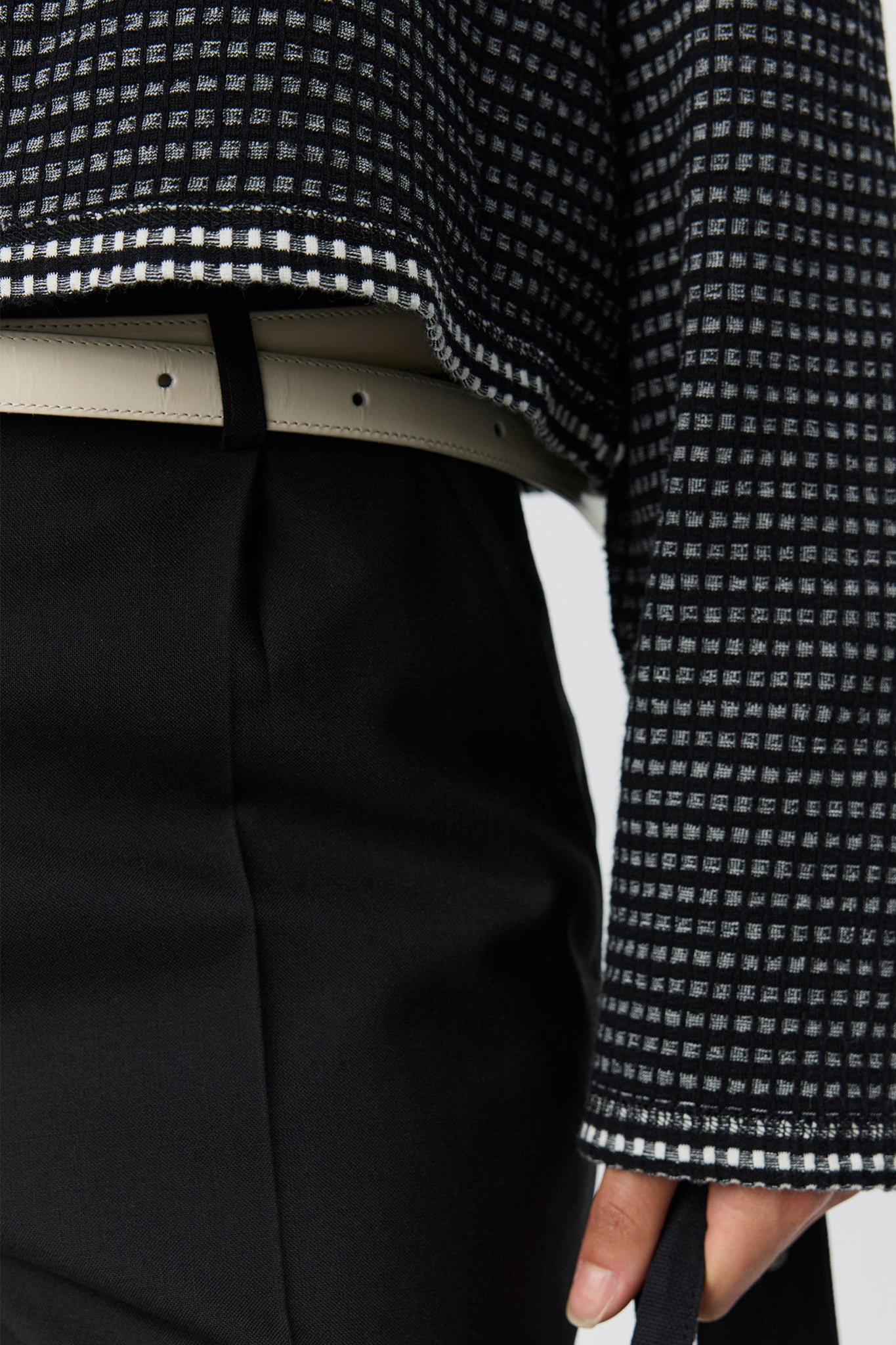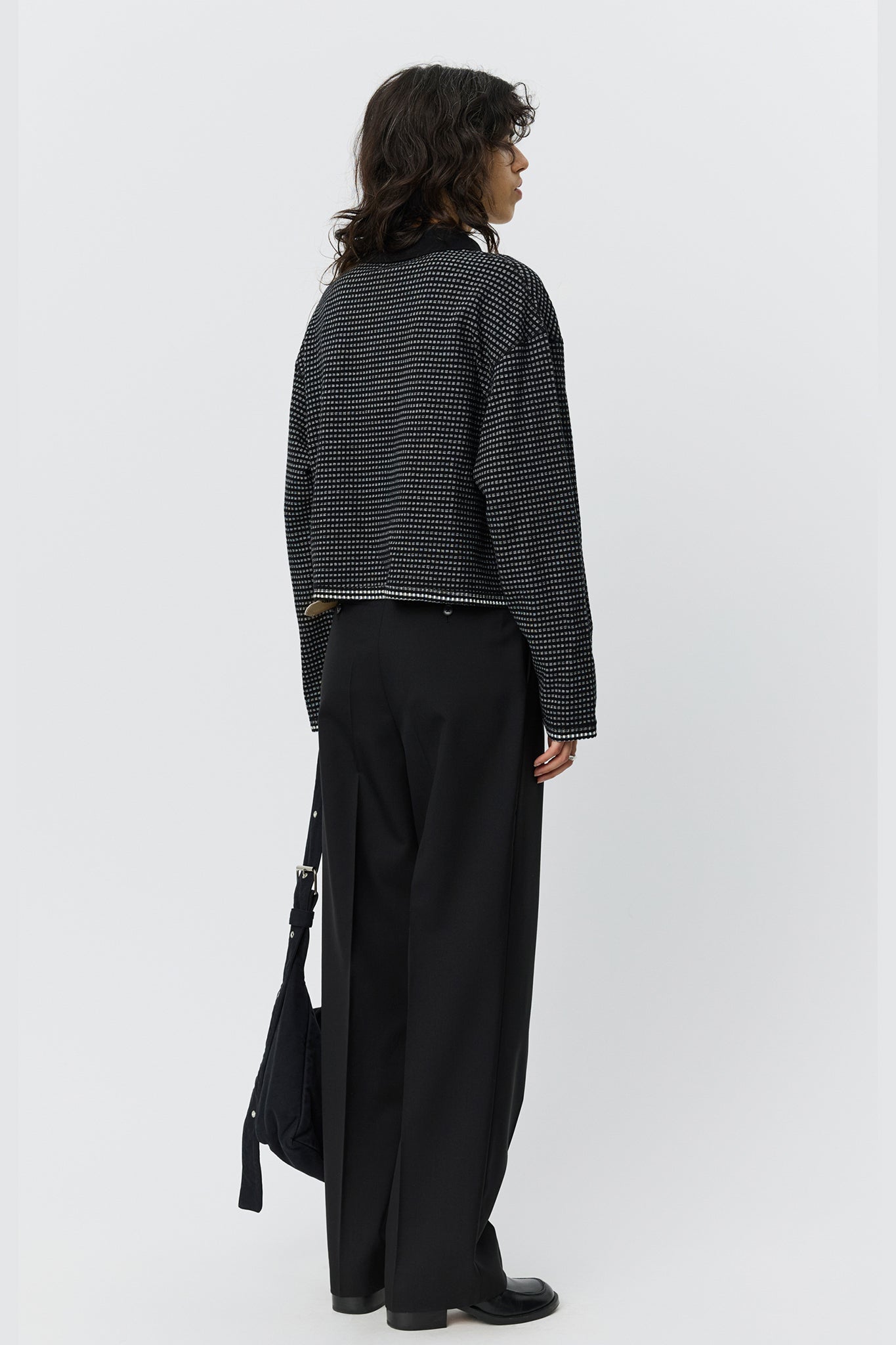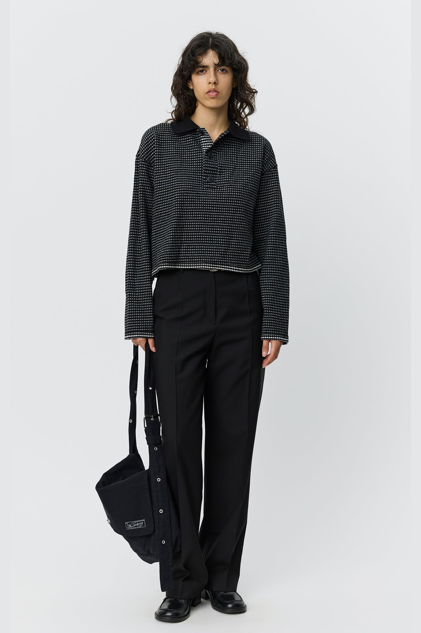 Knitted polo shirt in a soft, lightweight jacquard cotton jersey. Featuring a 3-button placket, drop shoulders, reversed flatlock seams and inside out cuffs and hem.