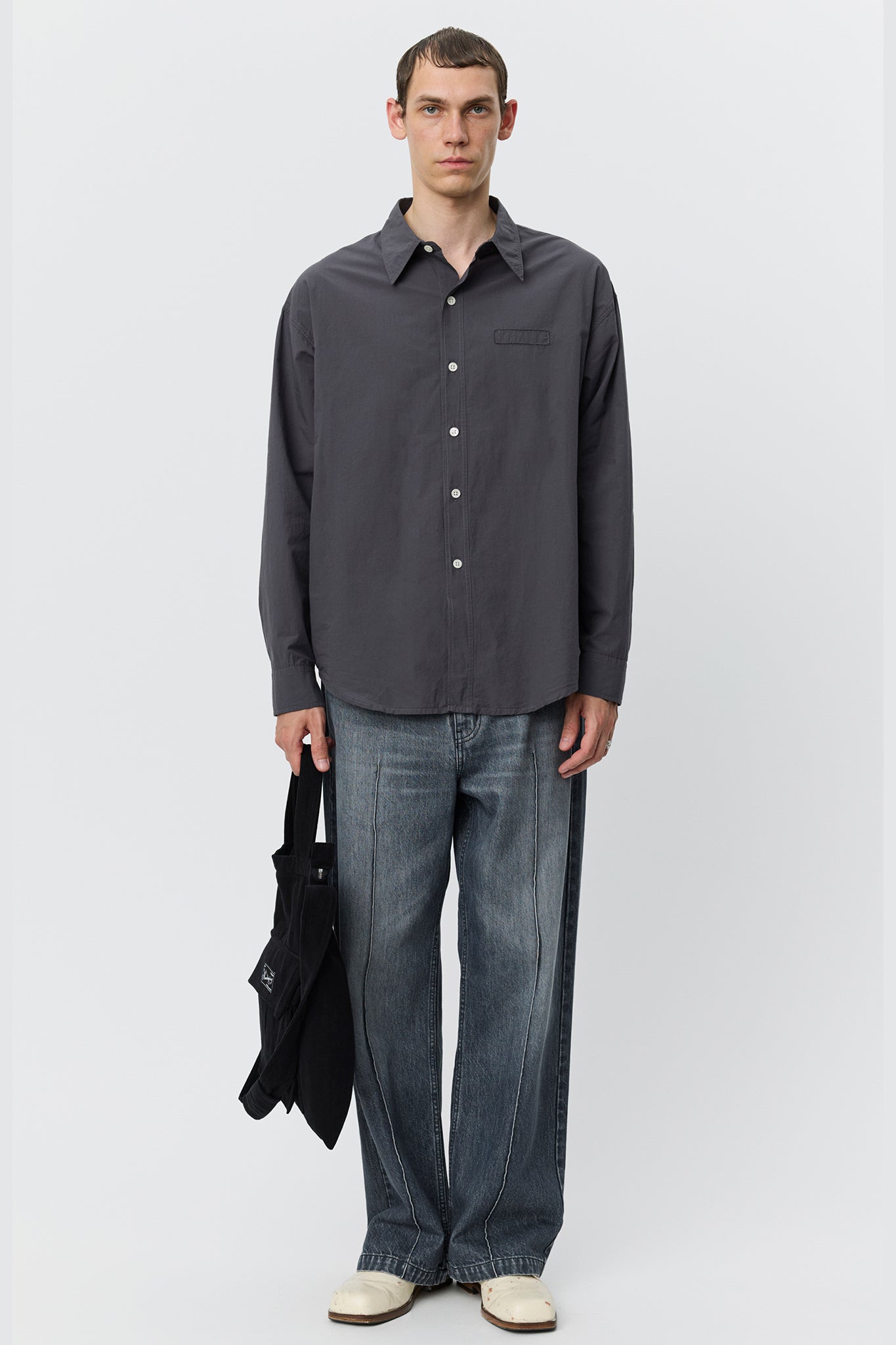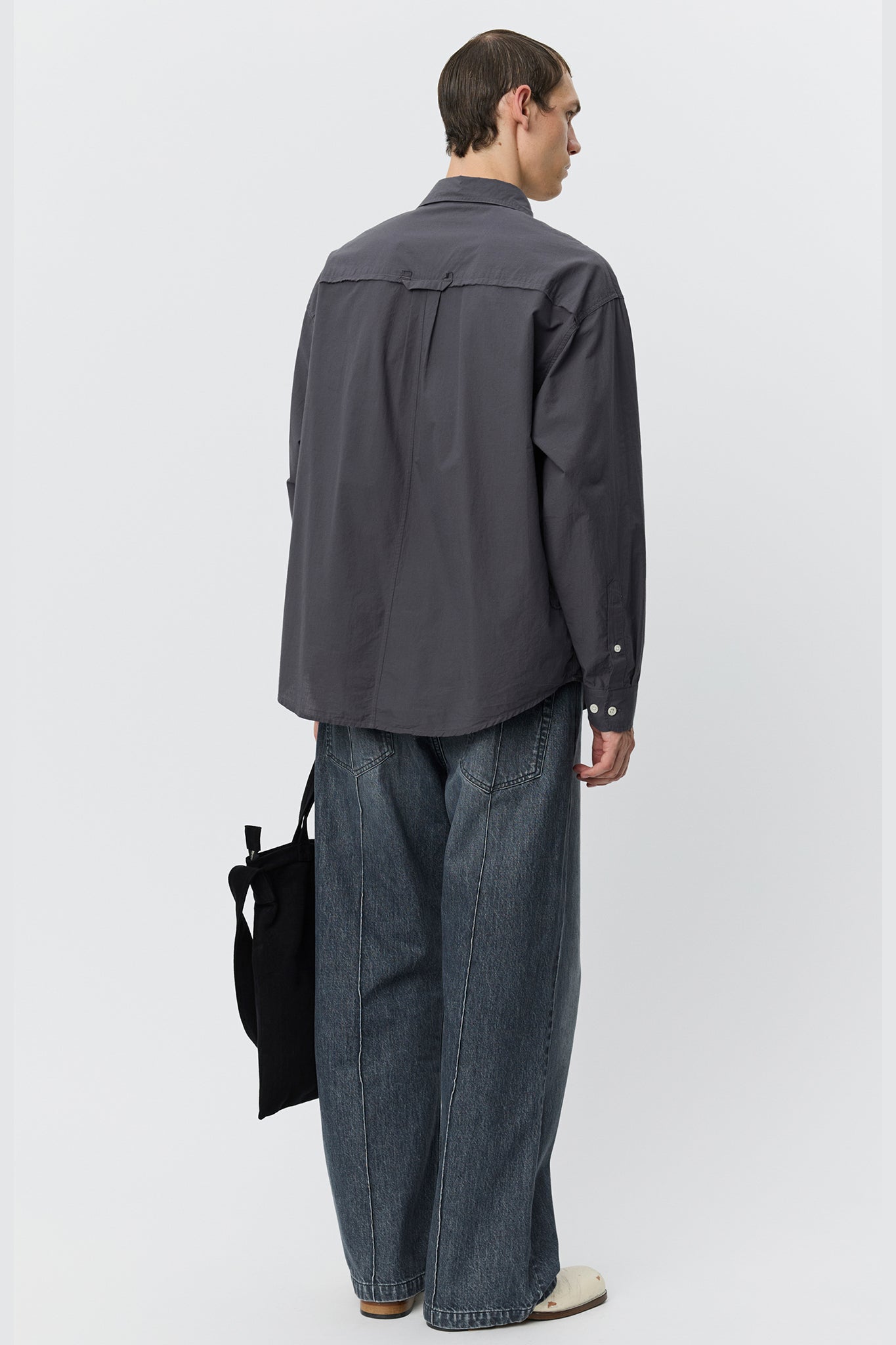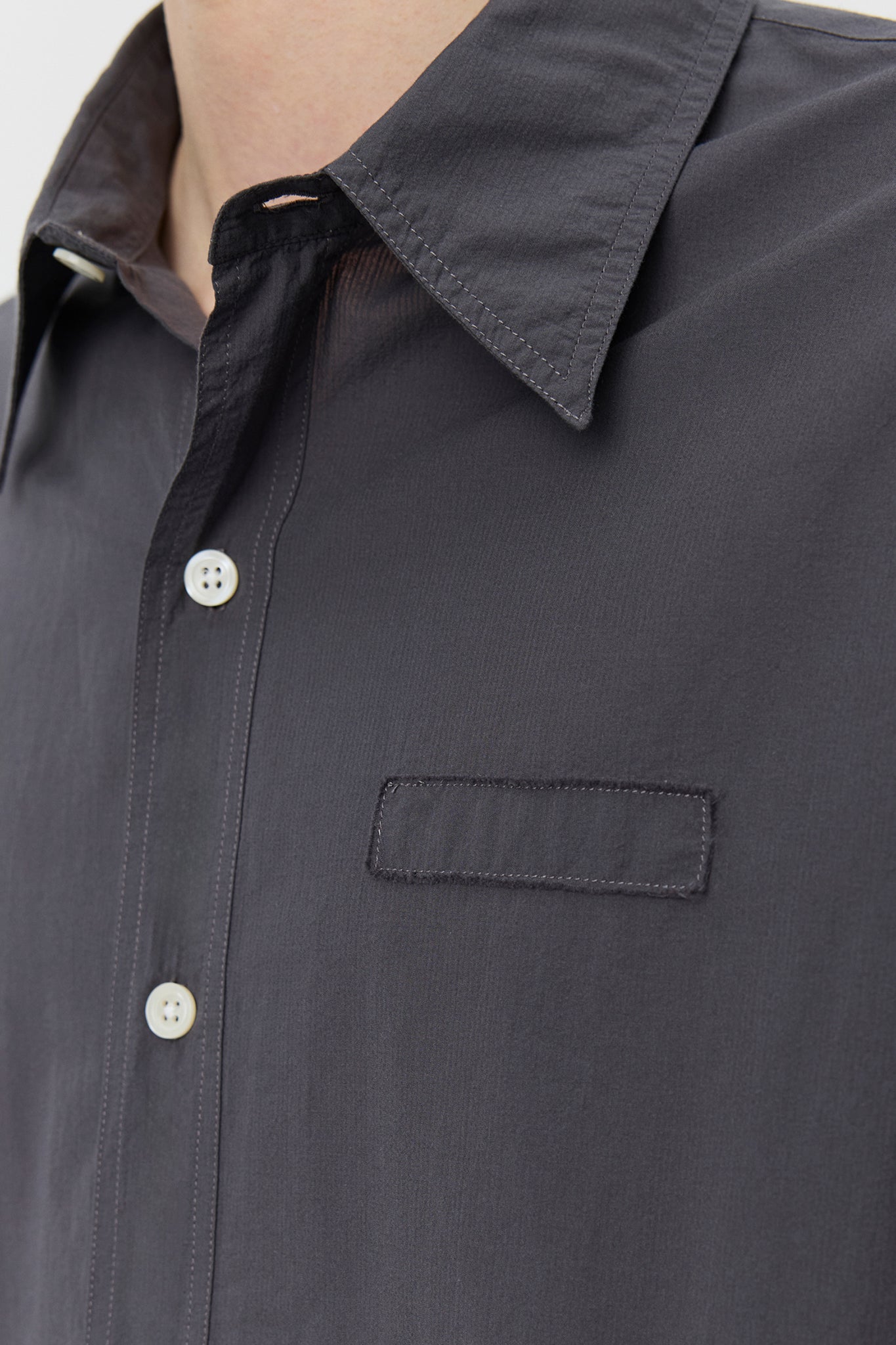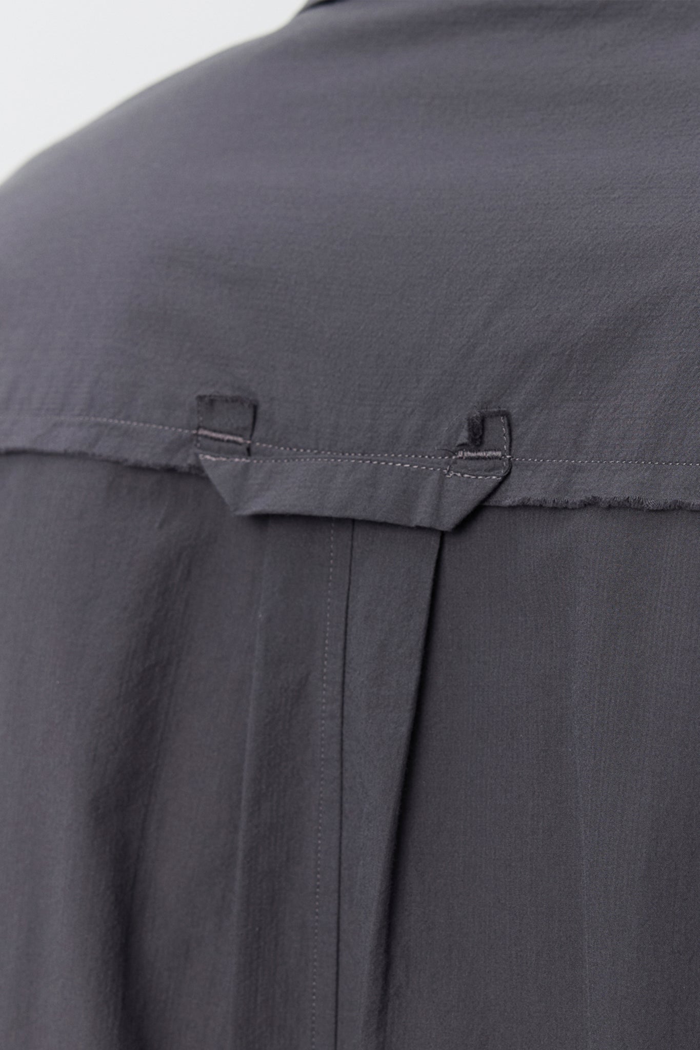 Long sleeve shirt in lightweight cotton with a crisp hand feel. Designed with drop shoulders, button placket, rounded hem, back yoke pleats, and raw-edged detailing at the chest, side seams, and hanger loop. Finished with ivory resin buttons.