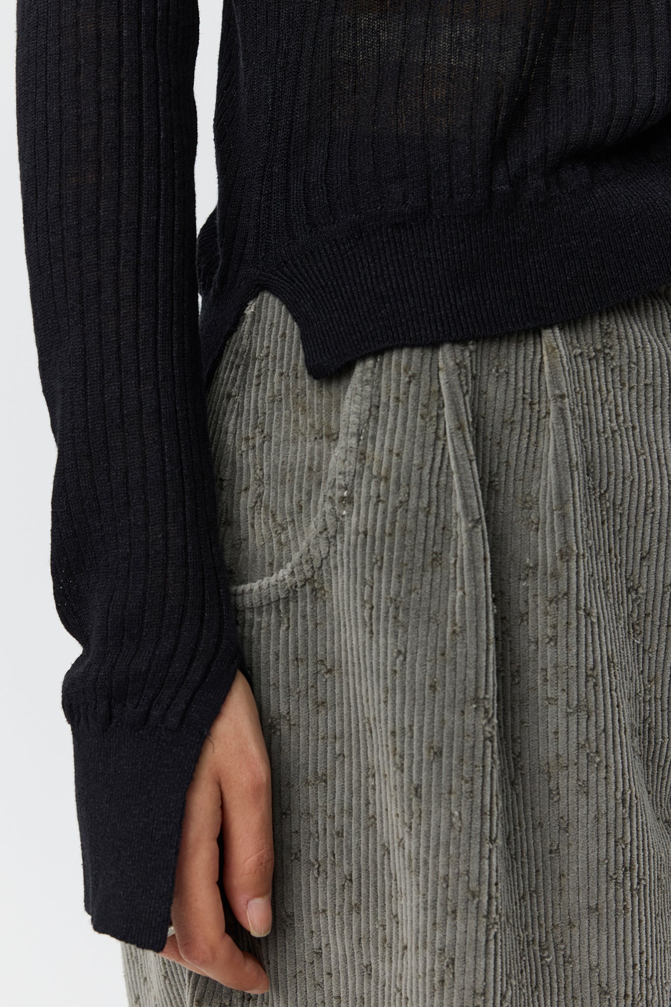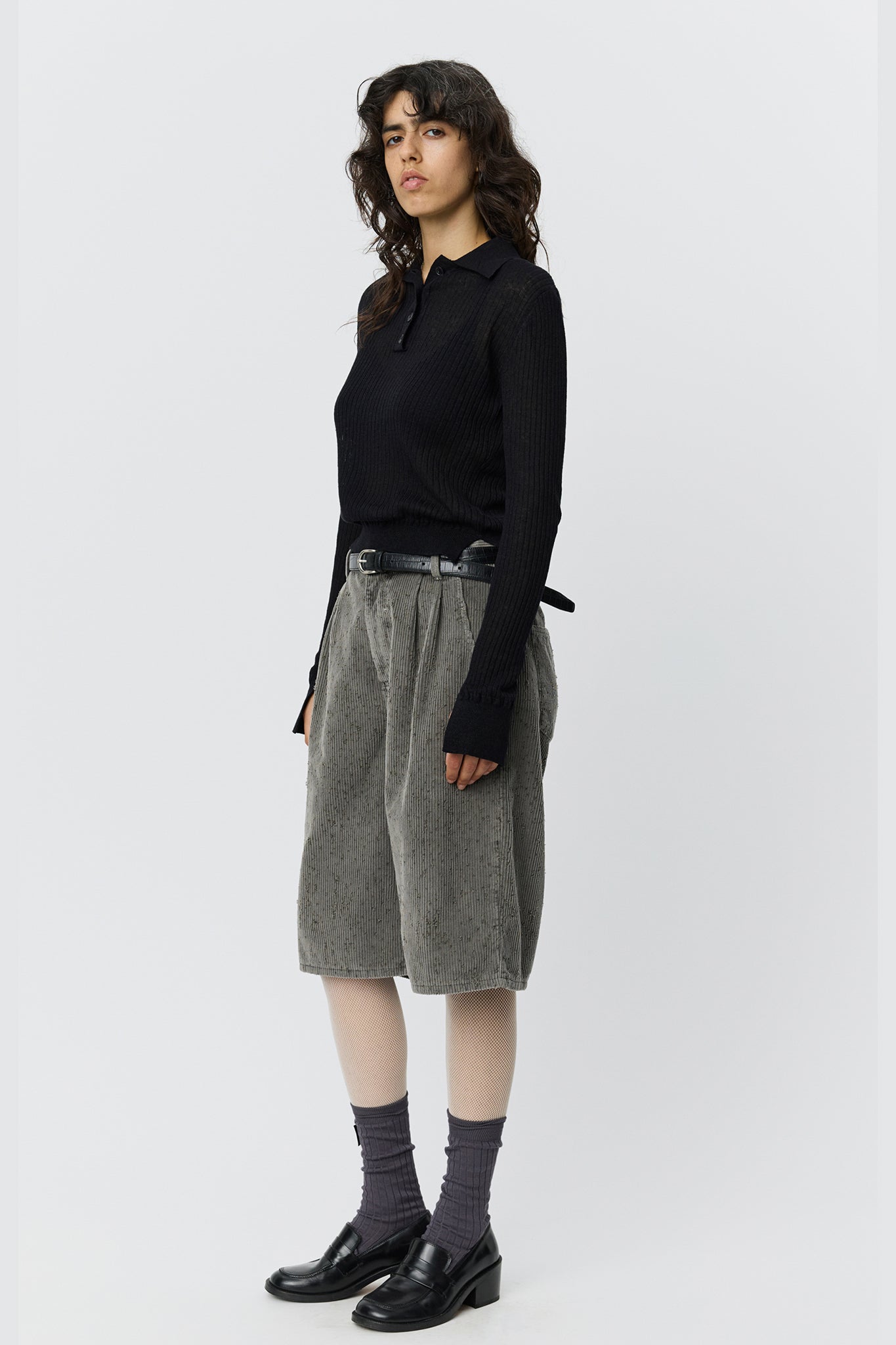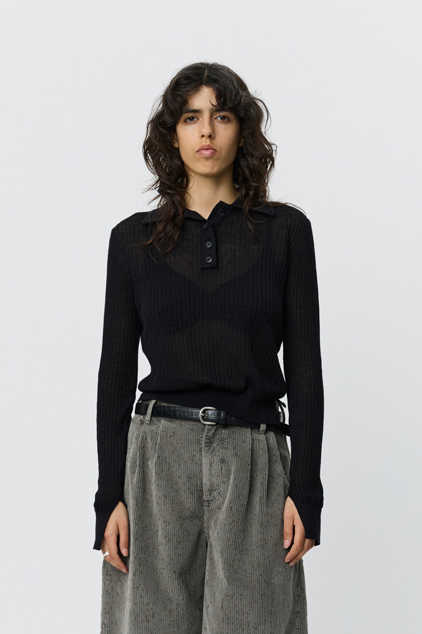 Knitted polo sweater in a lightweight knit with a relaxed drape. Featuring a half‑placket, button closure, a curved hem and sleeve slits.
