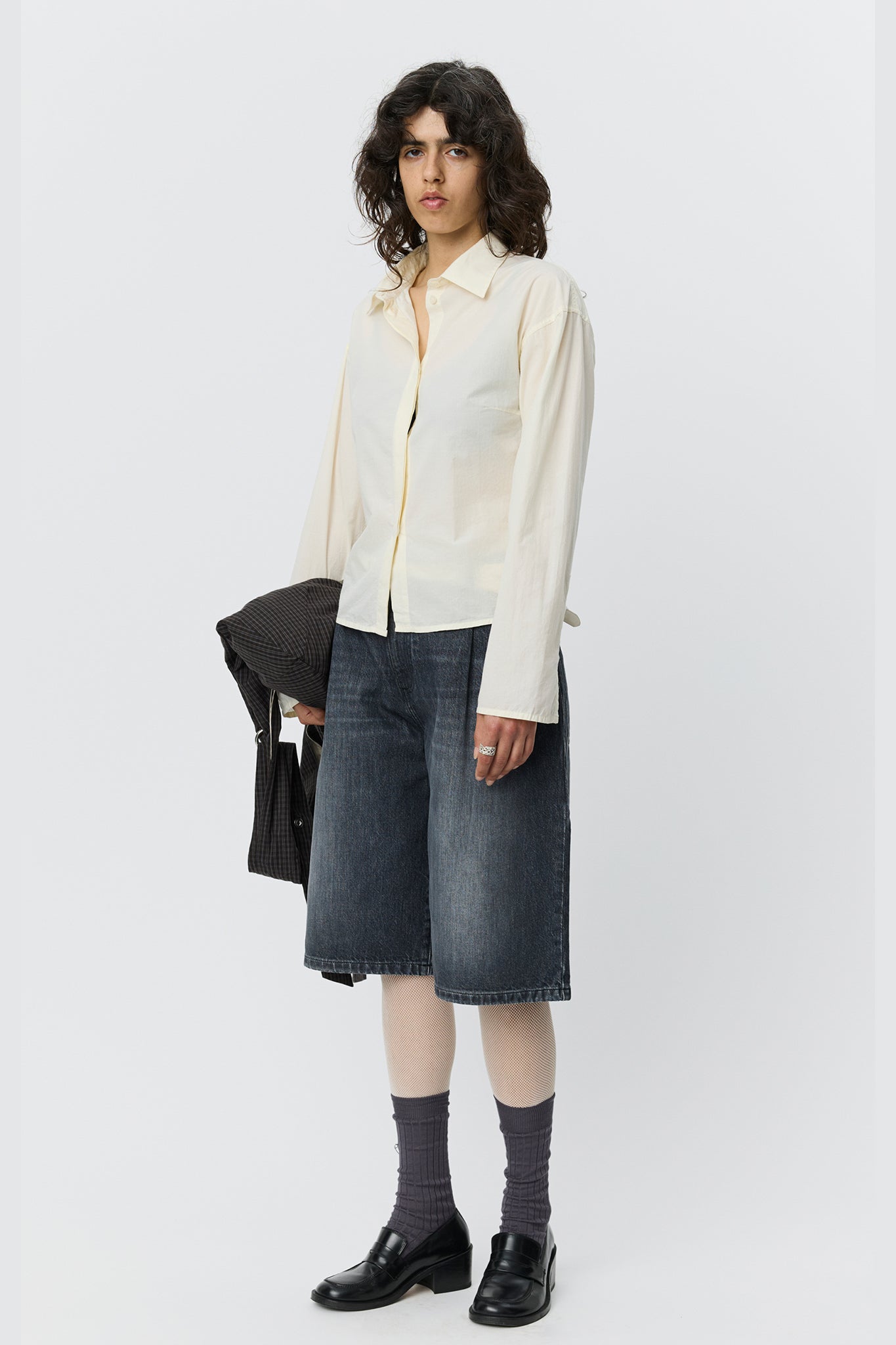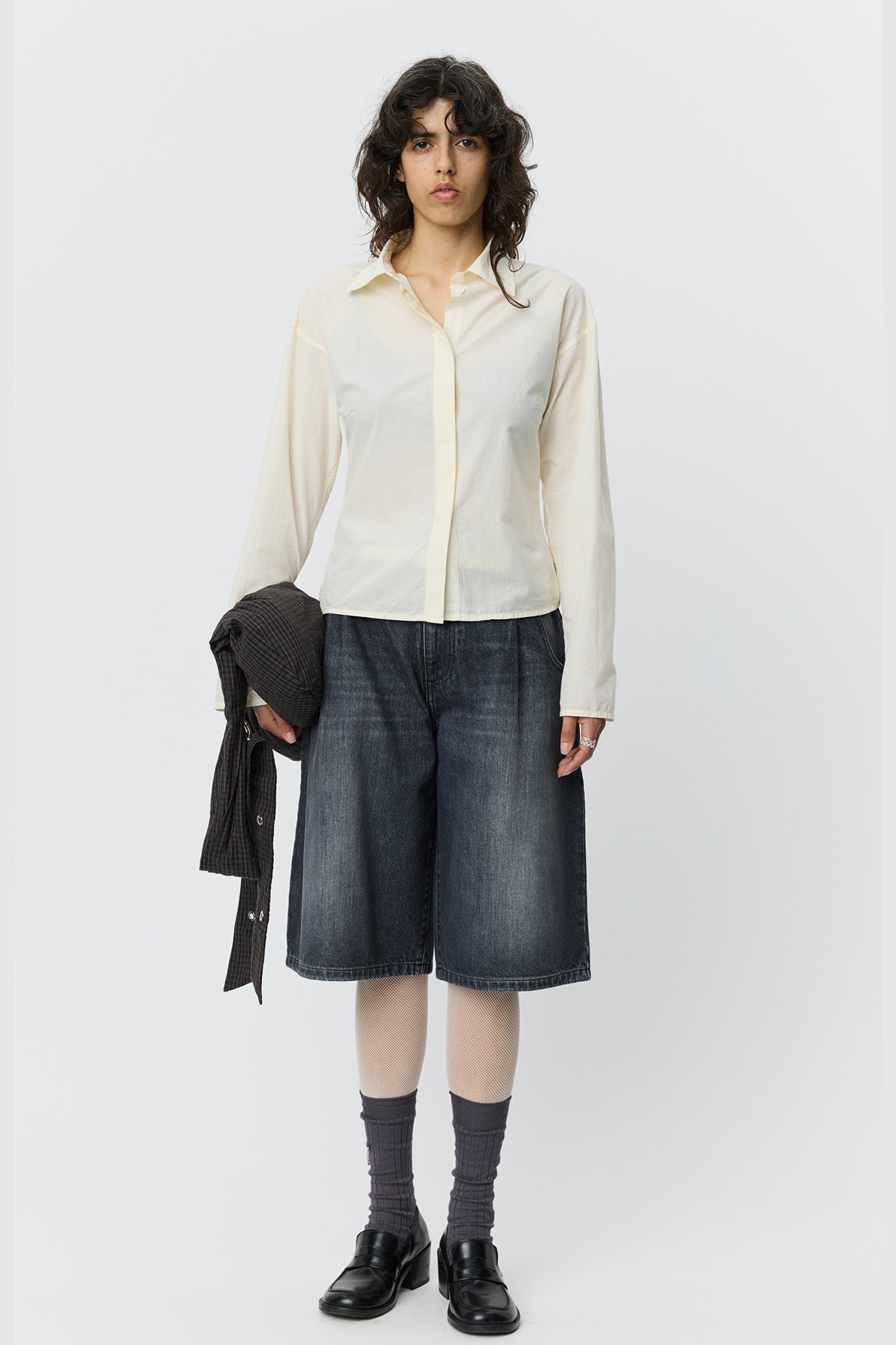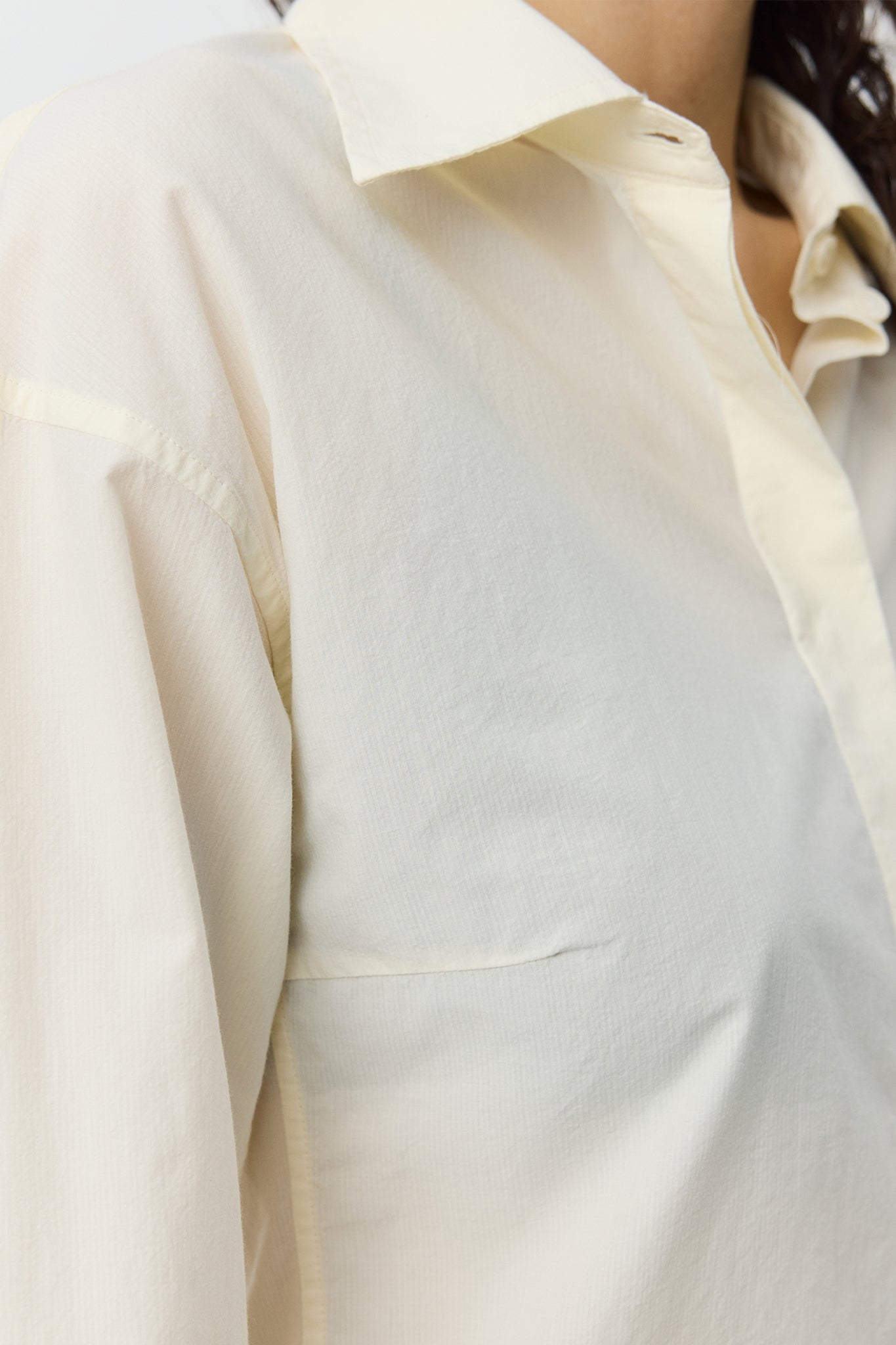 Lightweight cotton shirt with a soft hand and fine woven stripe in off white. Designed with a spread collar, drop shoulders, curved hem, and hidden button closure. Finished with ivory resin buttons.