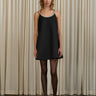 Mini A-line dress with a voluminous silhouette. Features crystal appliqué trim around the neckline and shoulder straps. Finishes with a clean, minimal hemline.
