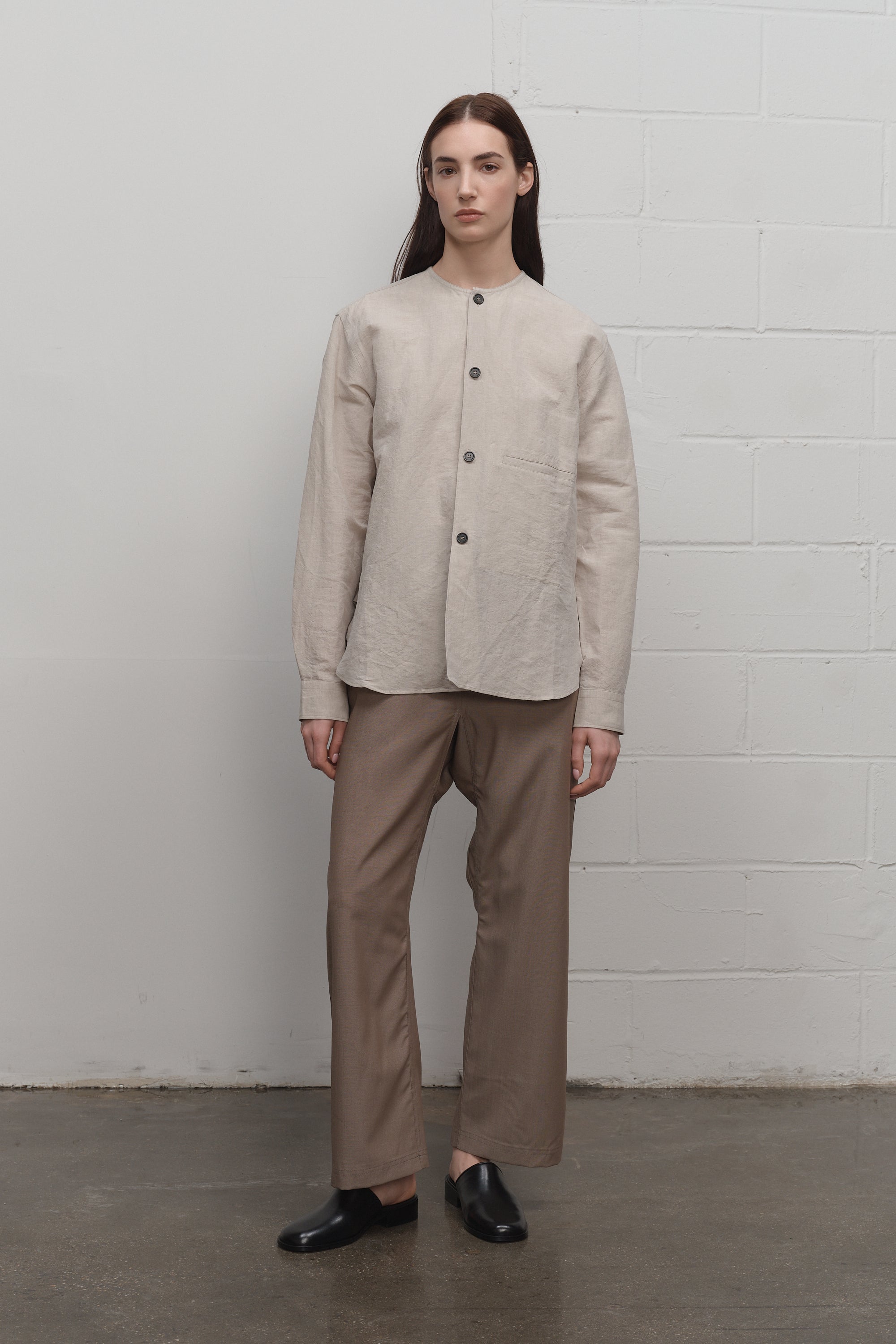 Collarless long sleeve overshirt with full front button closure. Features a single front pocket, box pleat at back yoke, and a rounded hem.