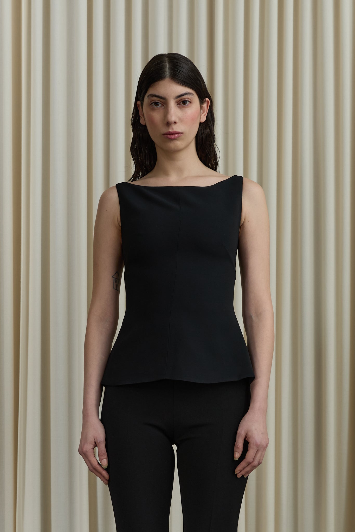 Sleeveless top featuring a tailored silhouette with sculptural waist darts.