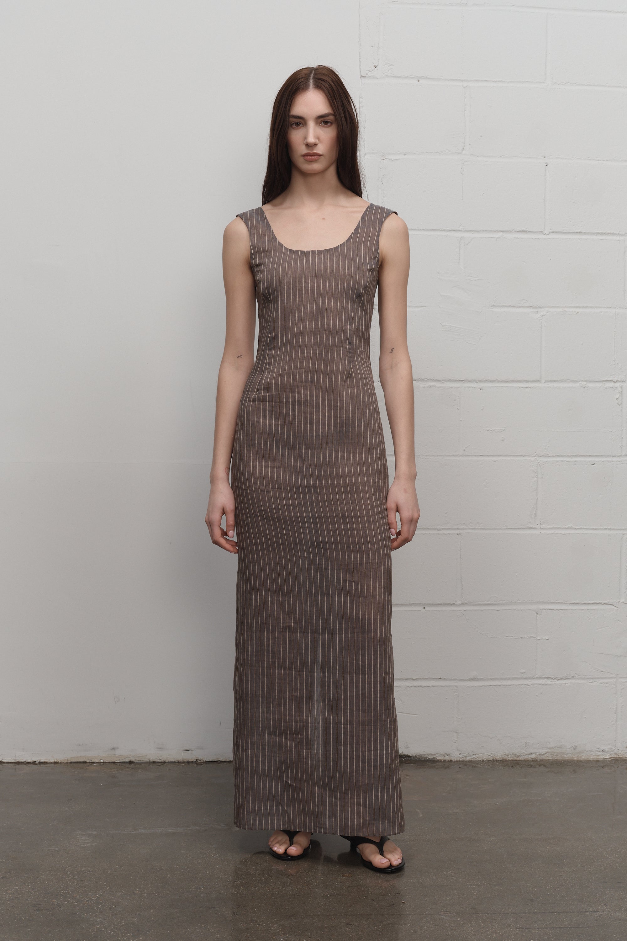 Sleeveless full length dress in stripes with a broad scoop neckline. Featuring narrow tank straps and an invisible back zipper.