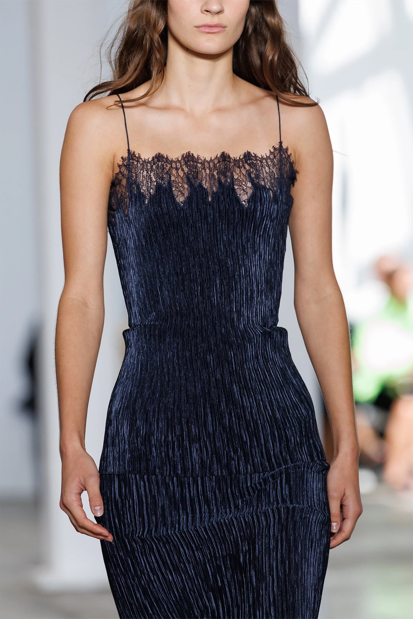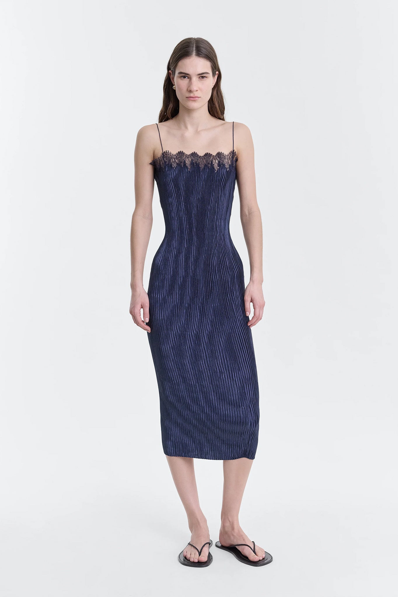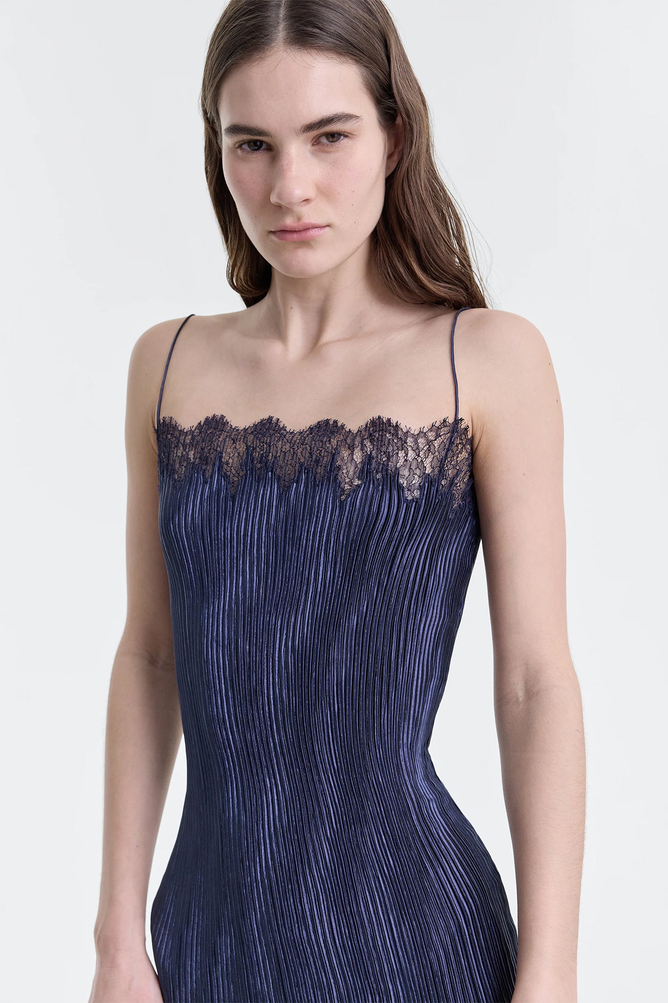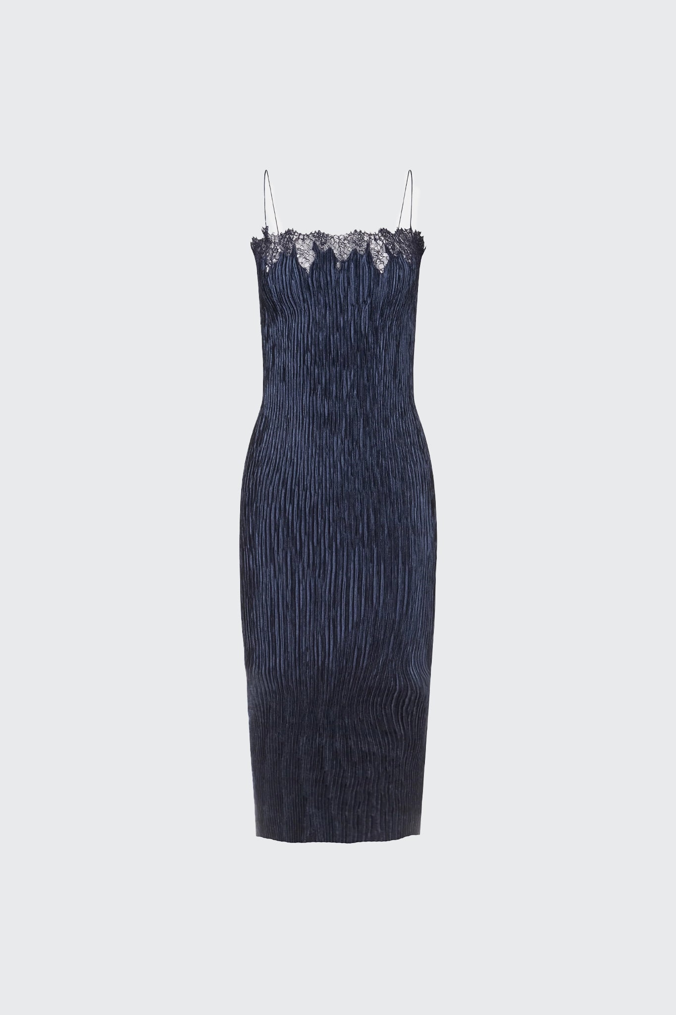 Pleated pull-on camisole dress with hand encrusted lace detailing.