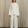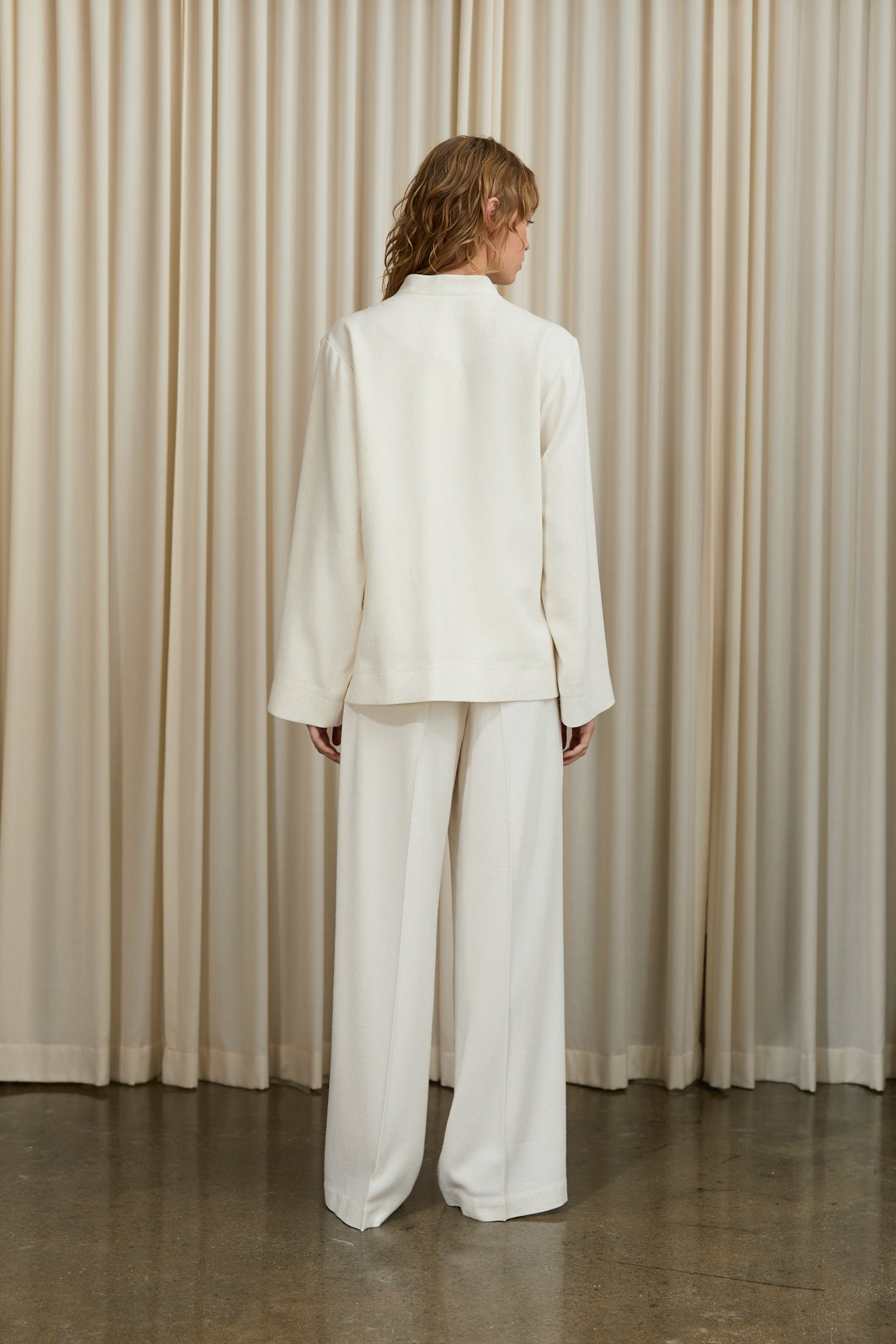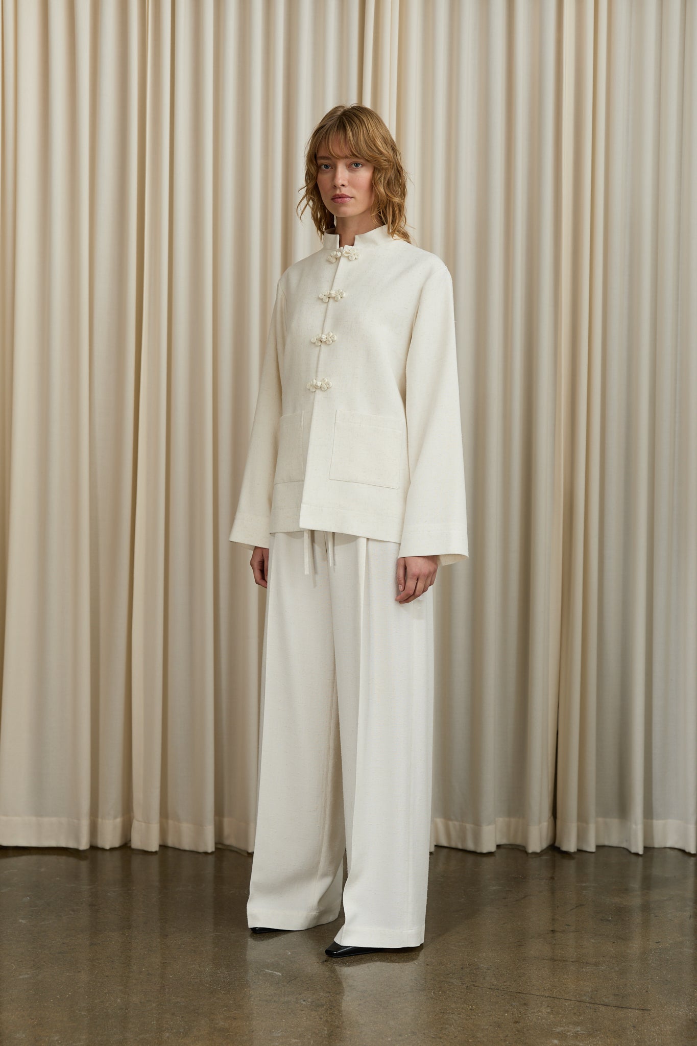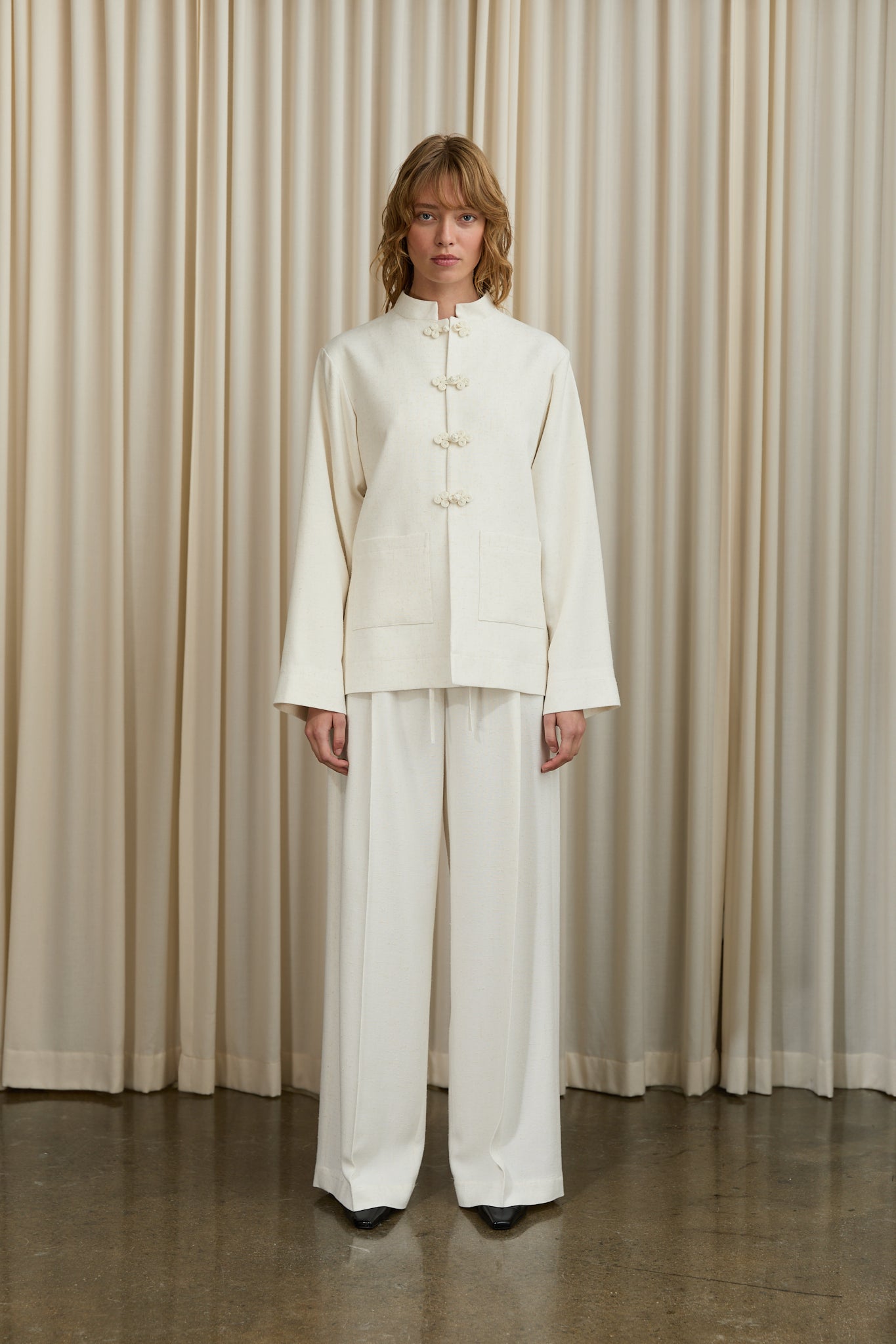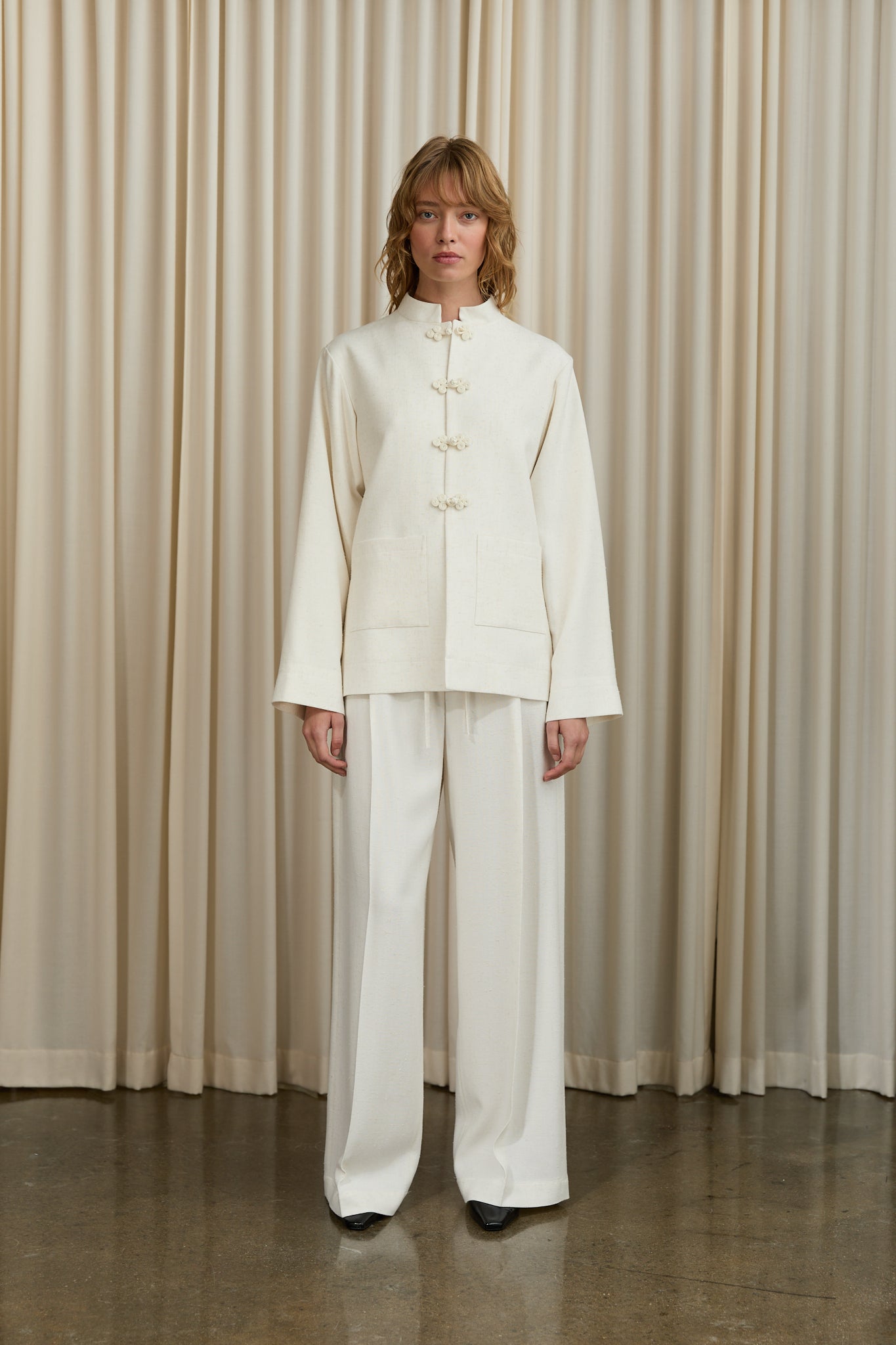 Signature round-neck jacket in silk-viscose blend. Features pankou closures along the front, wide sleeves, and two side patch pockets.