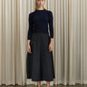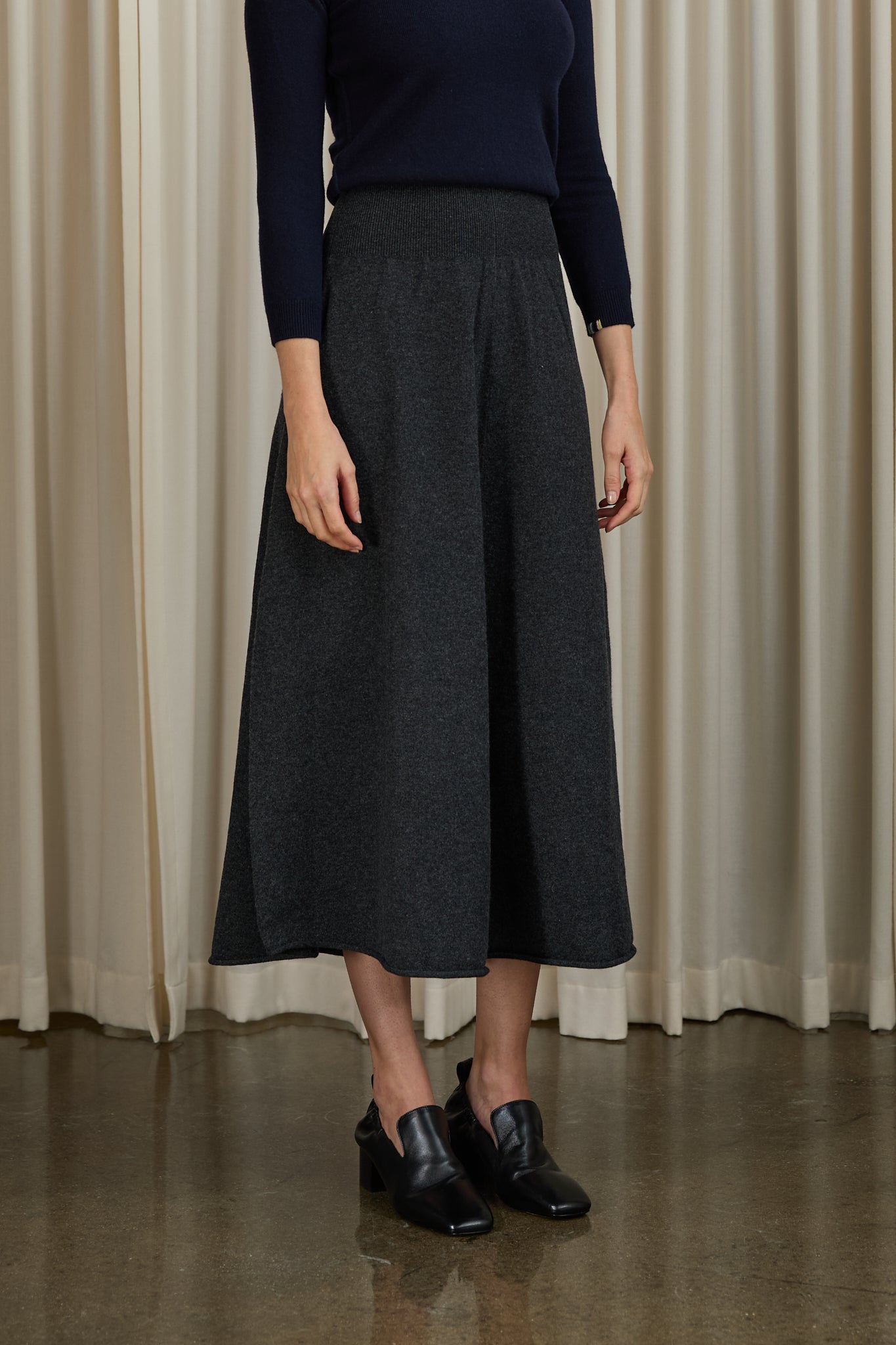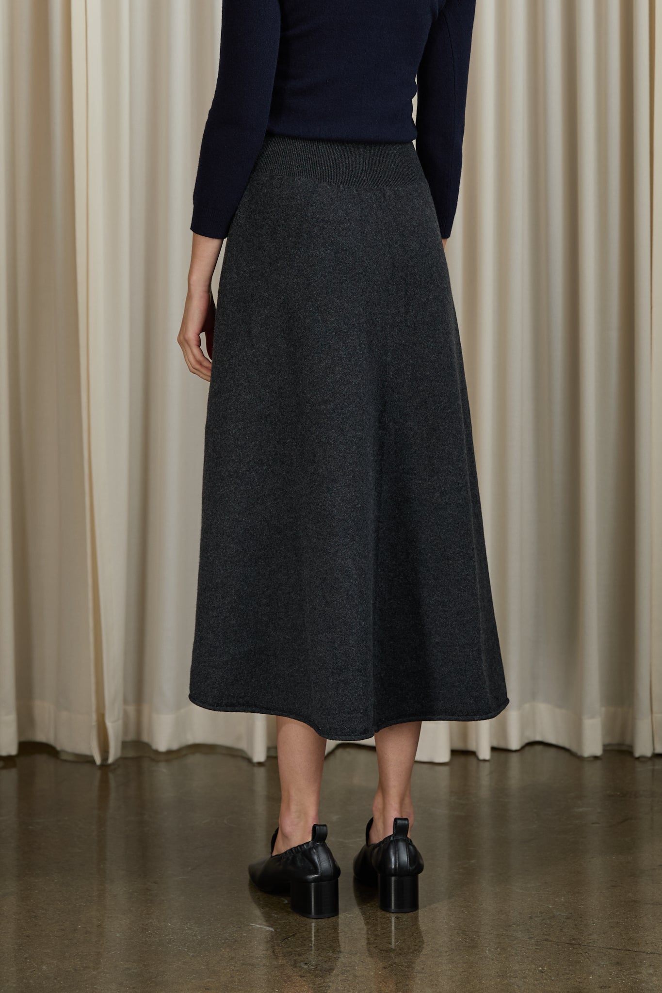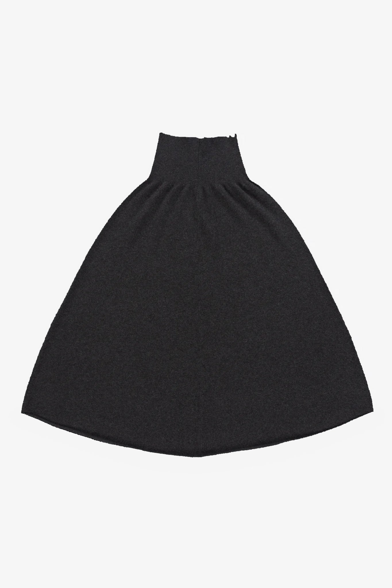 A flared, midi-skirt with a rib-knitted waistline and a rolling edge hem.