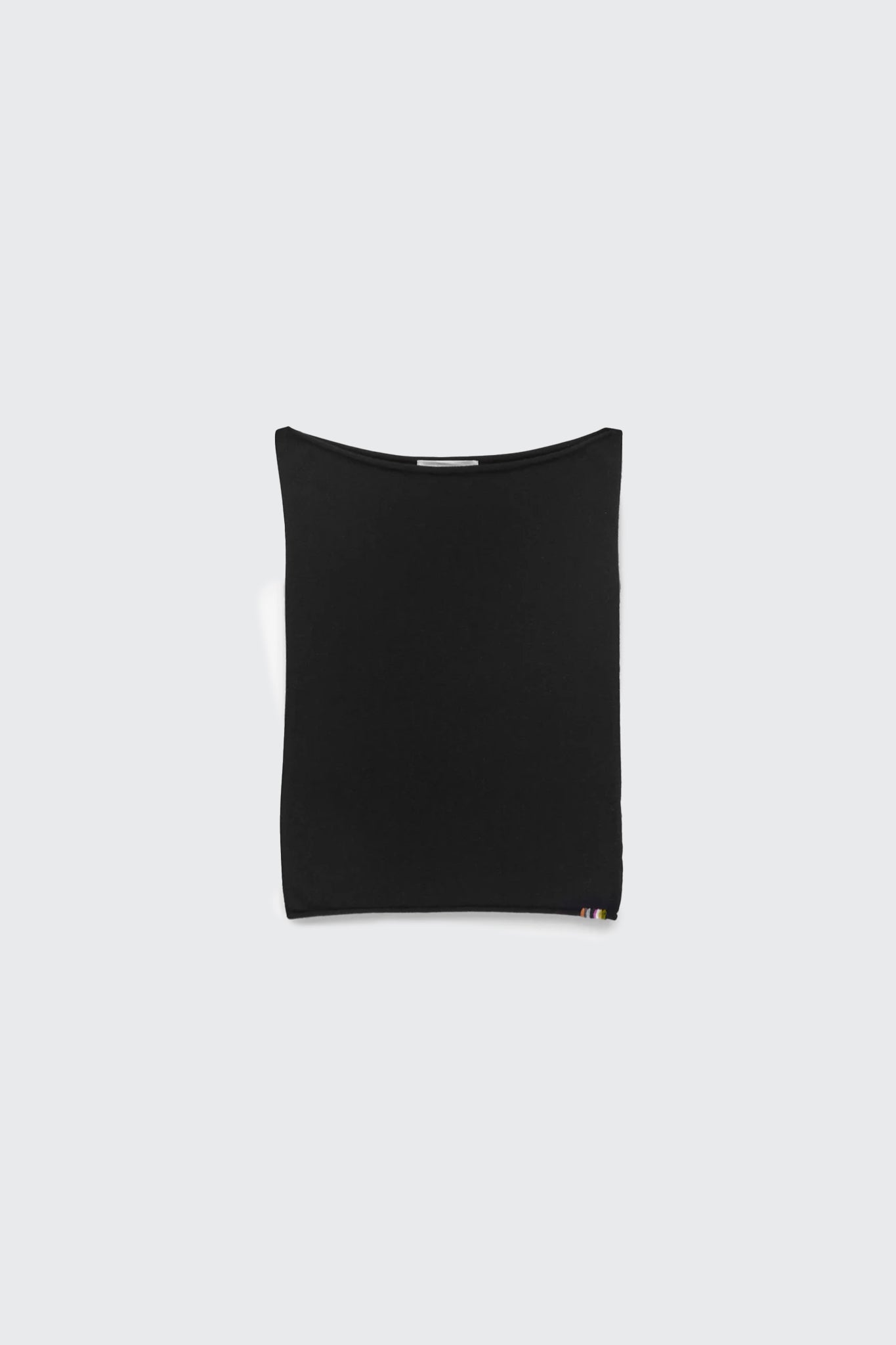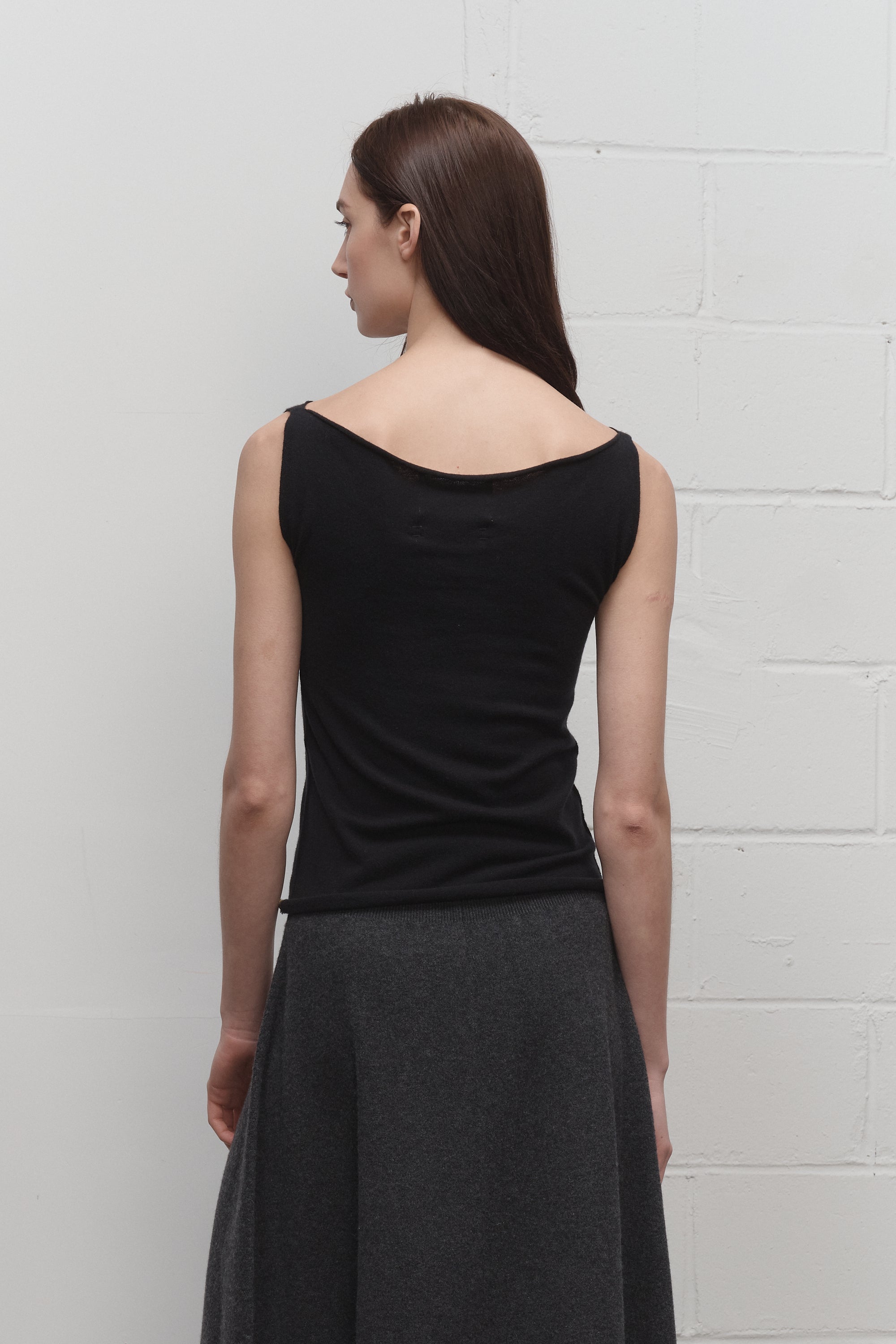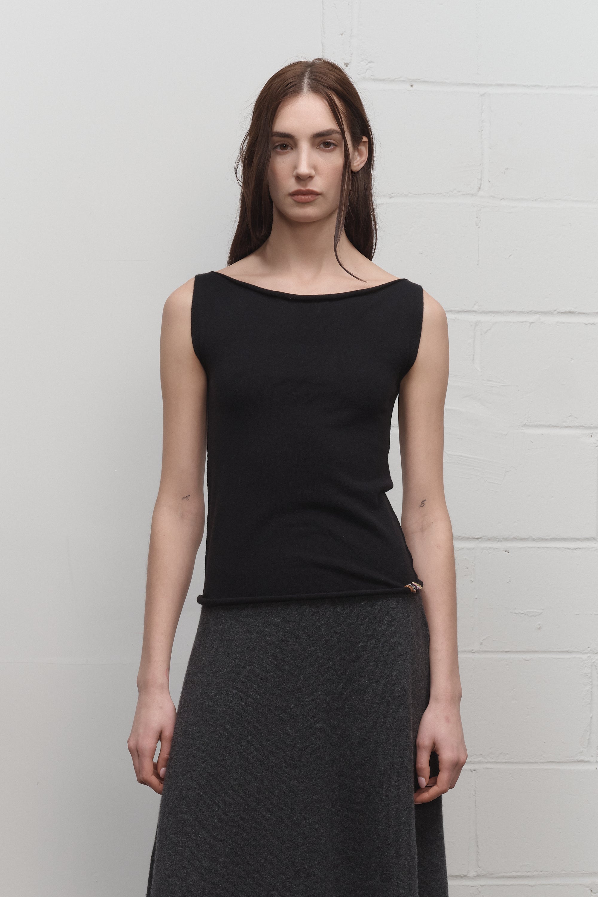 Fitted, figure-hugging sleeveless top with a boat neckline and rolled edges at the neck and hem.