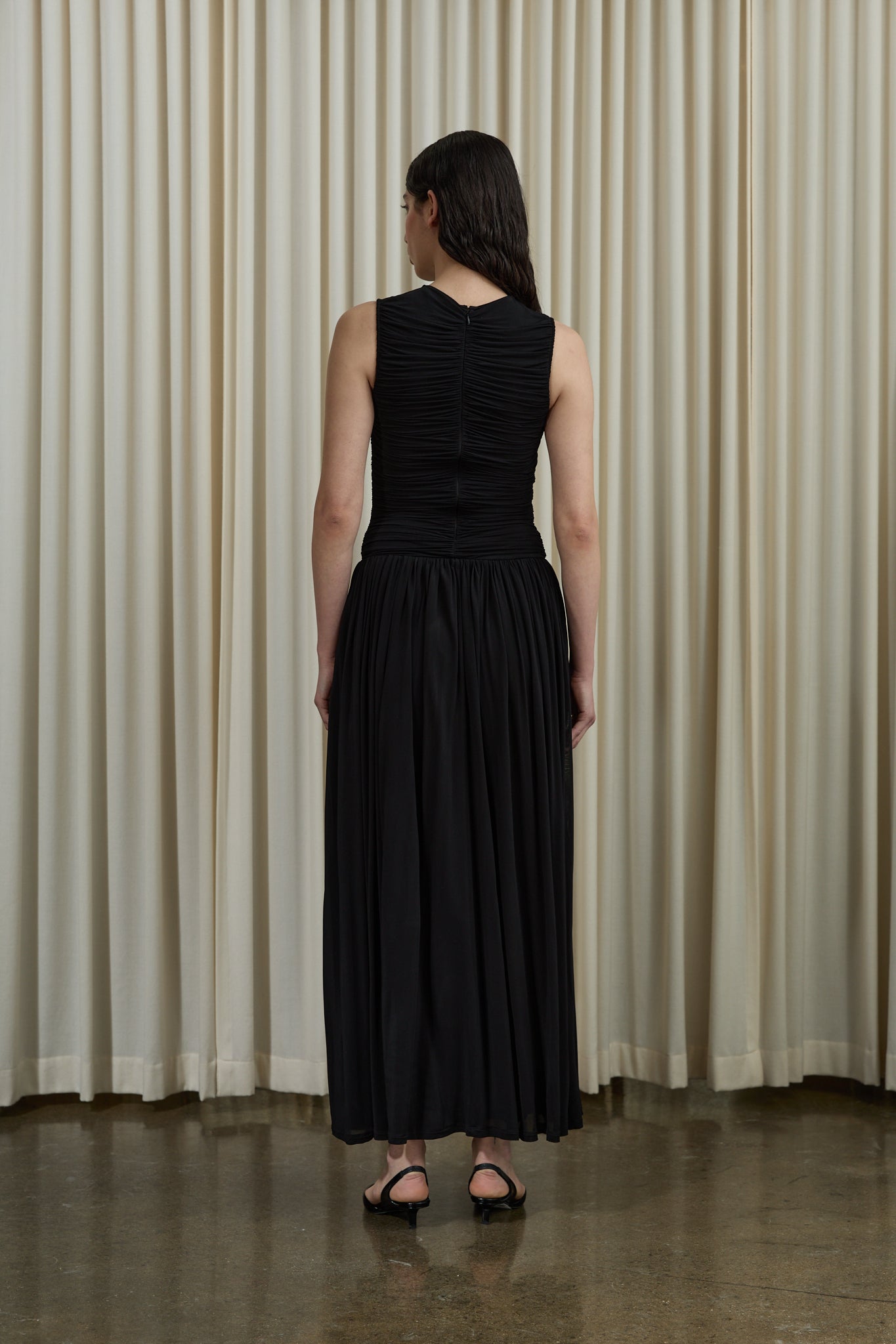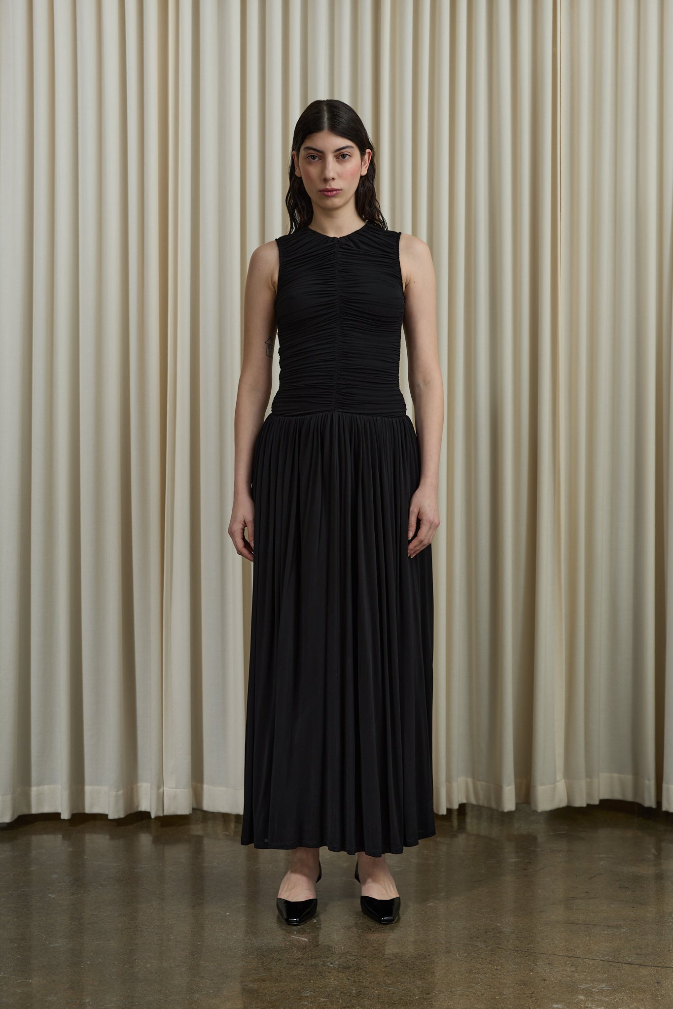 Black sleeveless dress with a body-skimming fit, shallow V-neckline, delicate gathers, and a full flowing skirt in lightweight jersey.