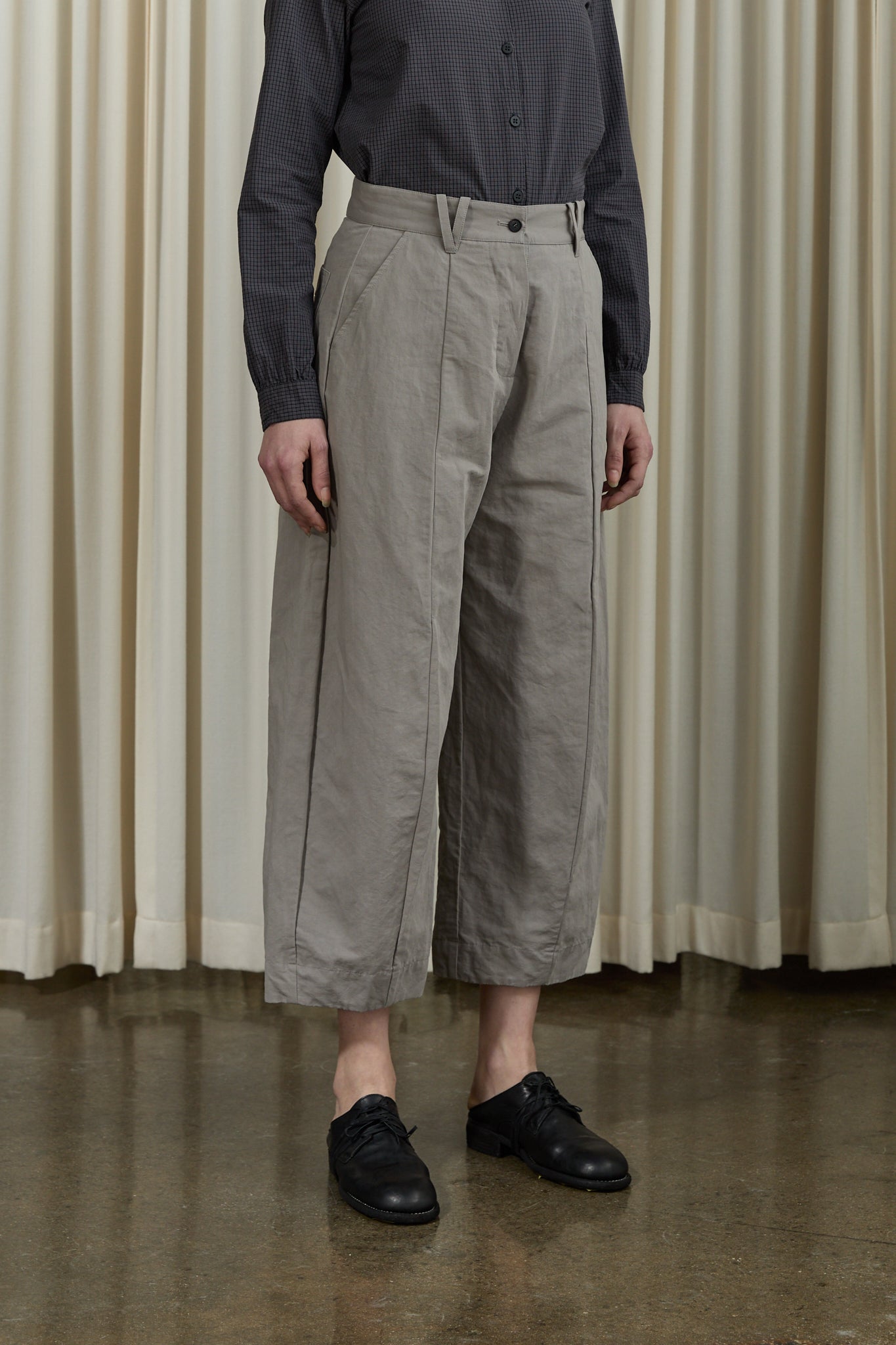 Cropped wide-leg trousers in crisp Japanese paper-touch cotton. Featuring front pleats, side pockets, and a clean button closure. Finishes with subtle back welt pockets and panel detailing.