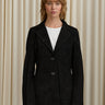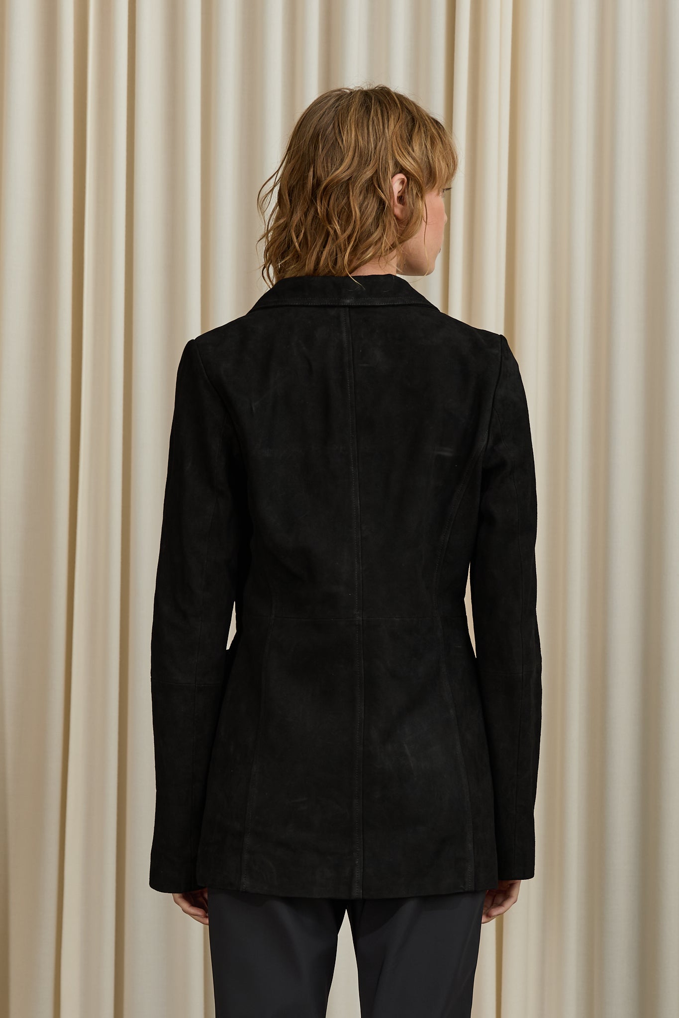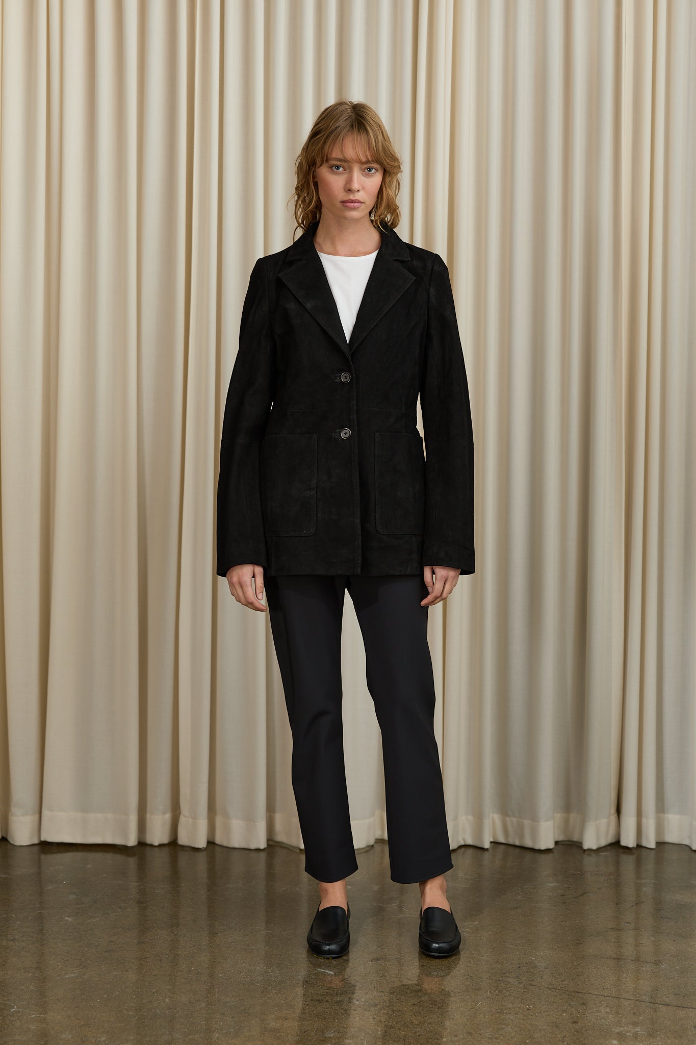 Fitted single-breasted suede blazer in a low V-neckline. Features front patch pockets and a lapel collar.