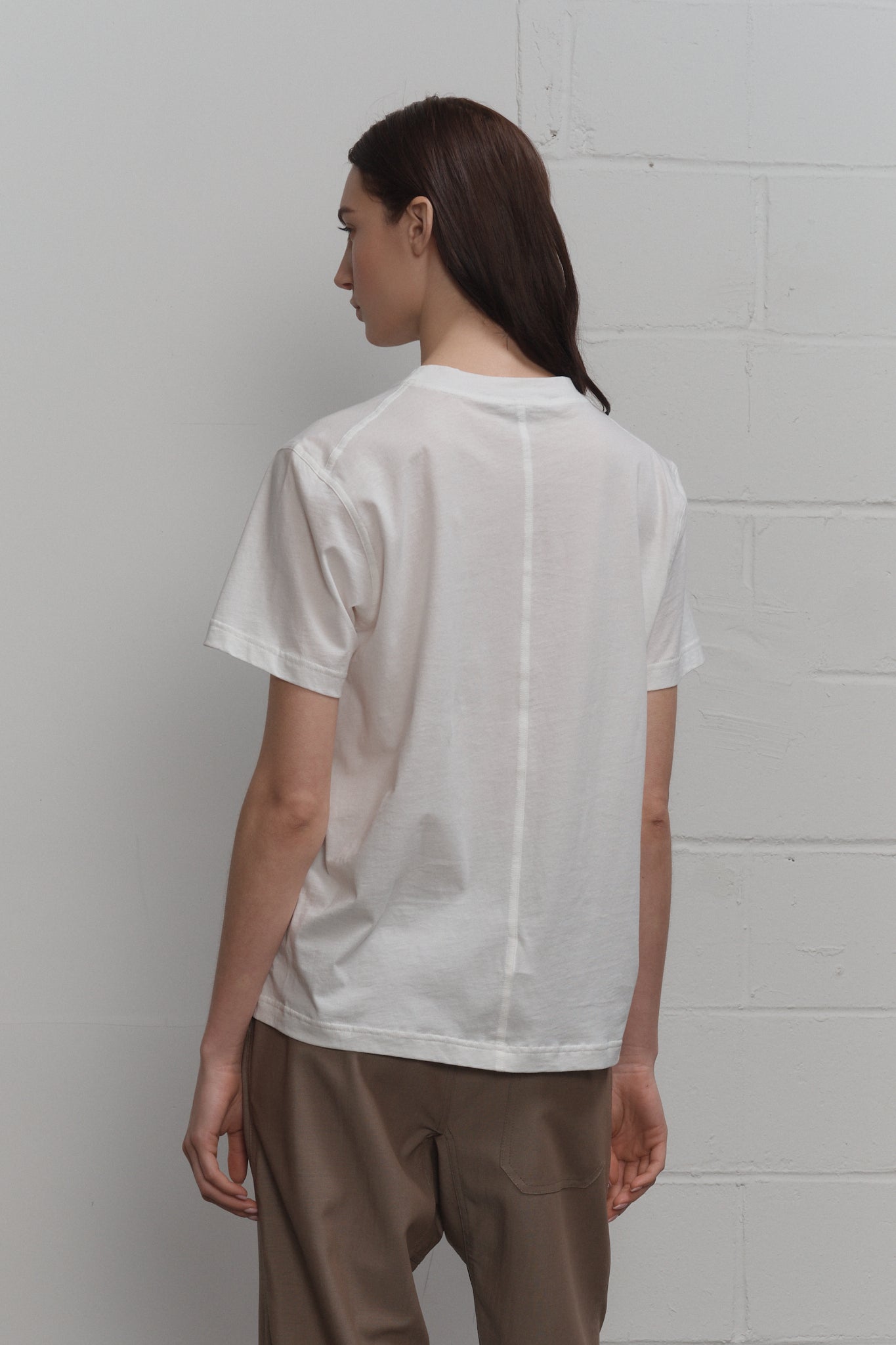 Crewneck short sleeve t-shirt with set-in shoulders. Features a back seam detail and straight hem.