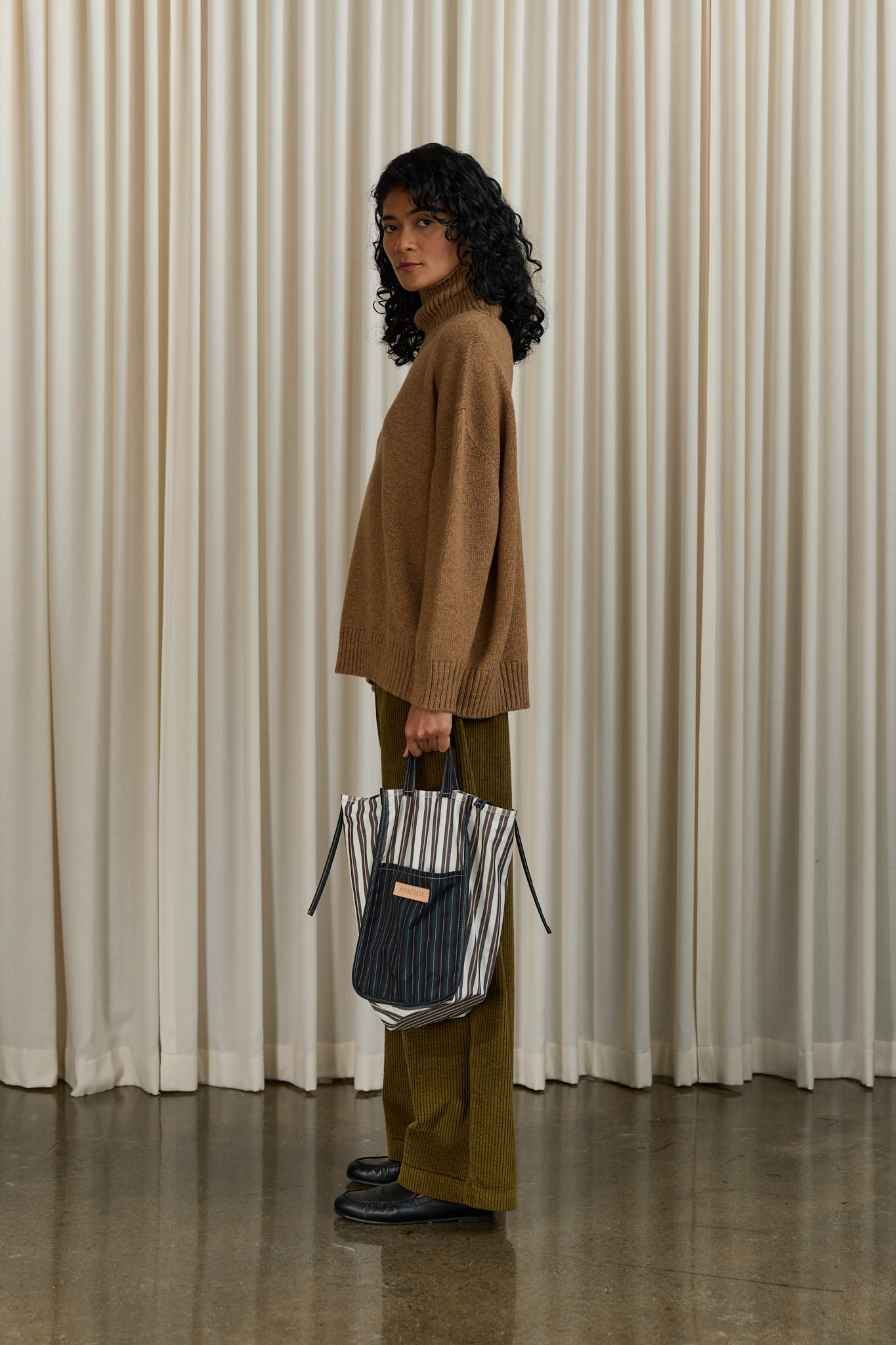 Lightweight structured medium tote in yarn-dyed cotton. Features dual top handles and shoulder straps, tie closure, and two exterior pockets with branded leather patch. Gusseted base and sides.