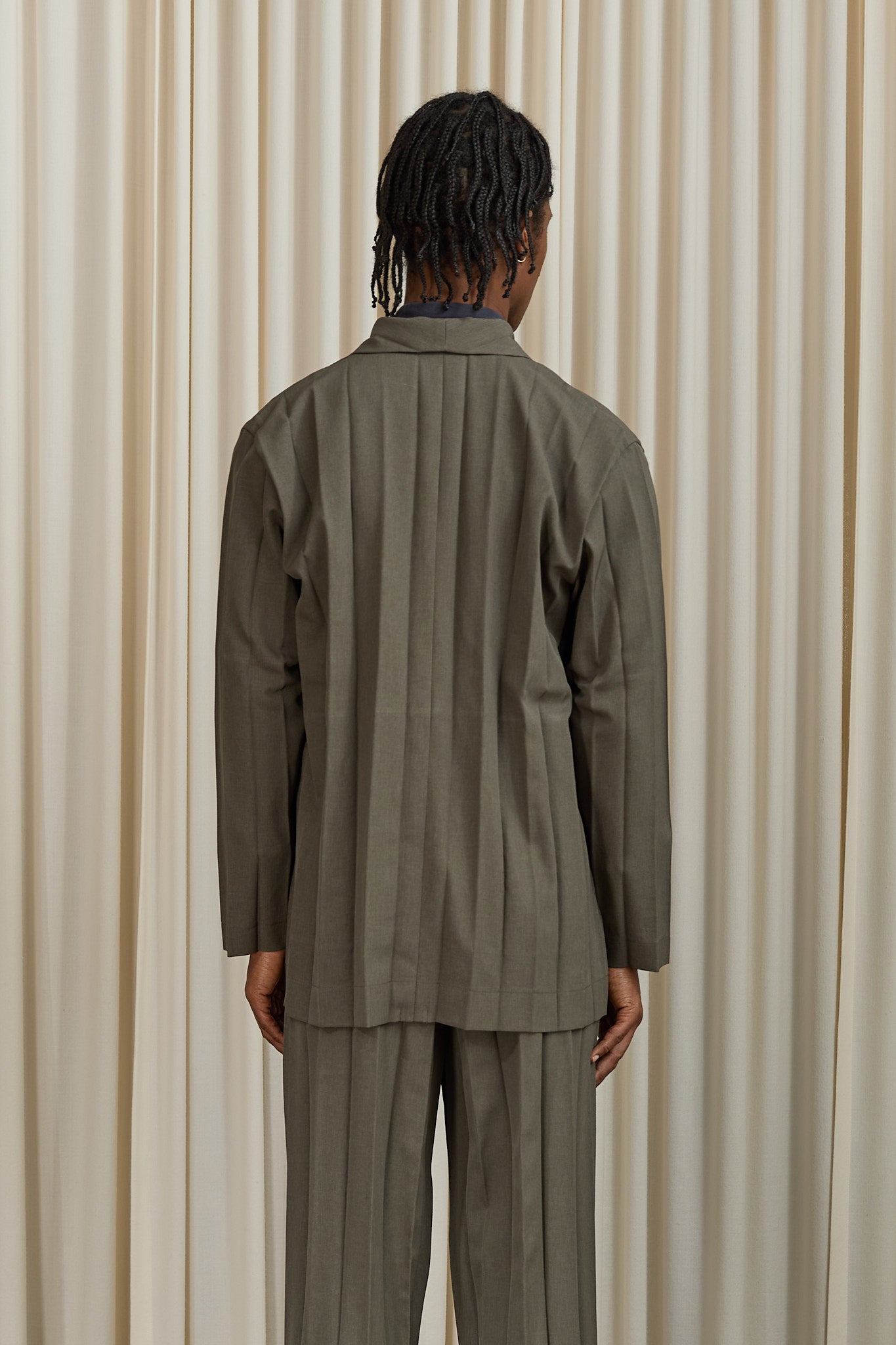 Wide accordion pleats formal blazer with notched lapel. Featuring button closure and double seam pockets.