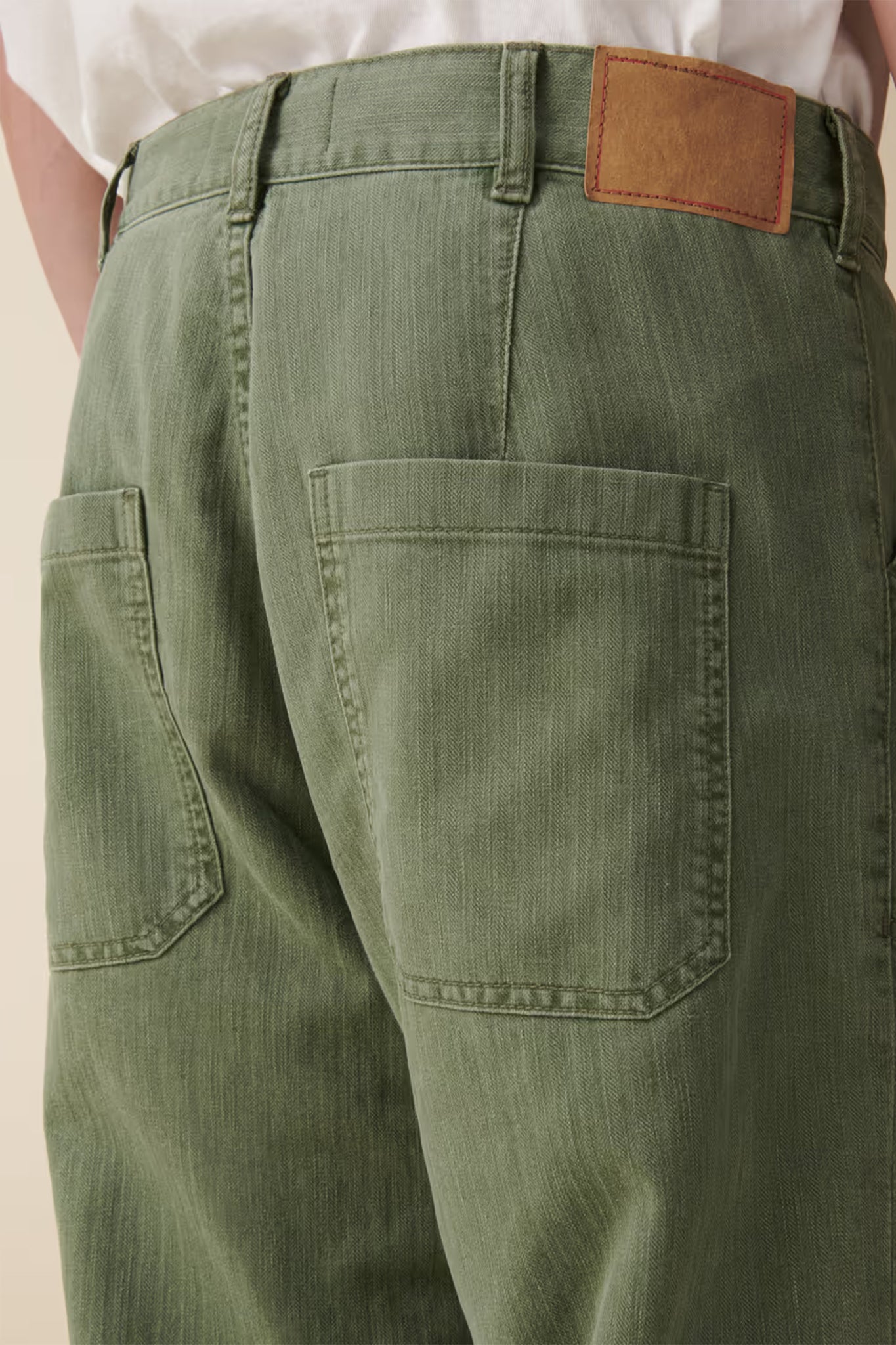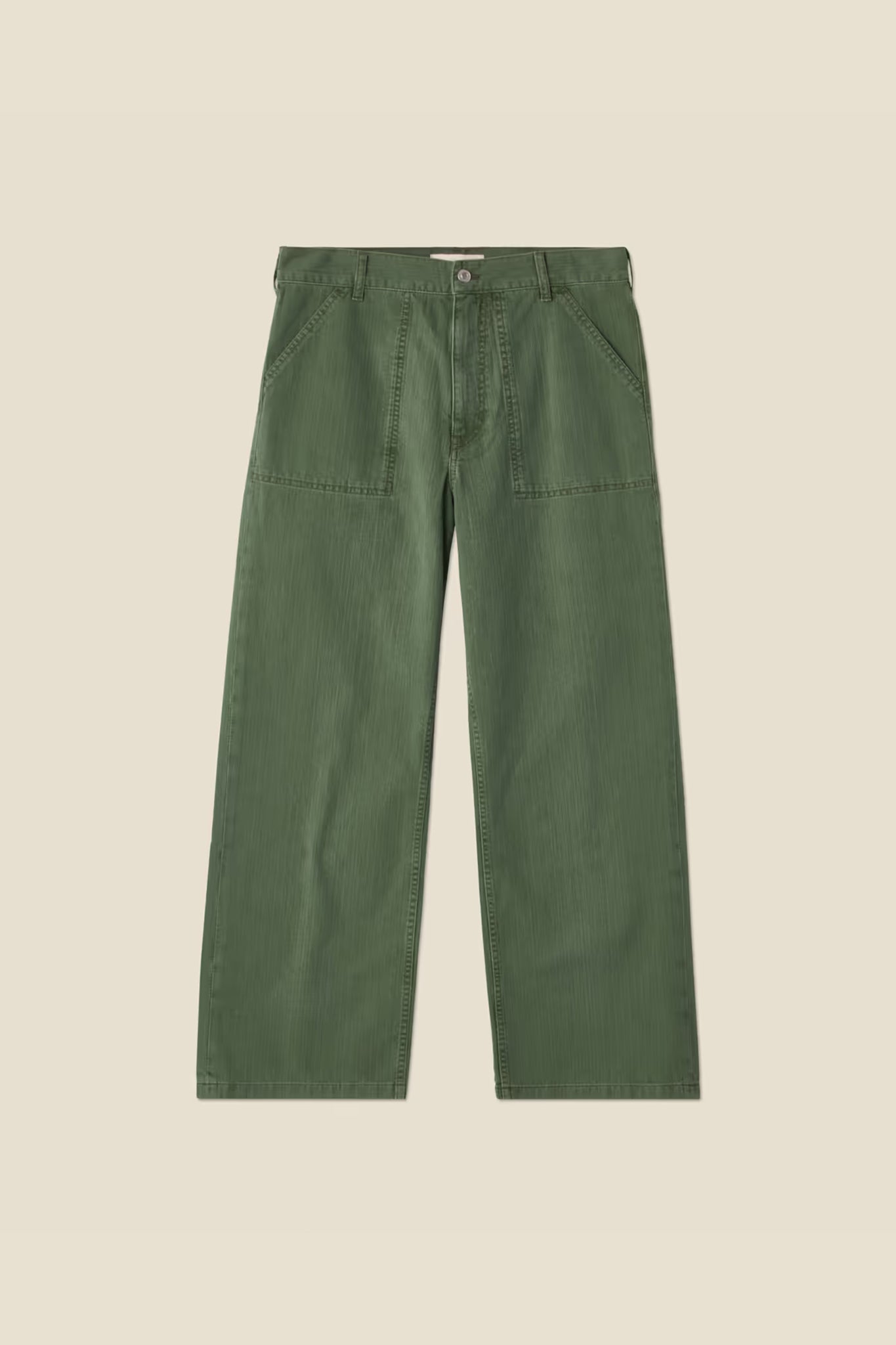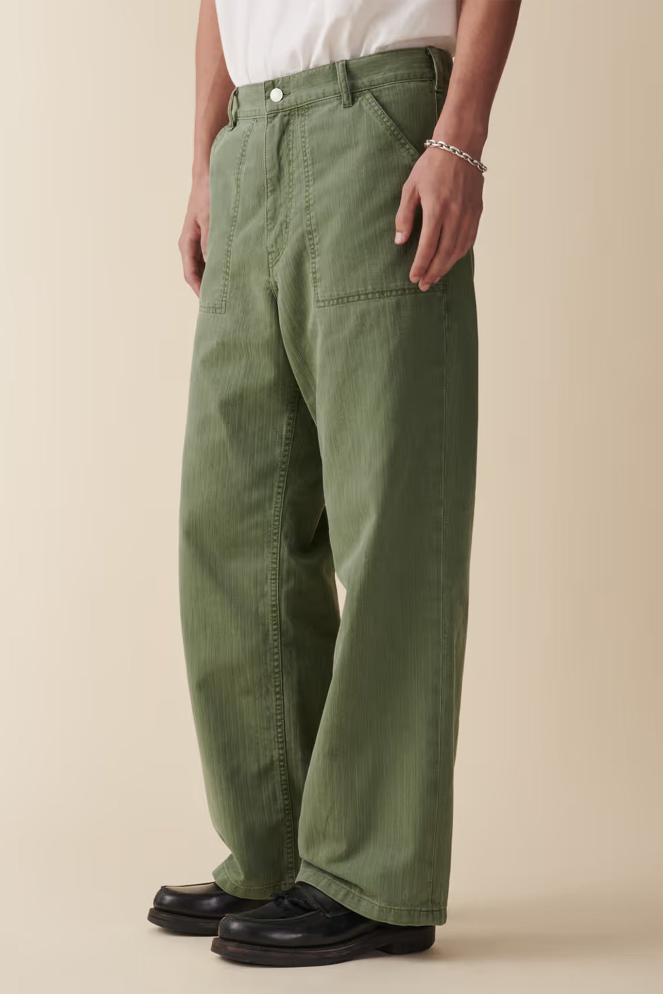 A mid-rise chino jeans with loose, straight legs. Featuring zip fly, belt loops, and patch pockets inspired by classic worker pants.