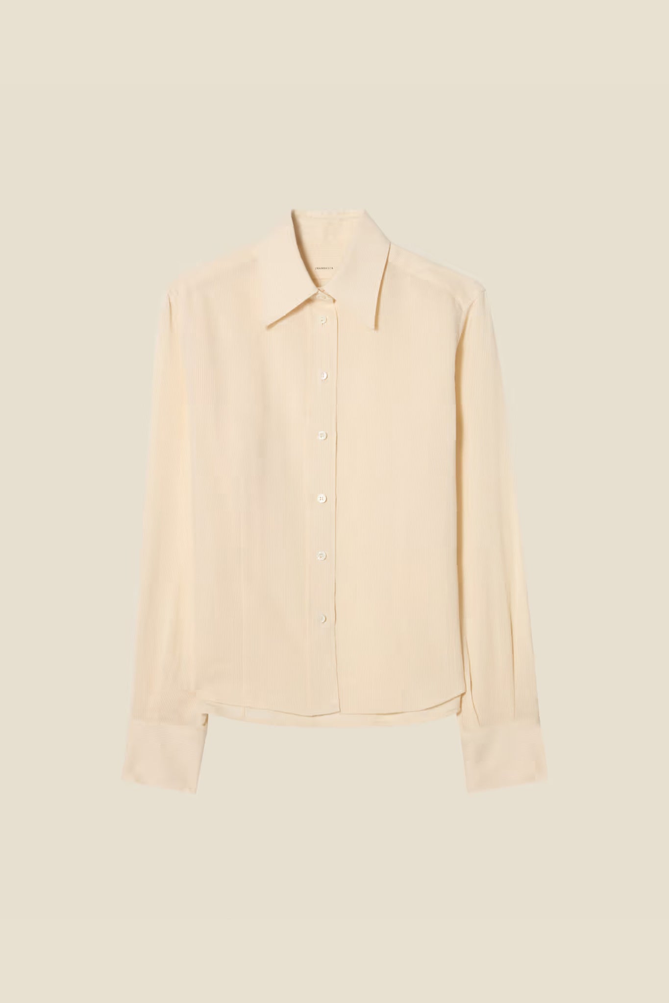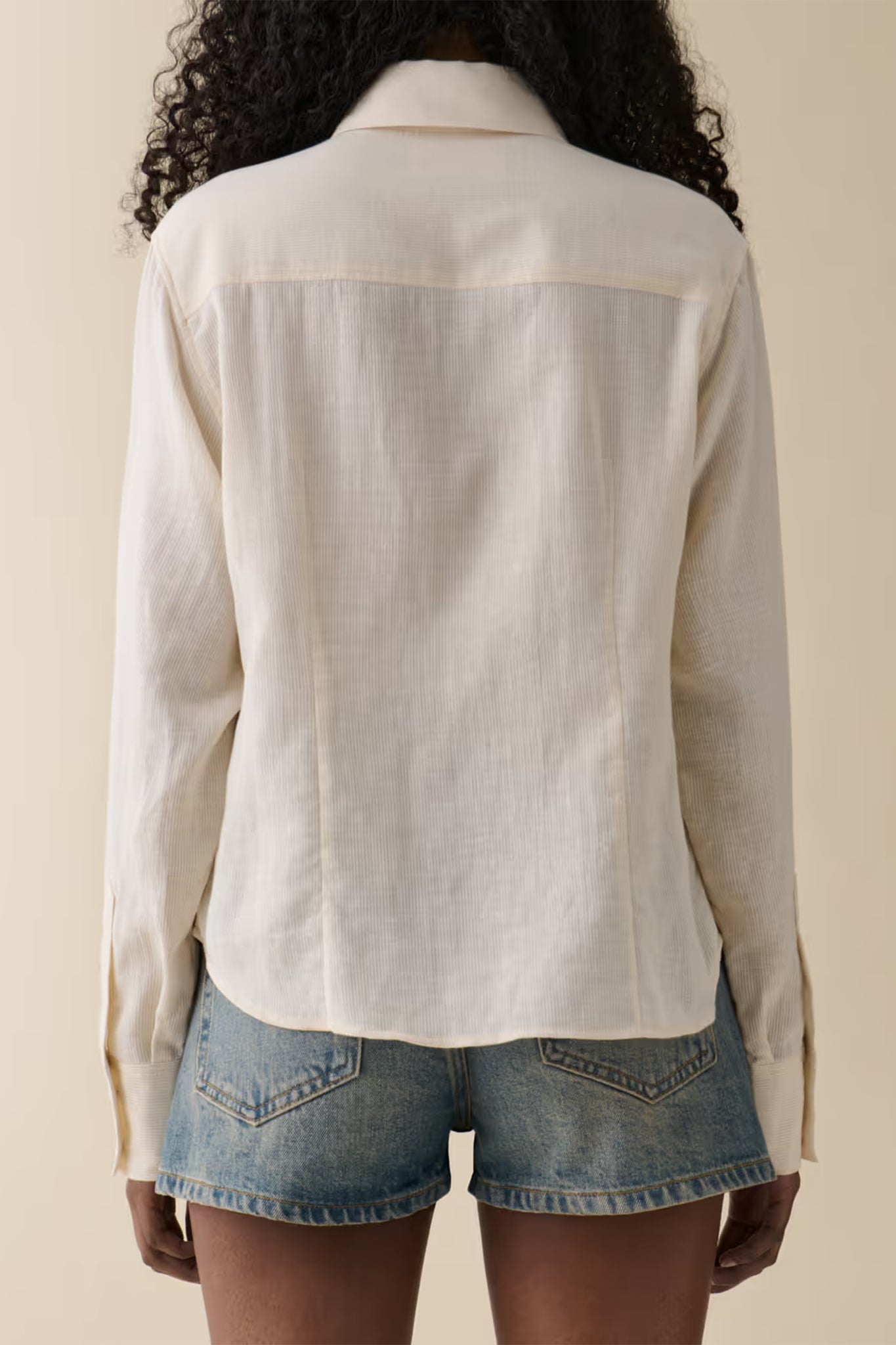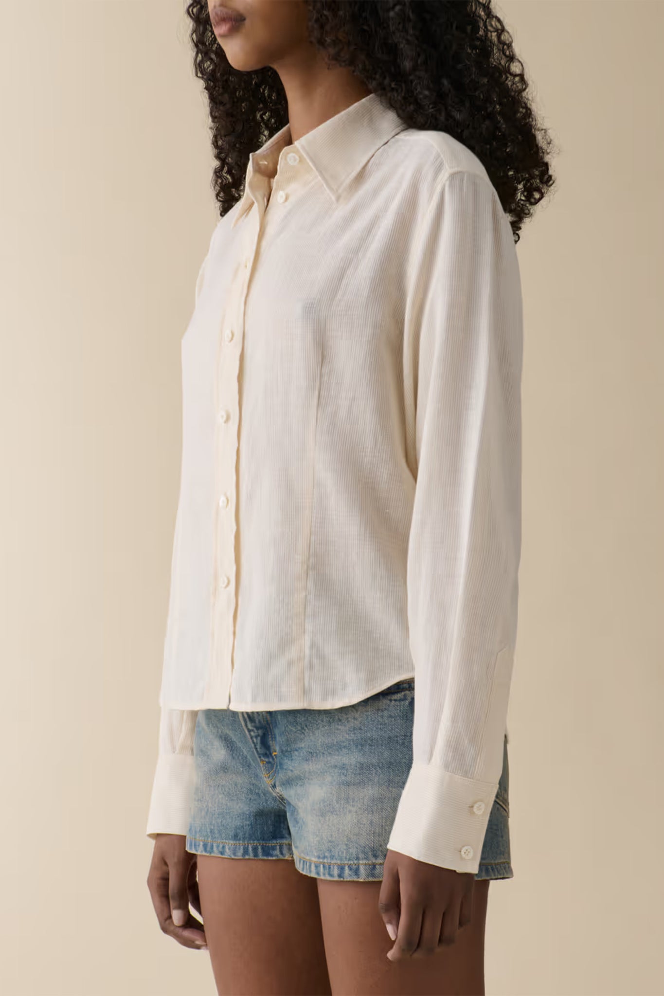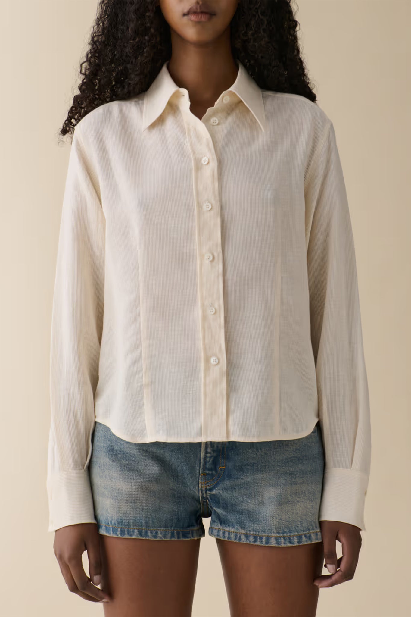 Fitted shirt in a hip-short length. Featuring a classic collar, button placket, and mother of pearl button finishes.