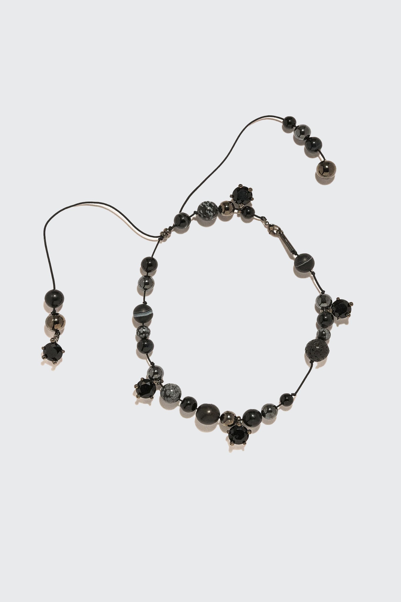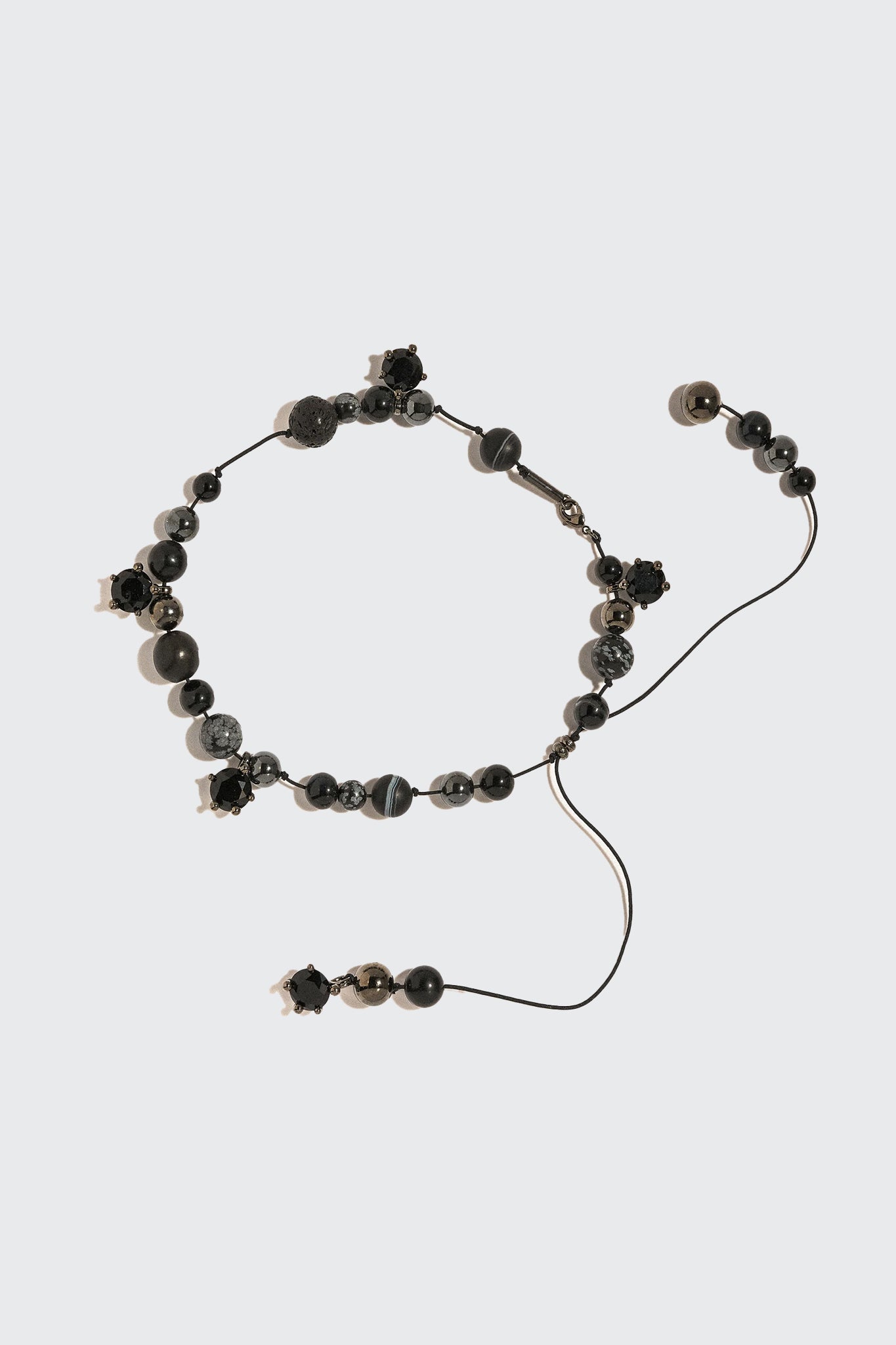 -Rhodium plated brass, black obsidian, hawk's eye, zircon, lava, black onyx, nylon