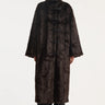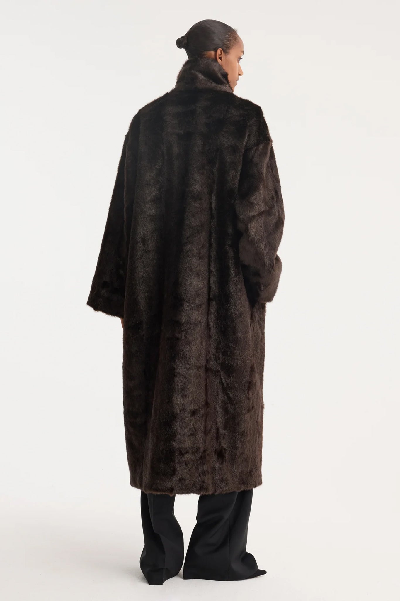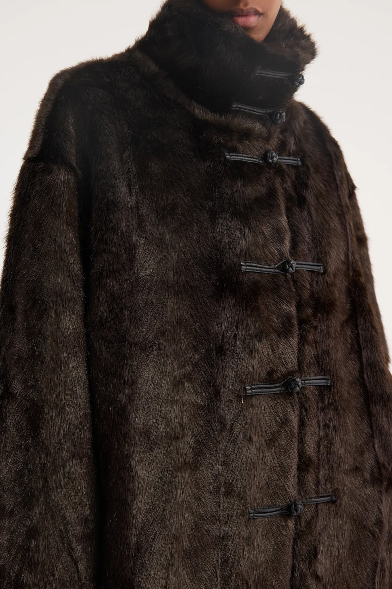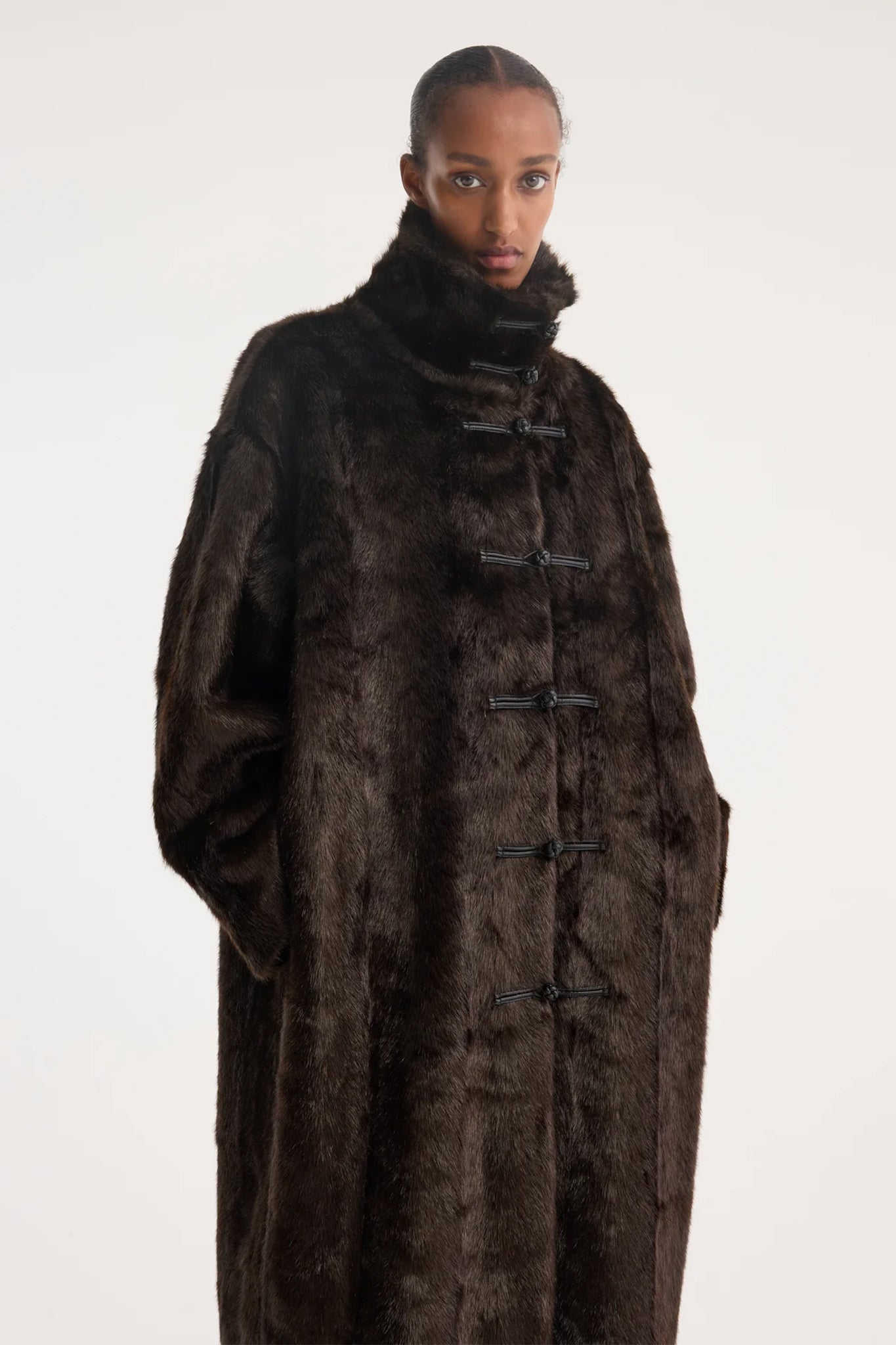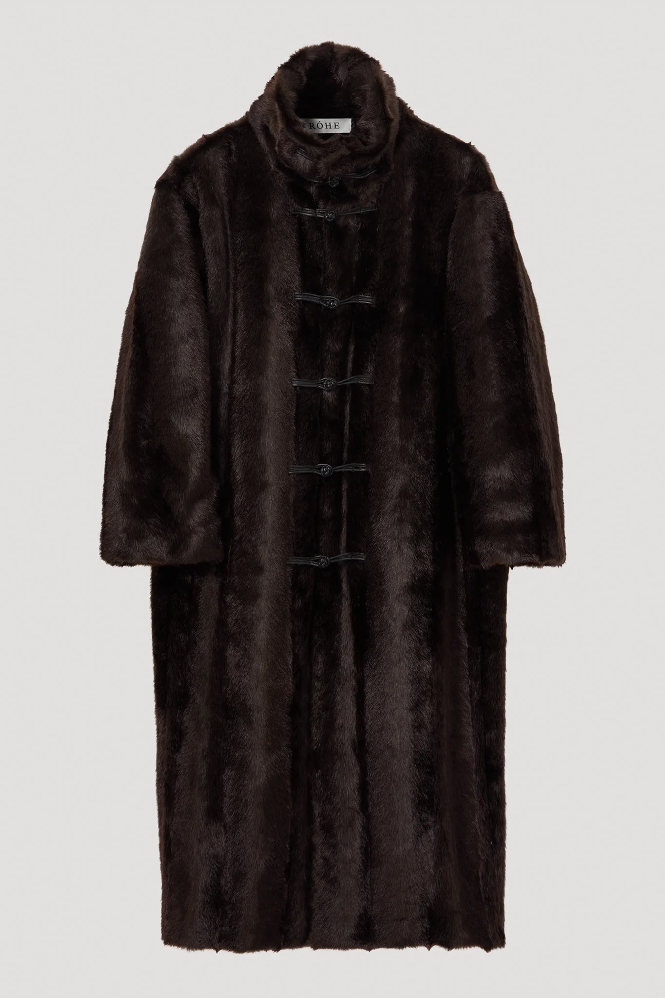Long faux fur coat with stand collar. Features wide sleeves, pankou closures along the front and two side patch pockets.