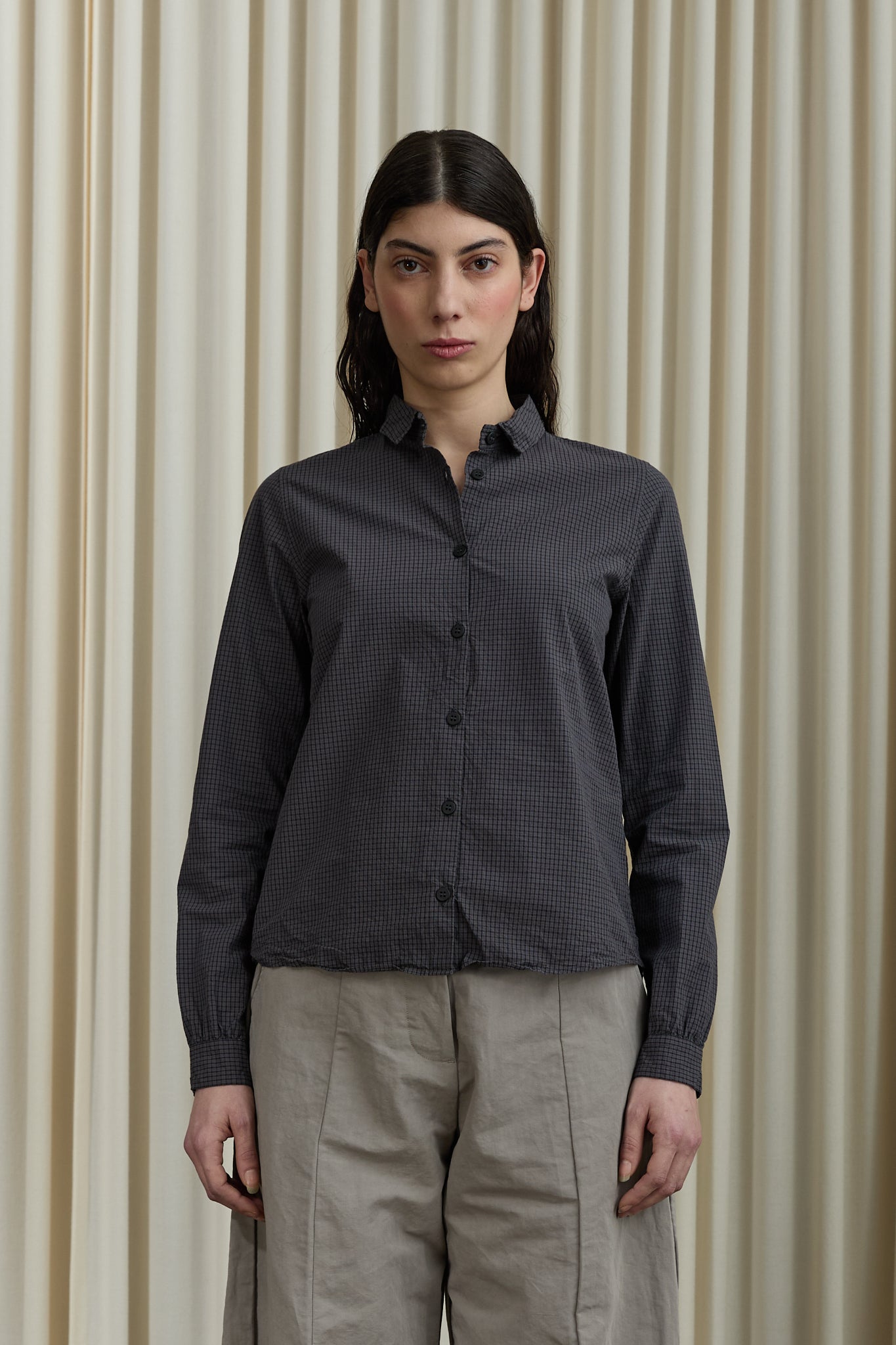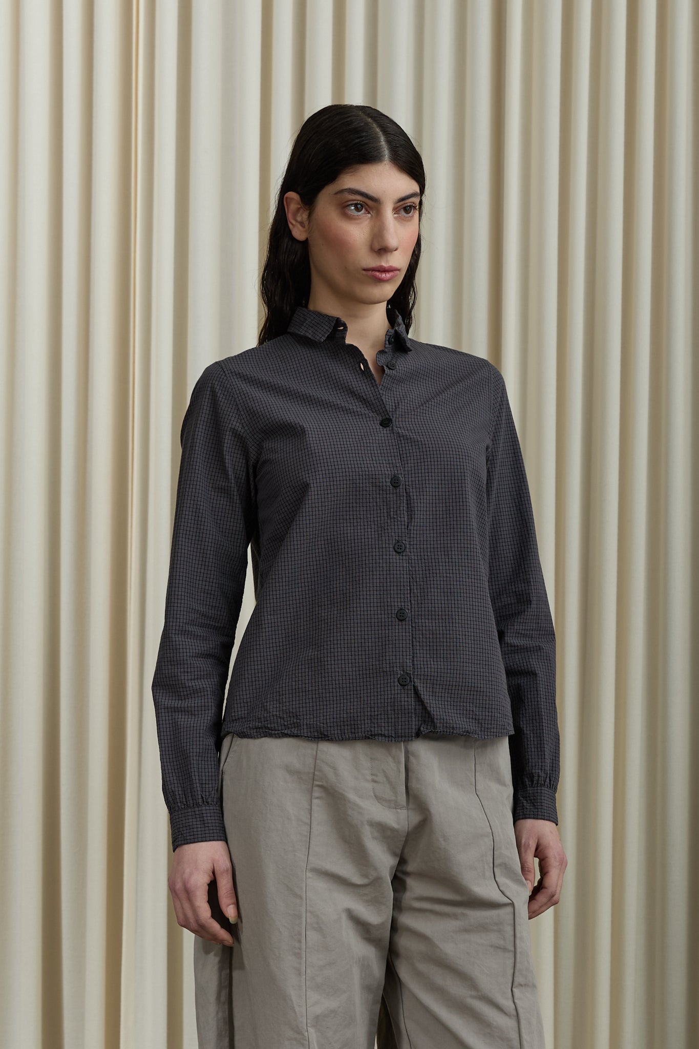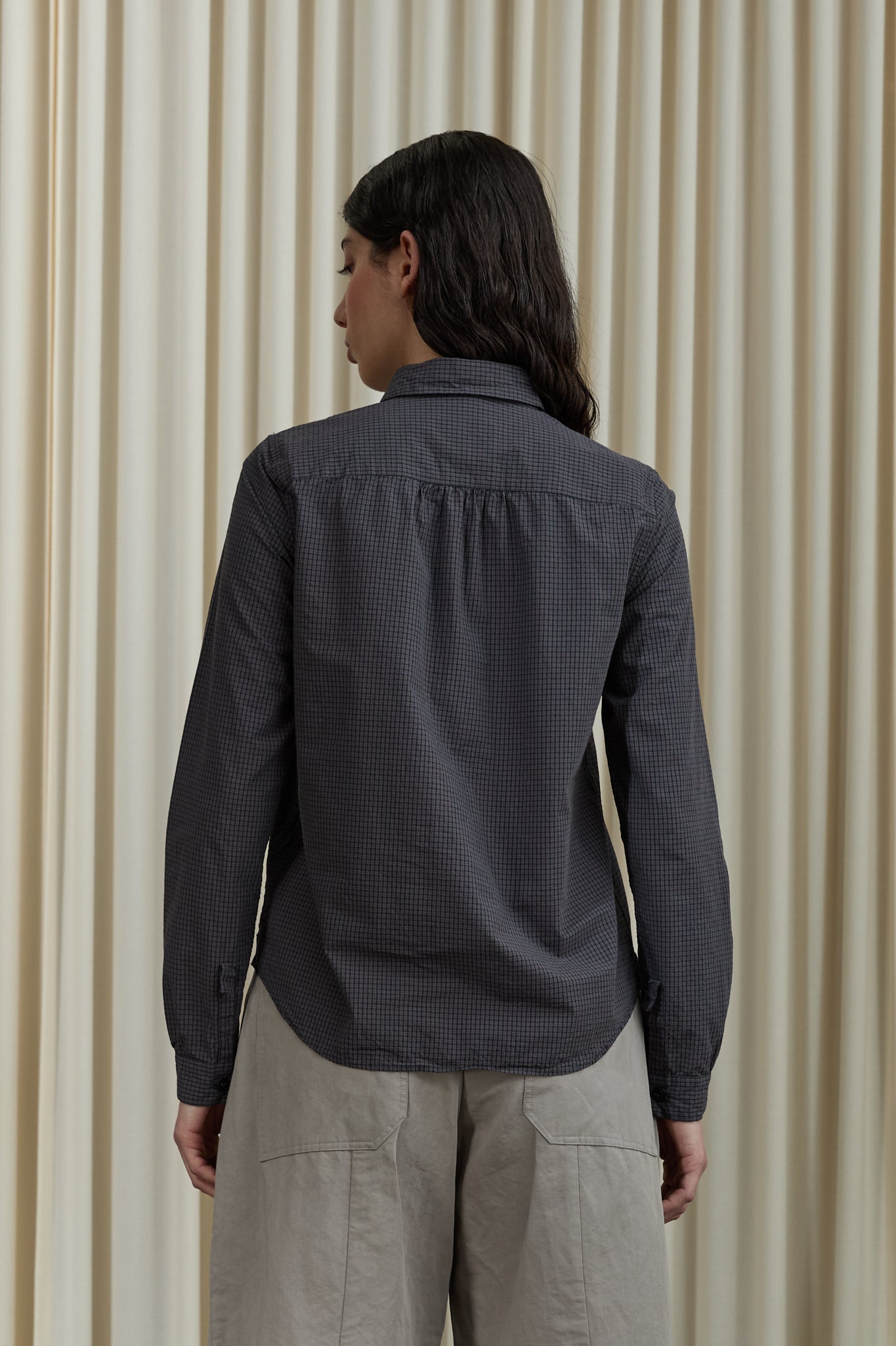Slim-fit signature shirt with a classic collar and ruched sleeve cuffs. Featuring “Tyrol pleats” at the back yoke for subtle volume and a curved shirttail hem.