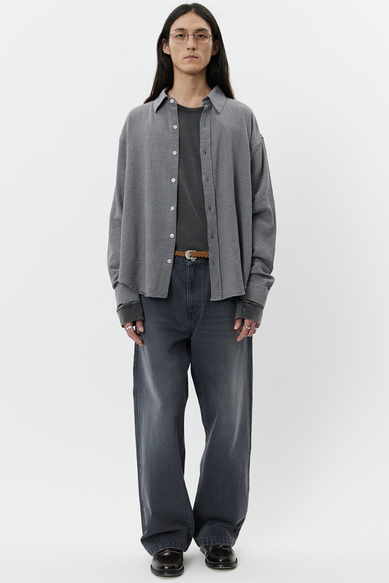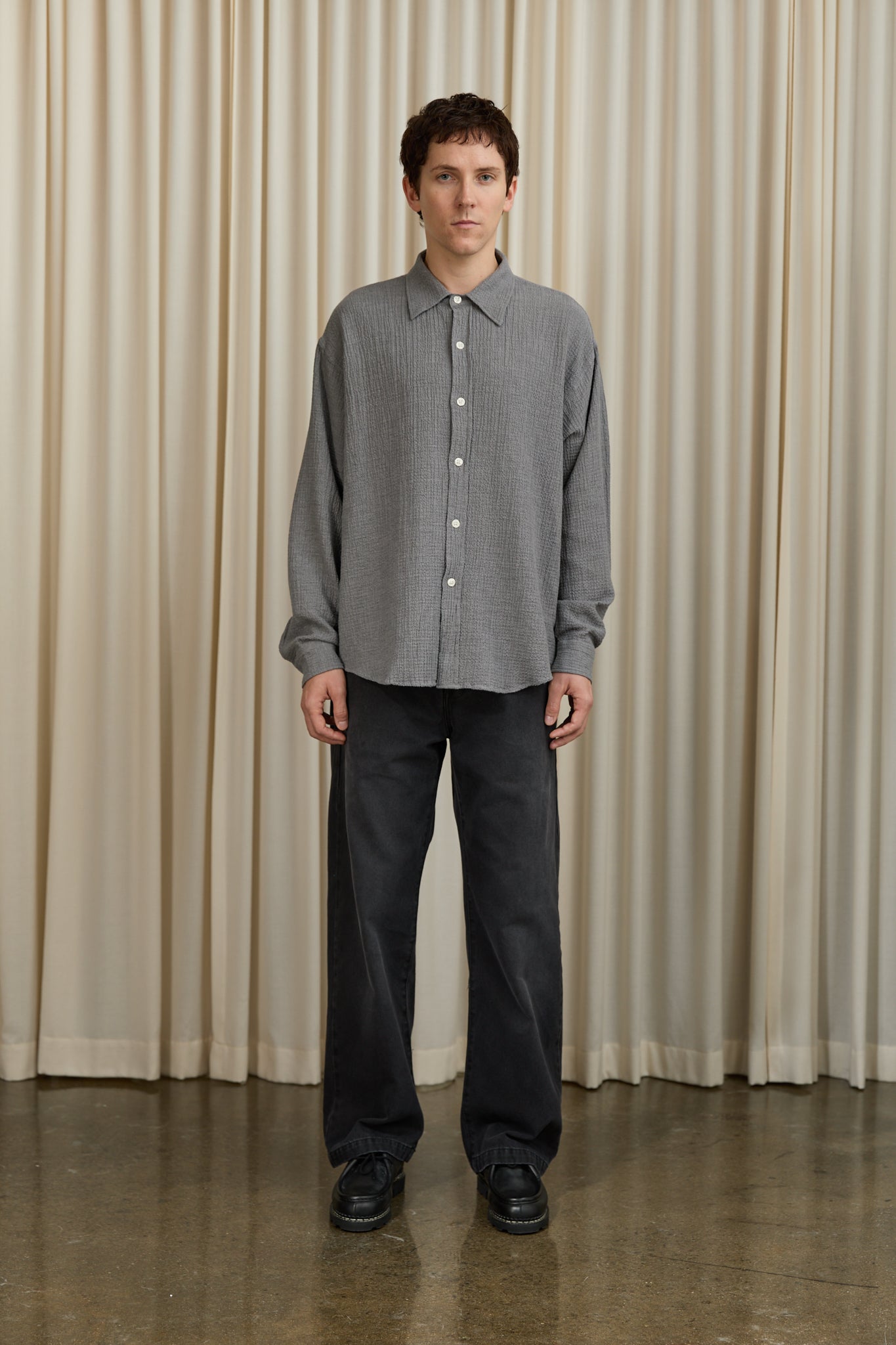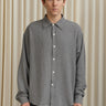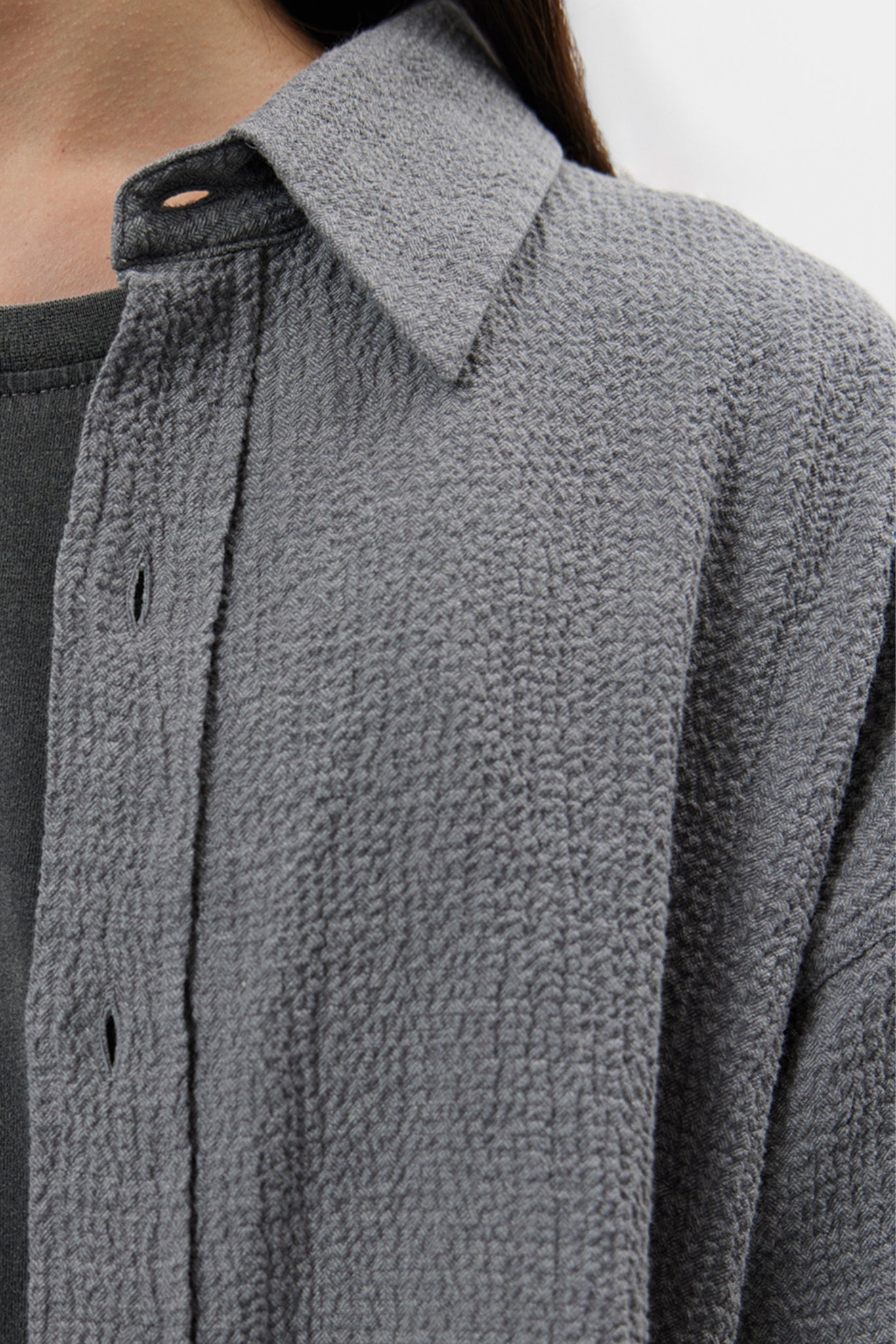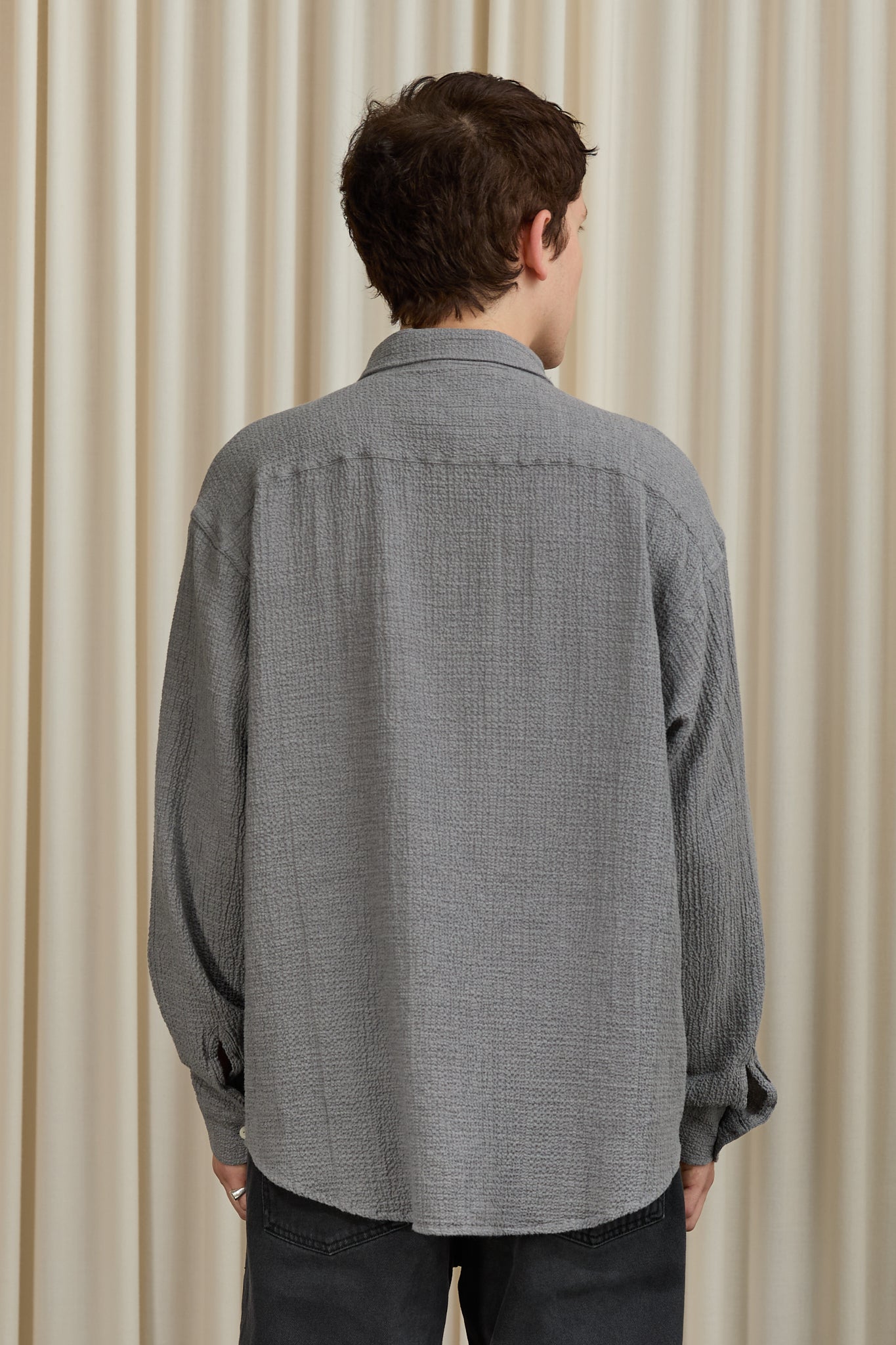 Long-sleeve, lightweight seersucker shirt in a relaxed fit with rounded hem extended at front and back. Features spread collar and button placket.