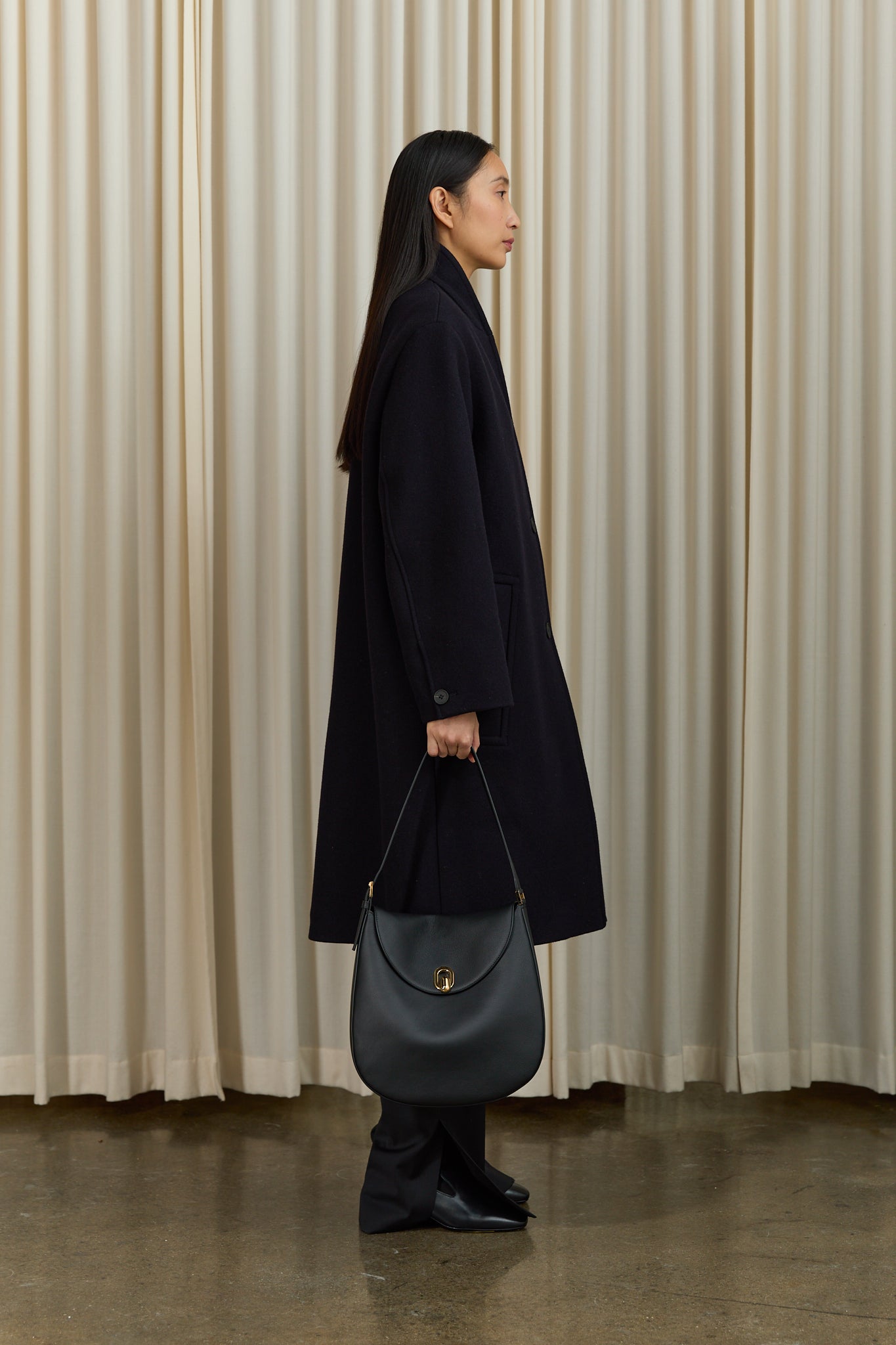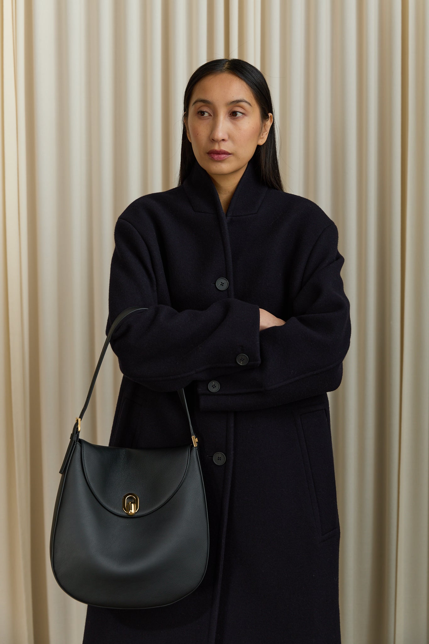 Large hobo bag in milled calf leather. Featuring Tondo magnetic lock, one interior pocket, and an adjustable shoulder strap.