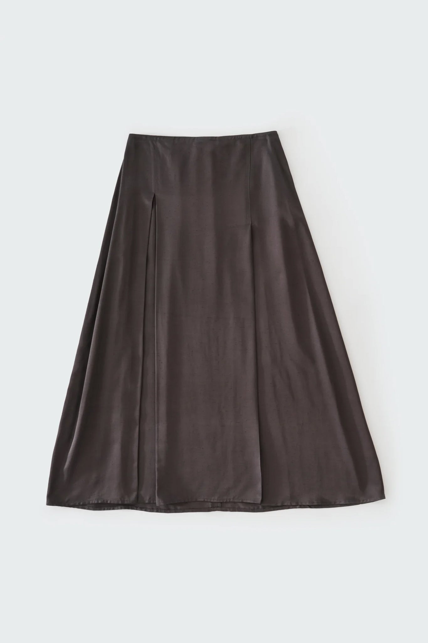 A-line shape skirt with two top-stitched asymmetric box pleats at the front. Features
