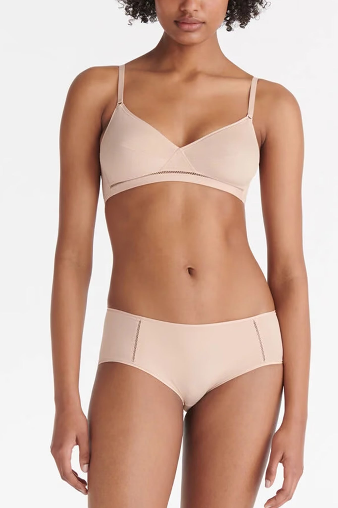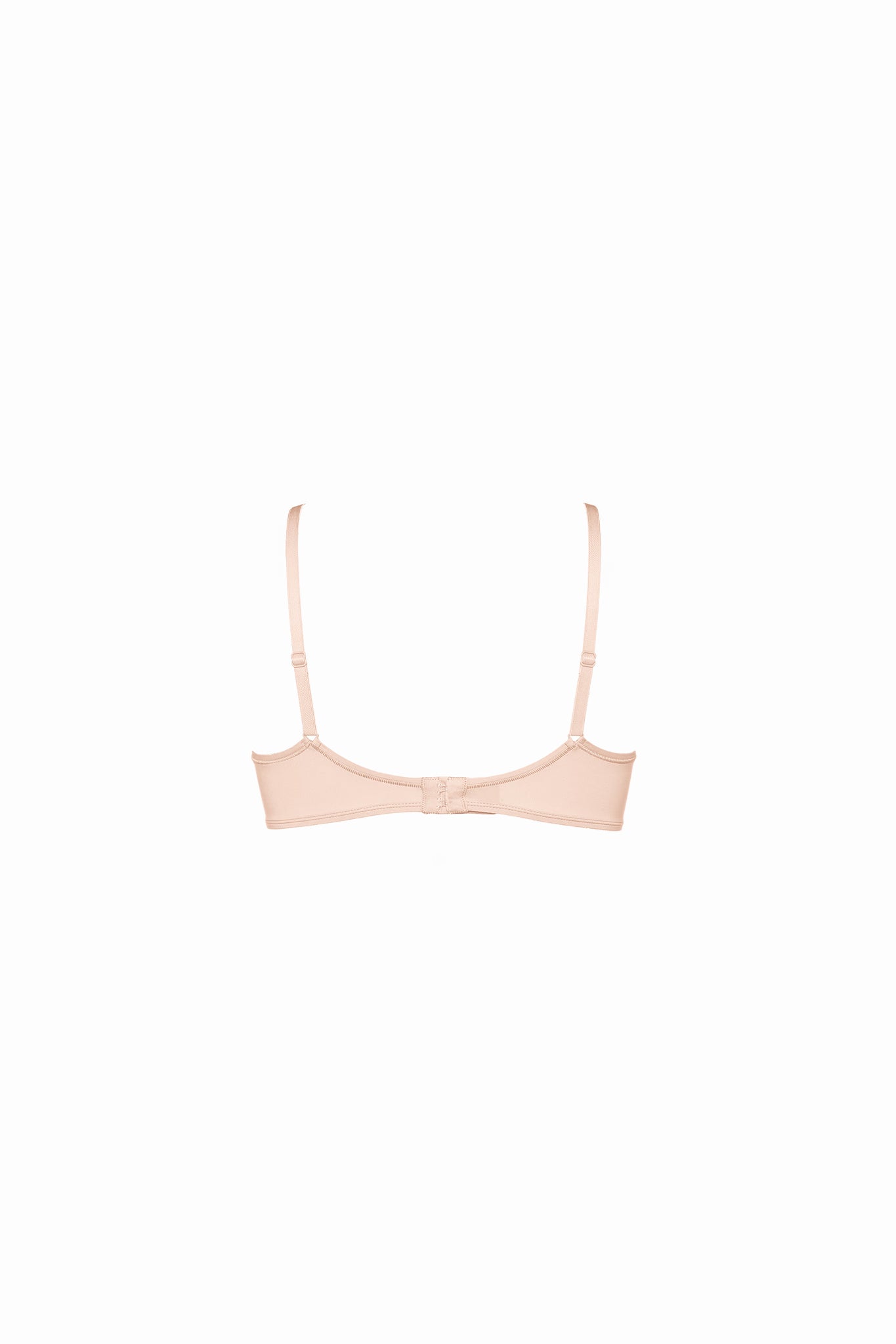 Wireless triangle bra with applied band decorated with vous-et-moi stitching. Featuring thin adjustable straps, bust darts, side stays, and full-figure back.