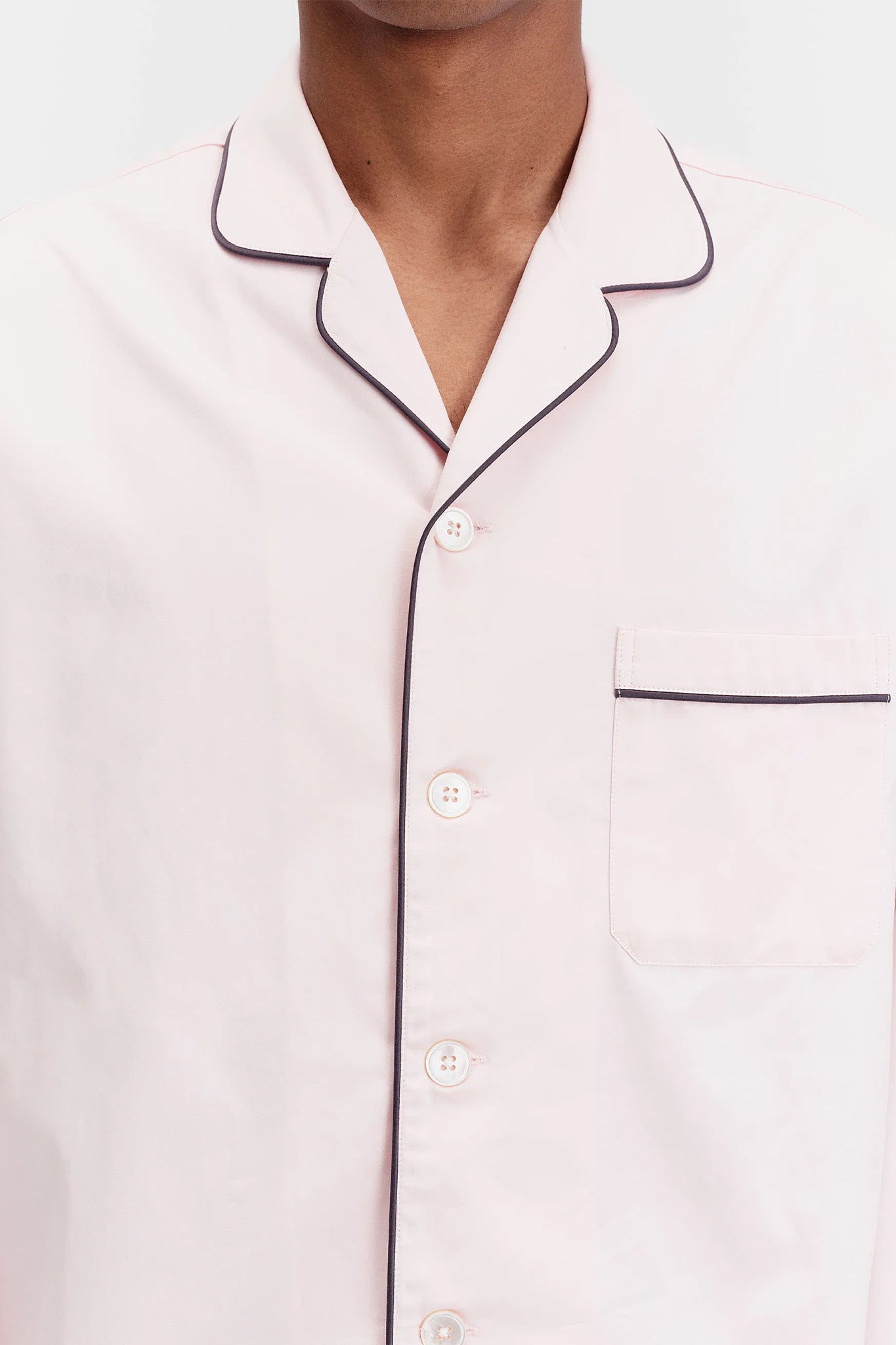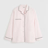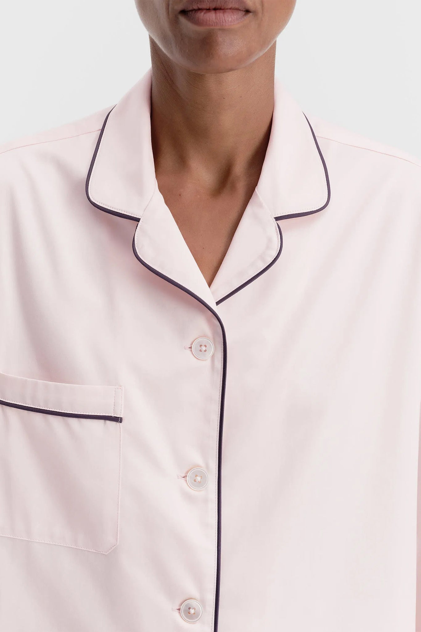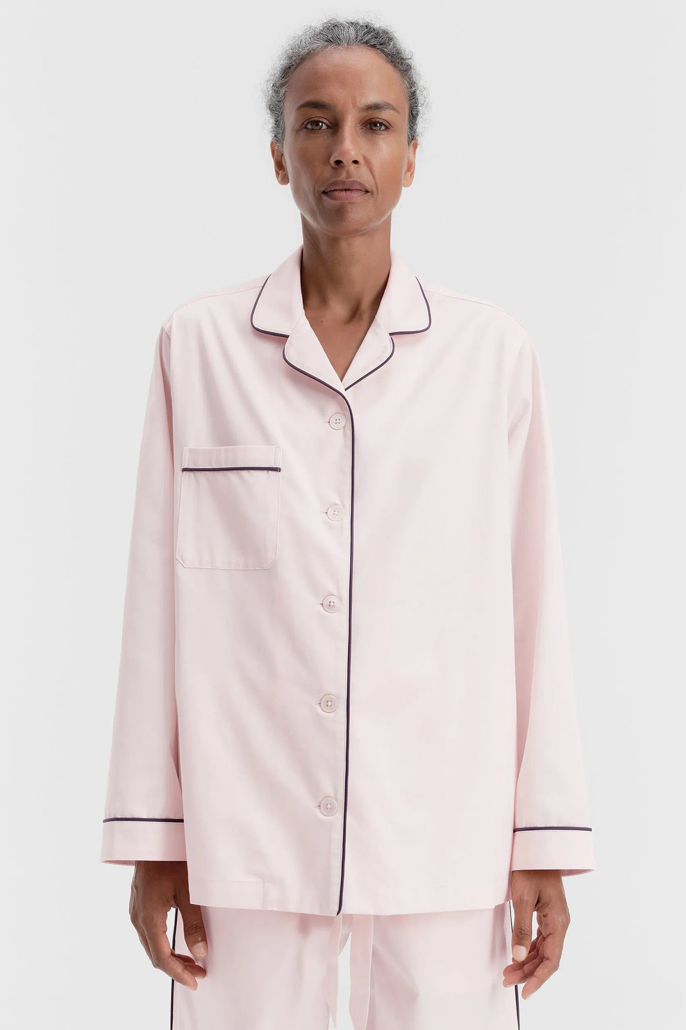 Mid-weight, soft cotton long-sleeved shirt in pale pink with dark grey piping detail in