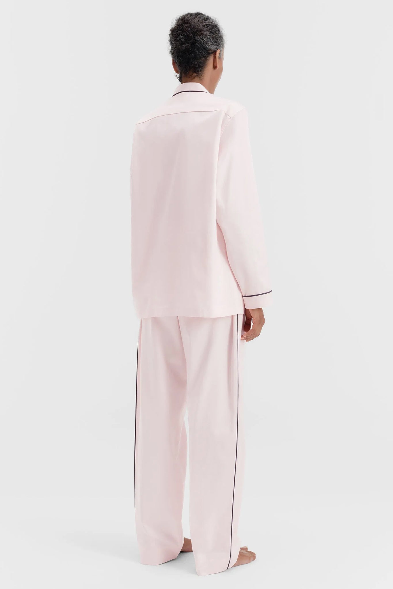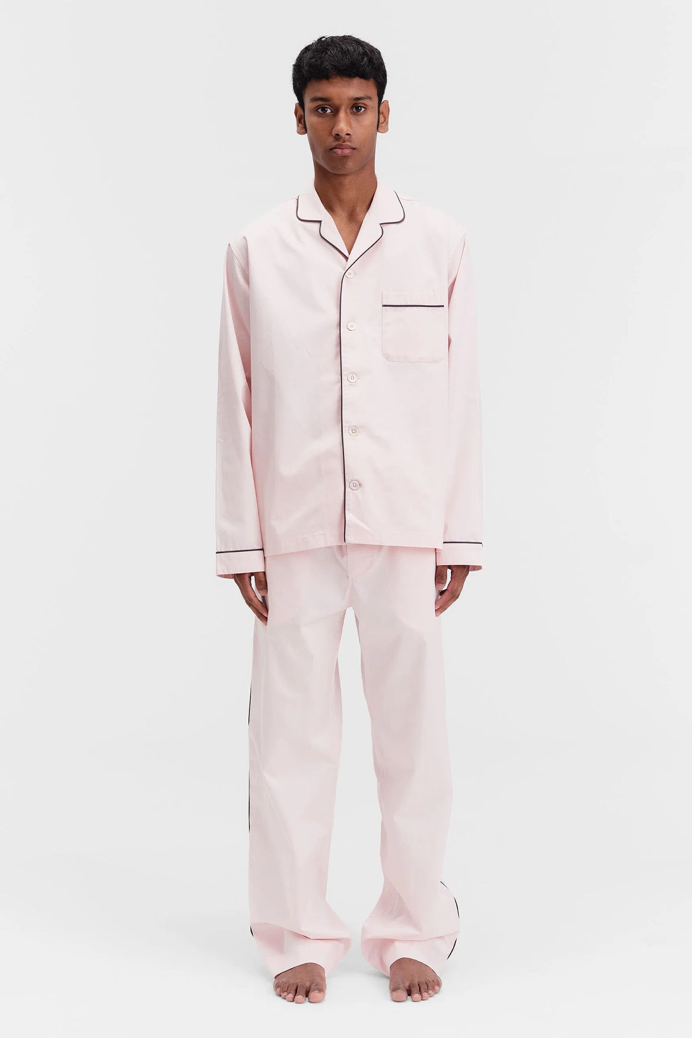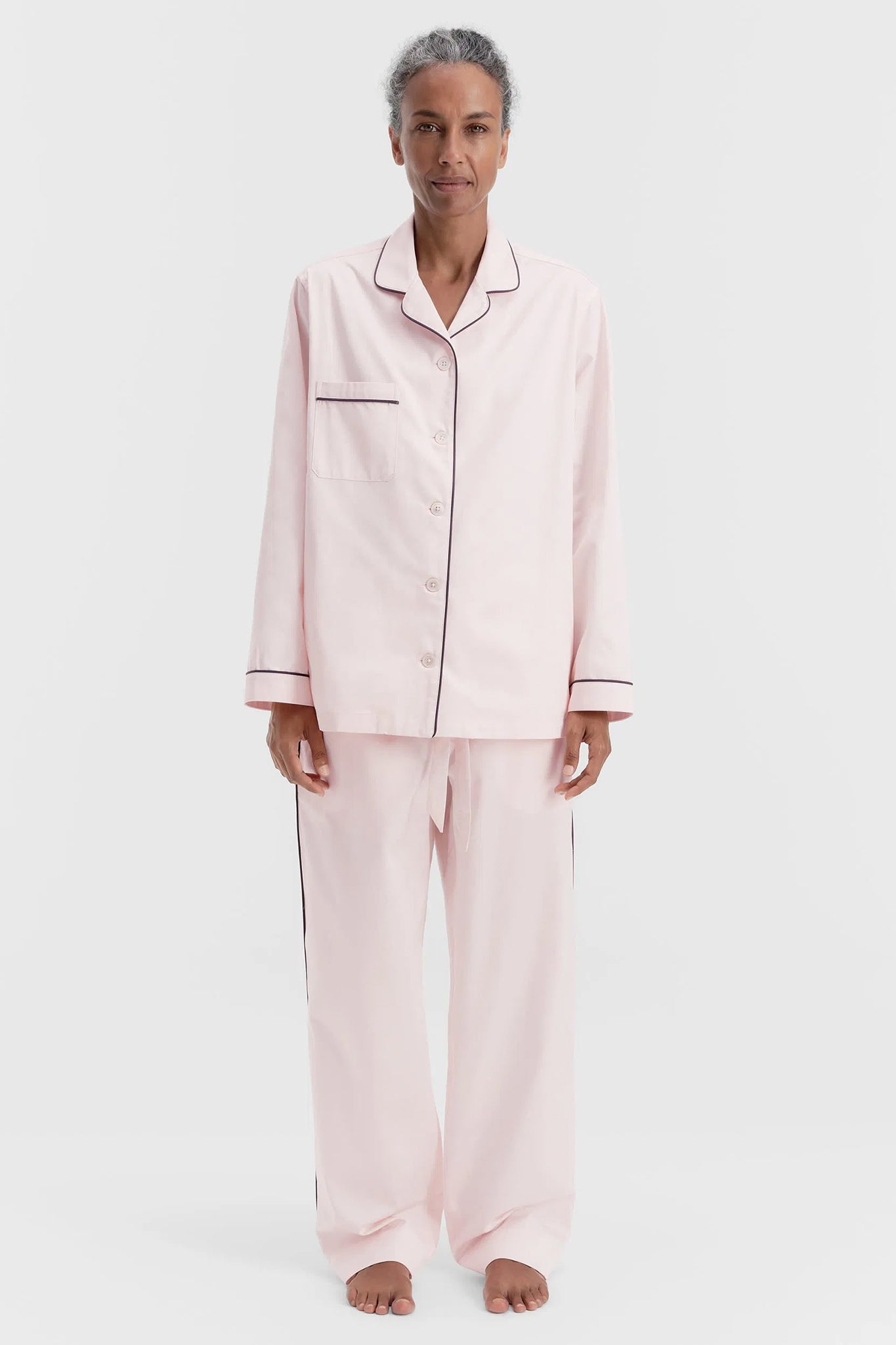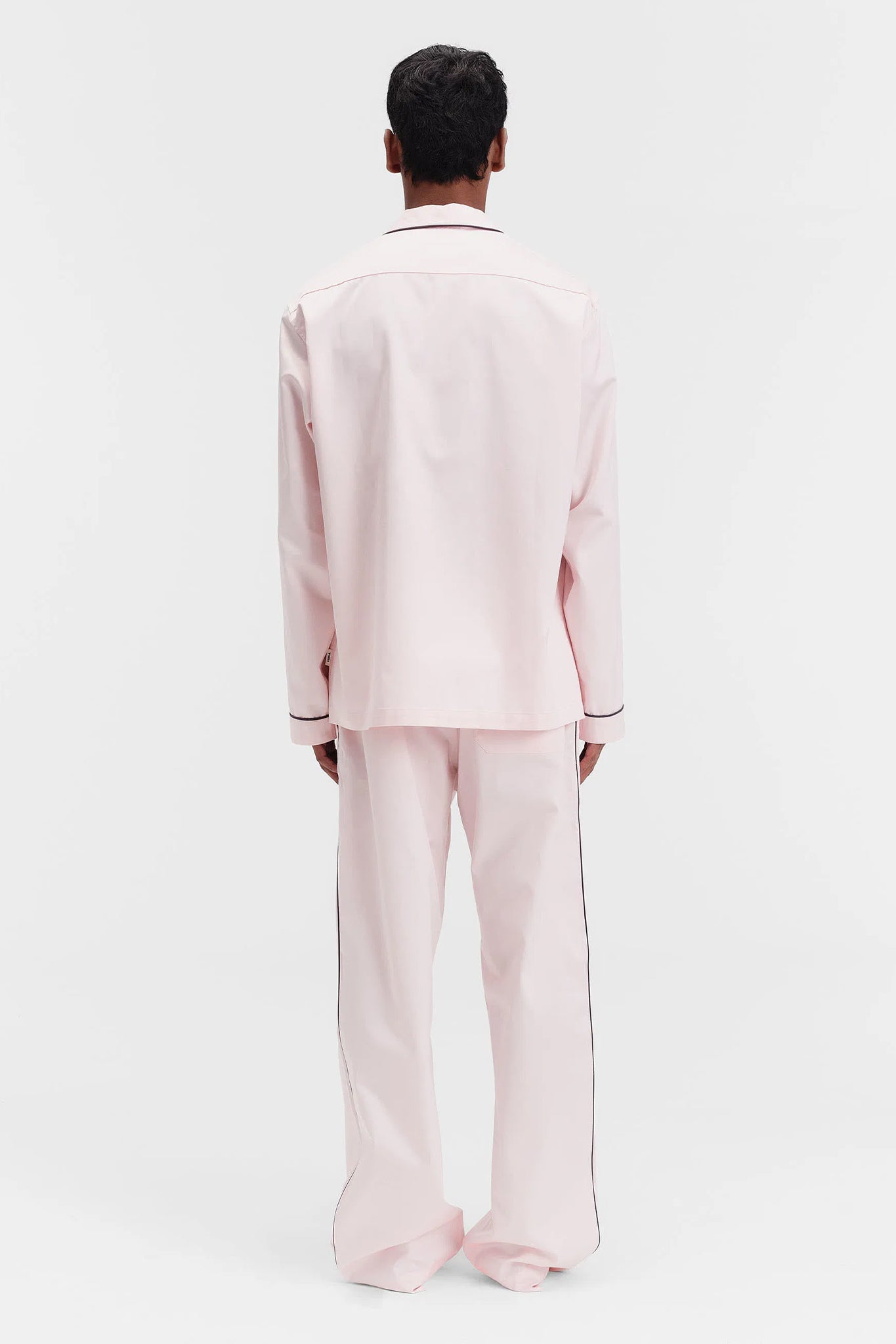 Mid-weight, soft cotton long-sleeved shirt in pale pink with dark grey piping detail in