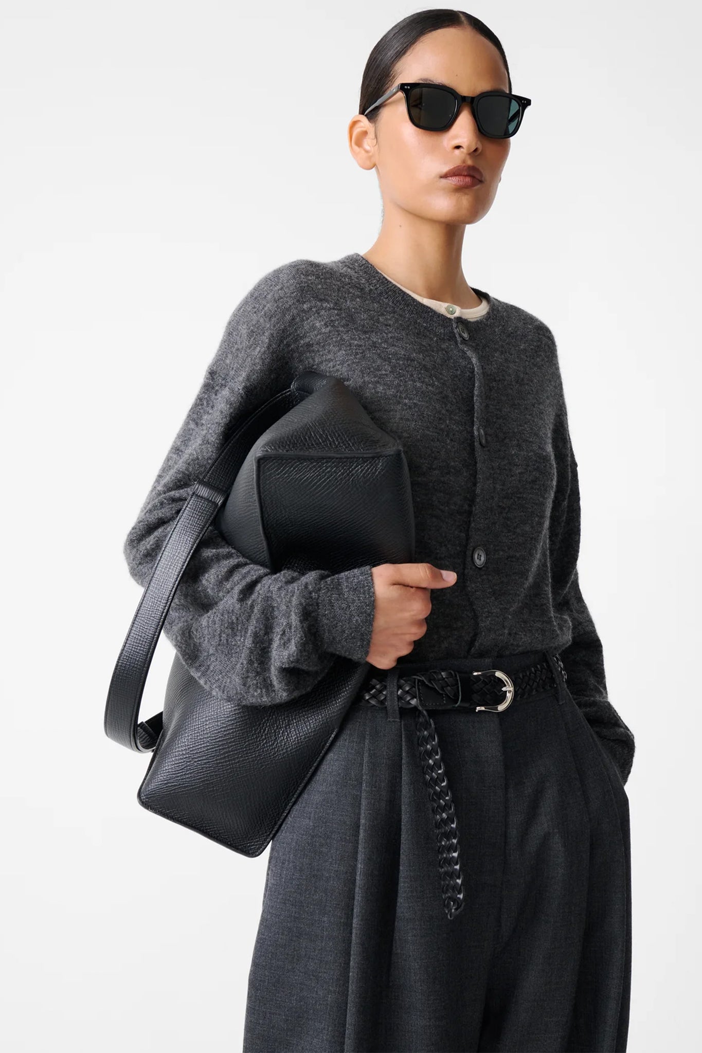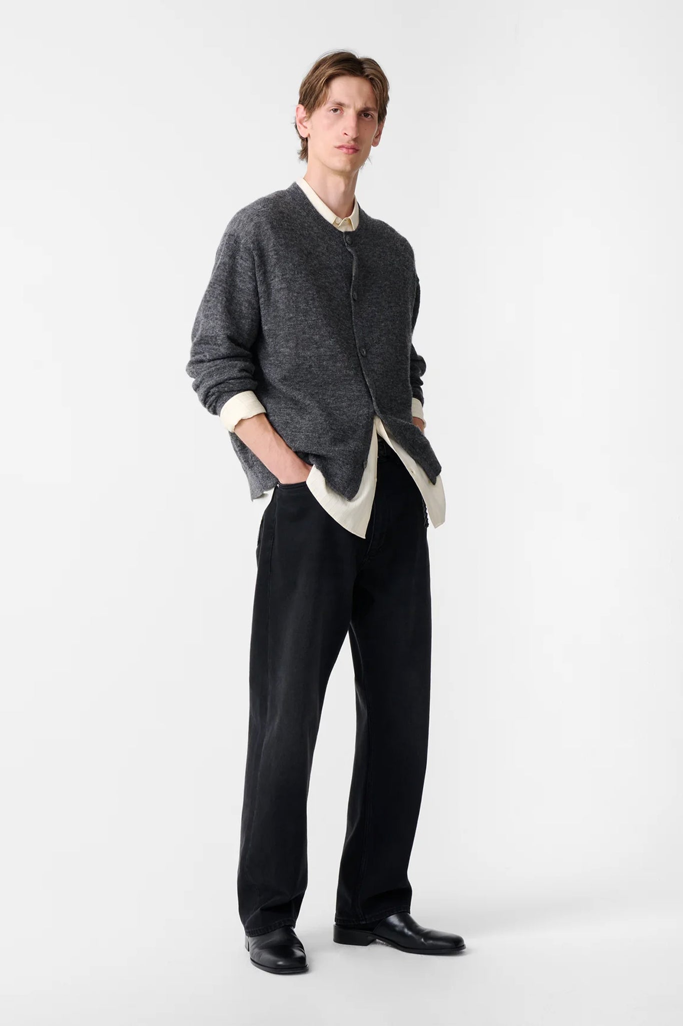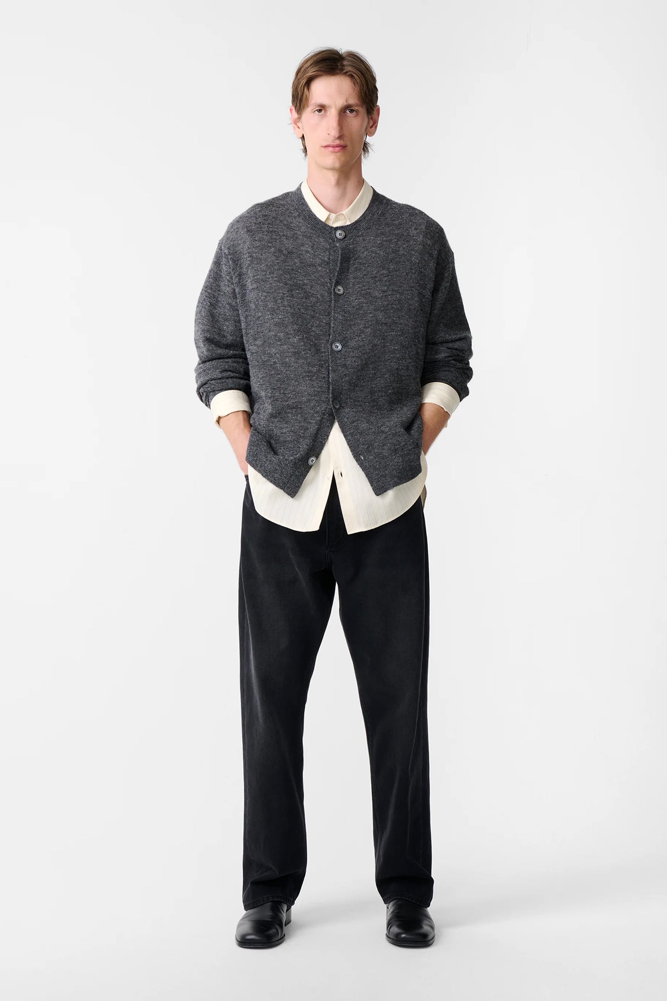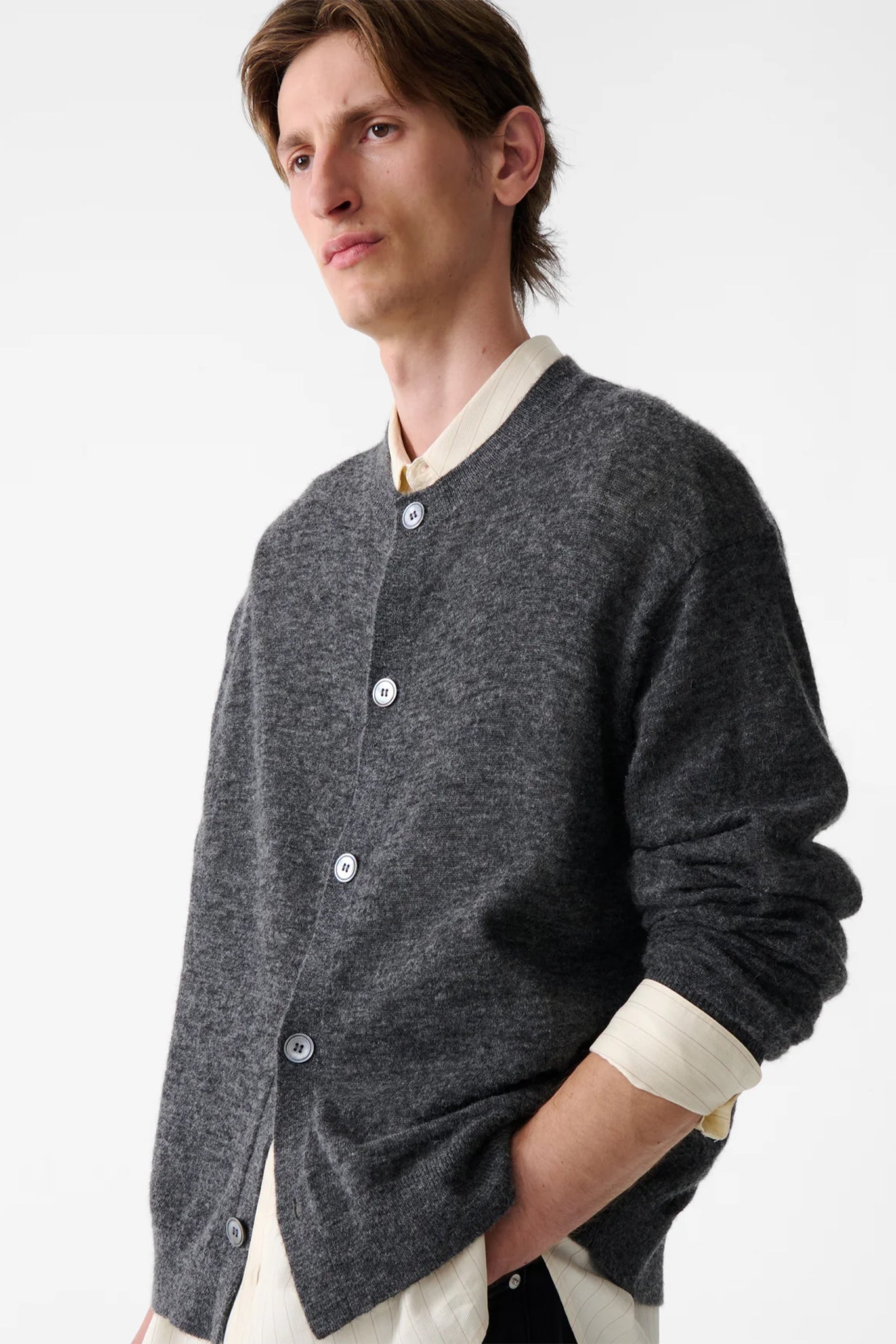 Relaxed cardigan in round neckline with dropped shoulders. Features buttoned closure and fine ribbed trims at neck, cuffs and hem.