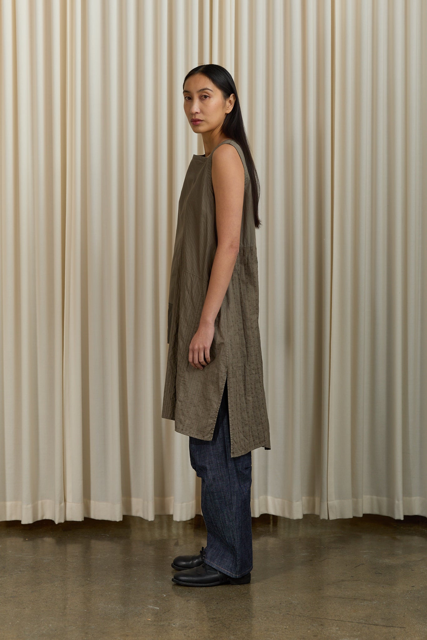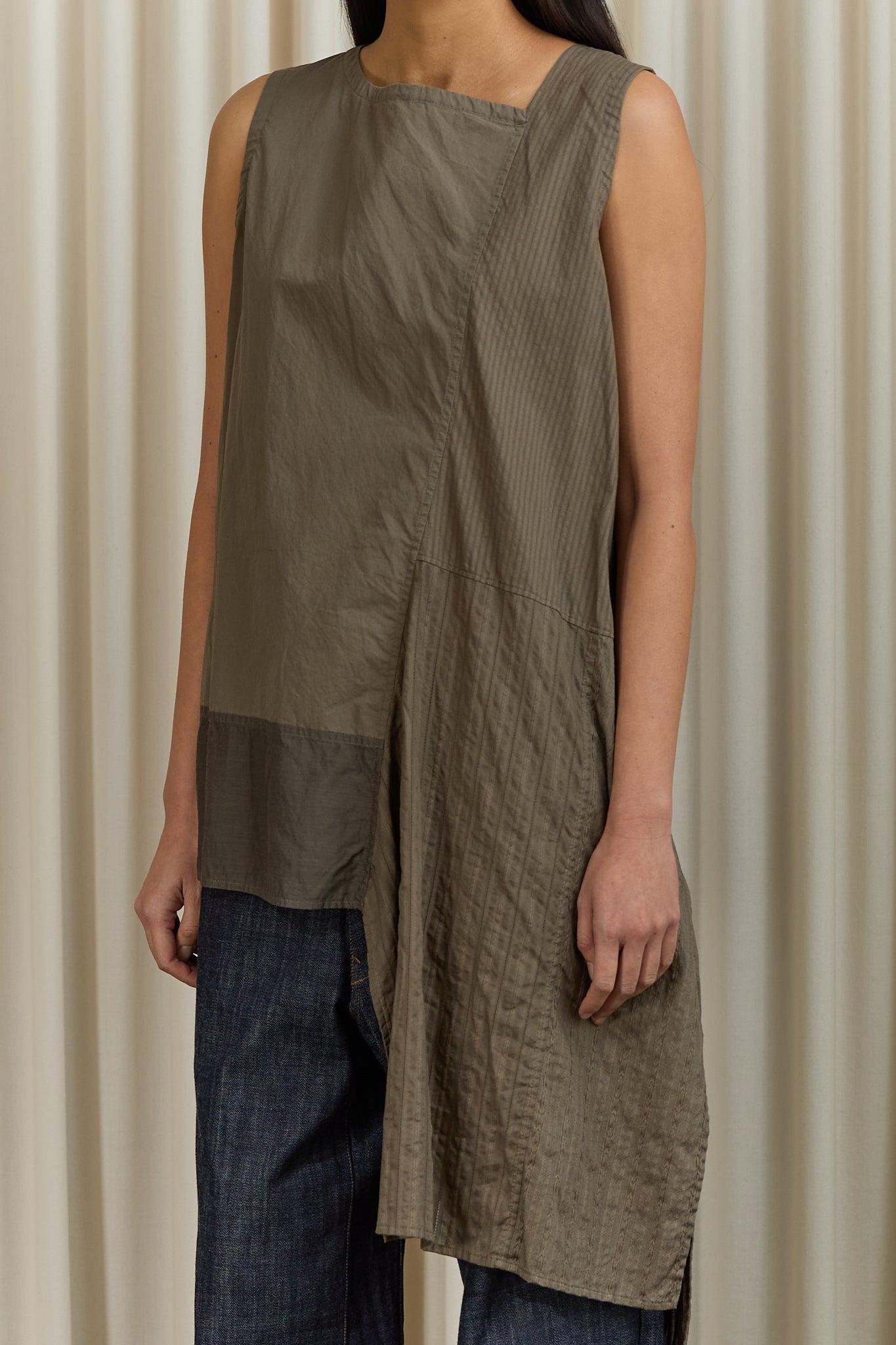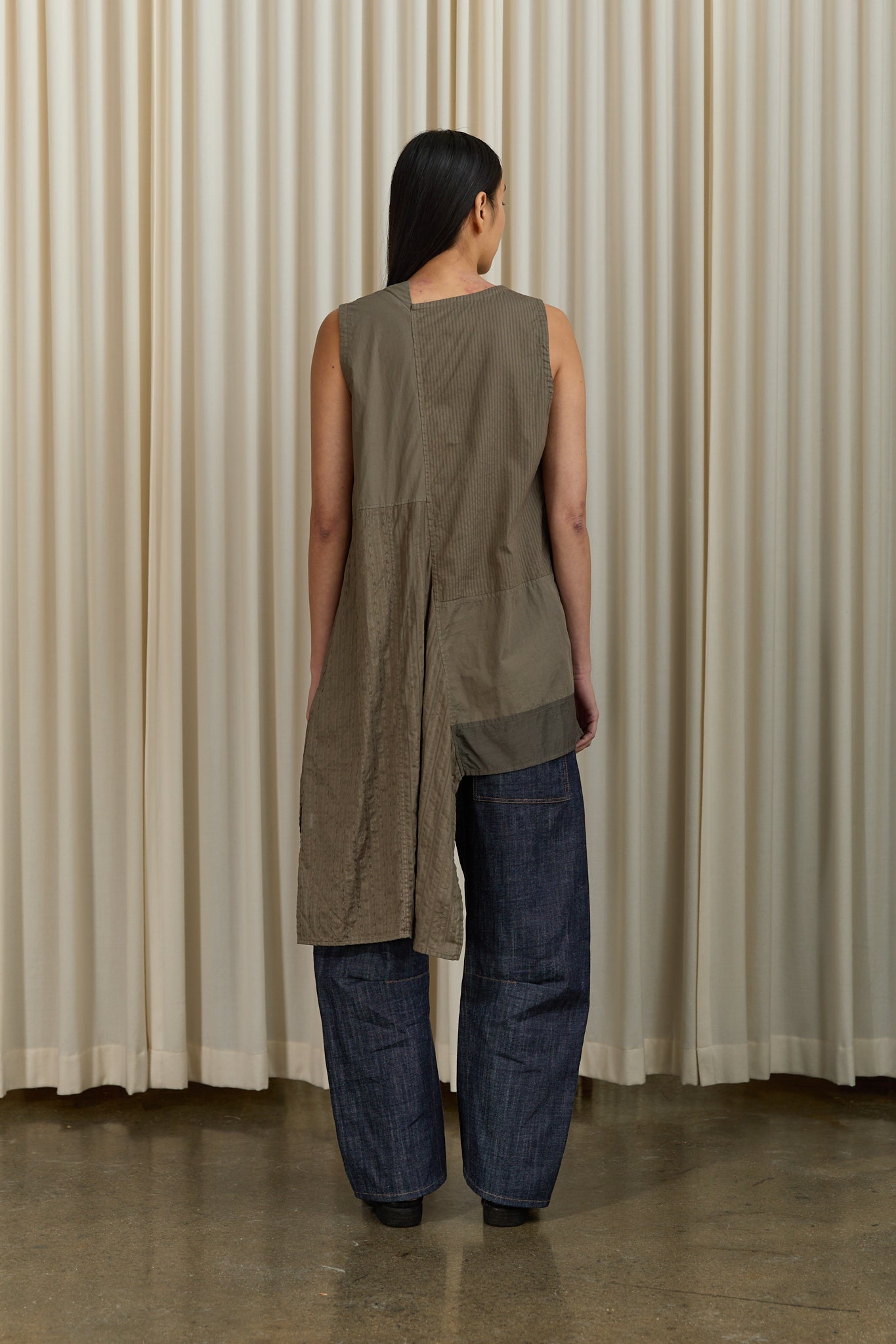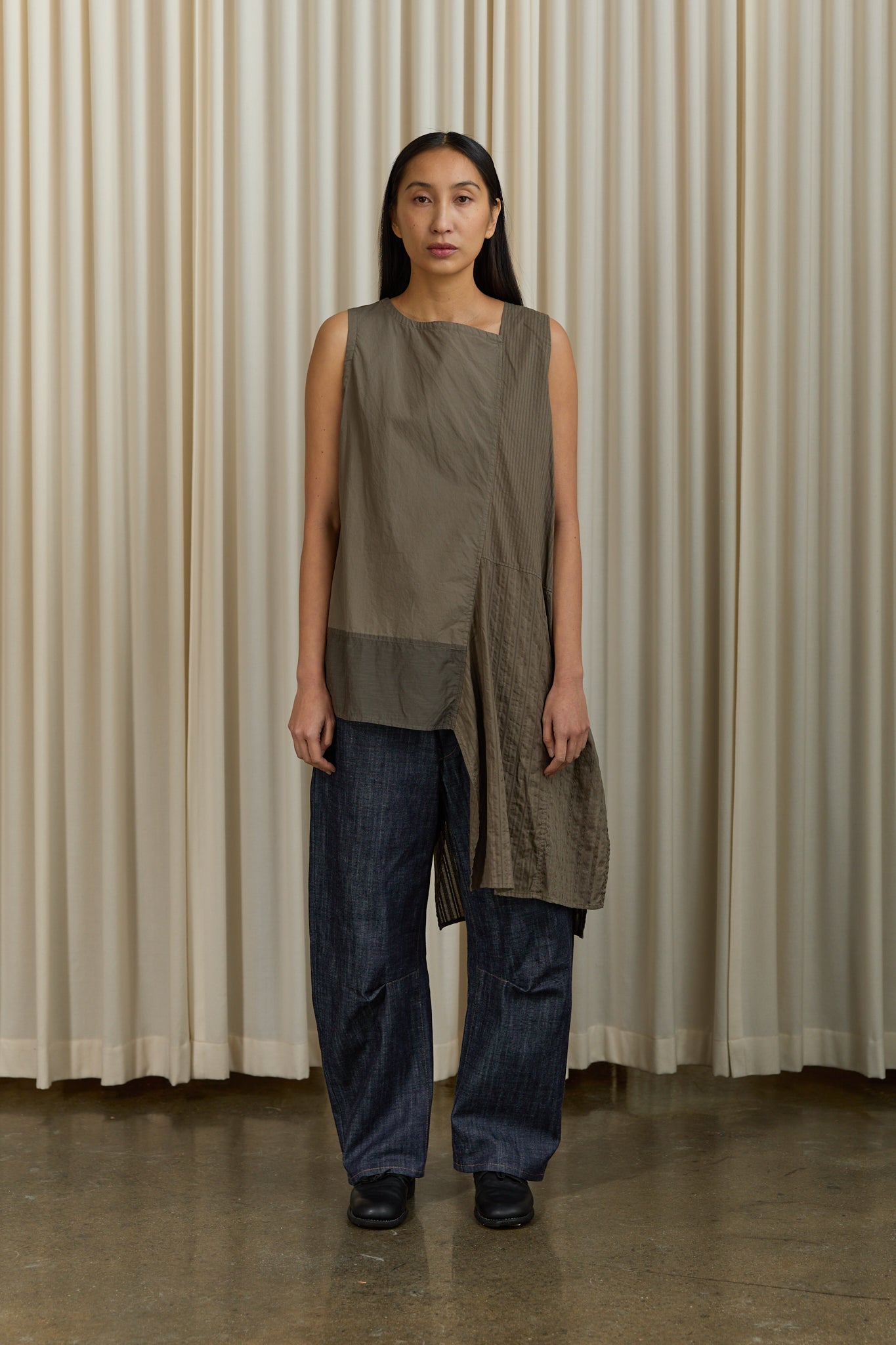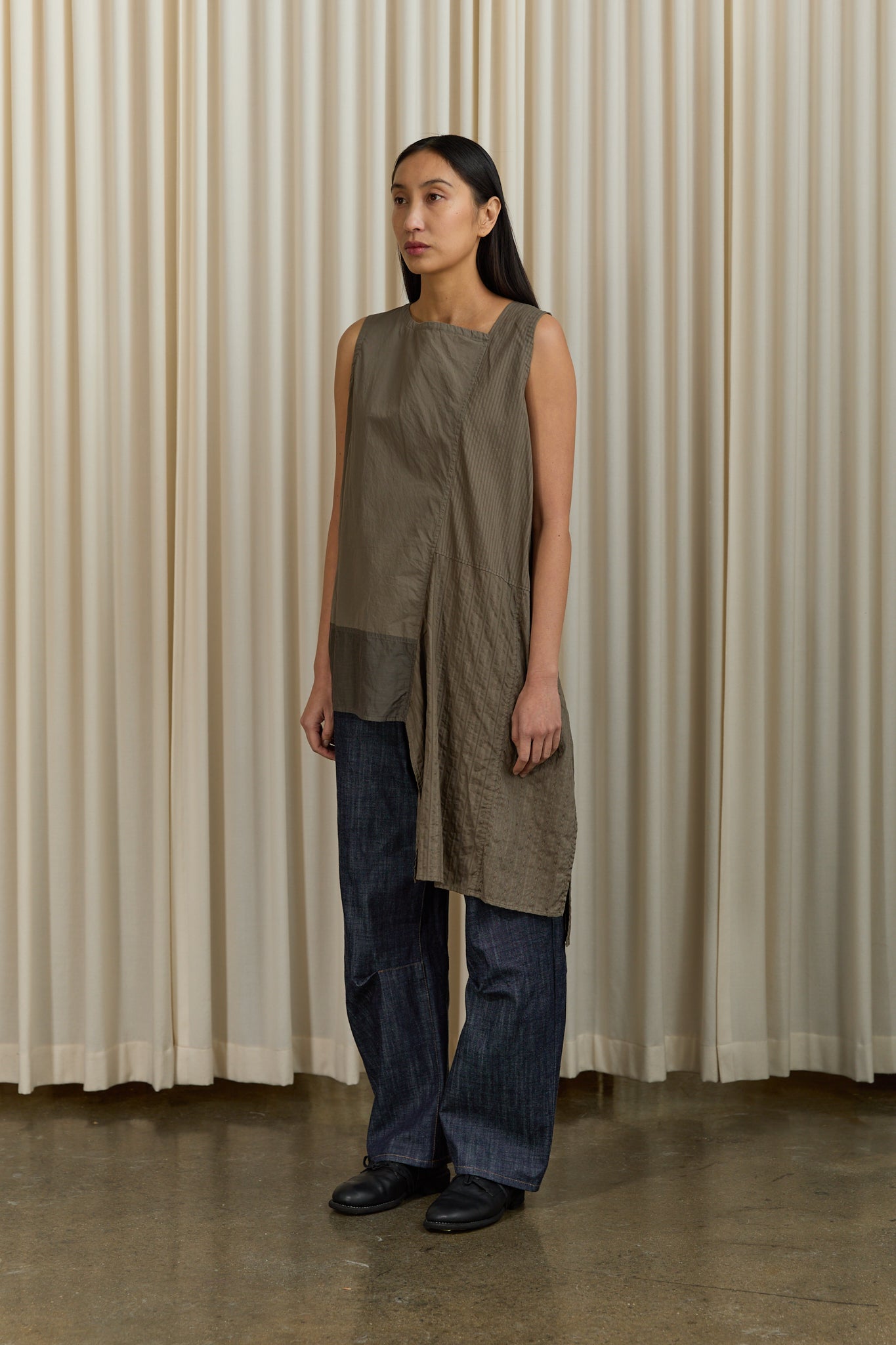 Asymmetric sleeveless blouse with square neckline and embroidery details throughout. Featuring single side slits.