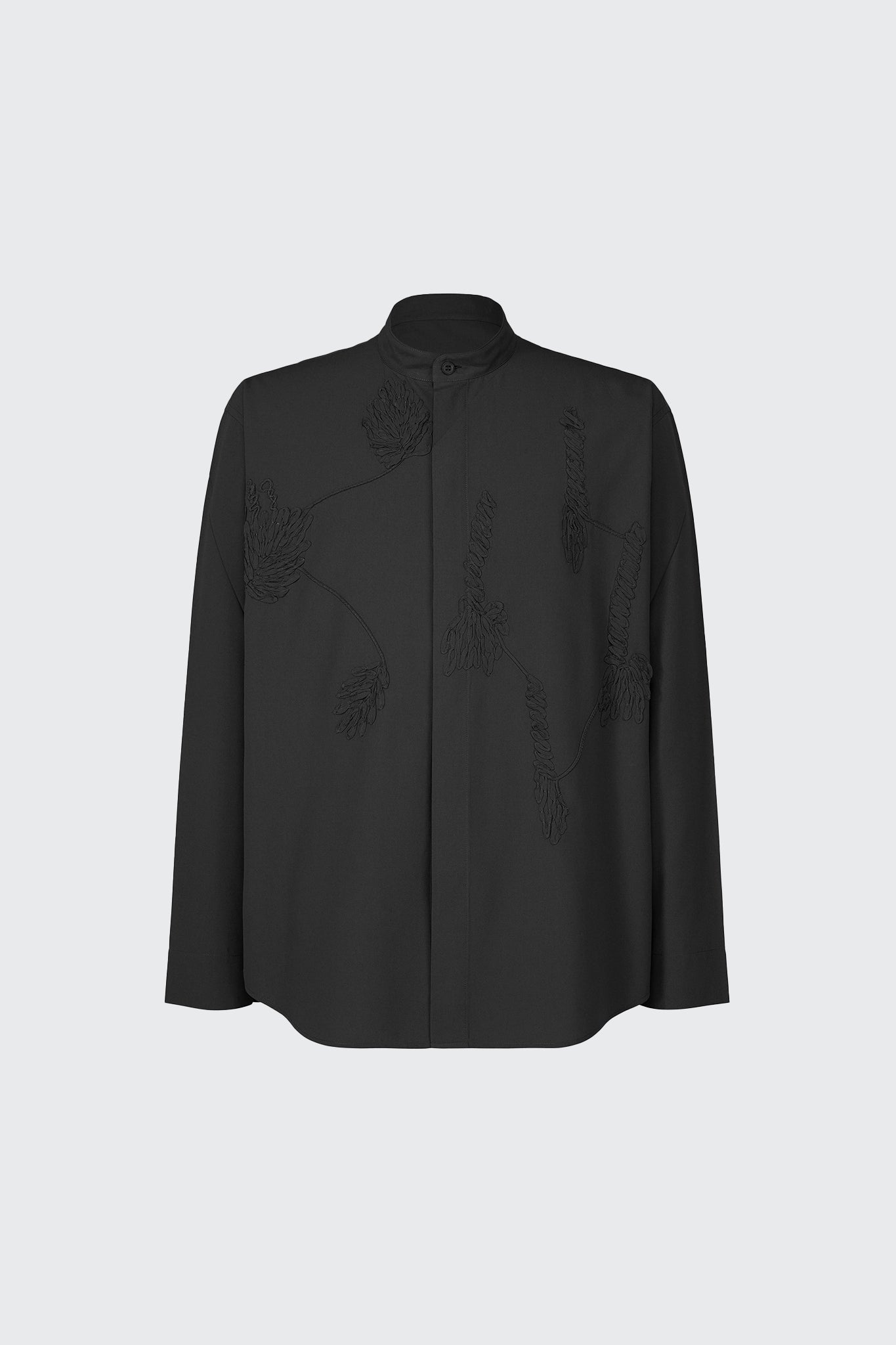 Long sleeve shirt with a stand collar. Features embroidery detail in brand's unique pressing technique, a concealed button closure at front, and a straight hem.