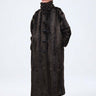 Long faux fur coat with stand collar. Features wide sleeves, pankou closures along the front and two side patch pockets.