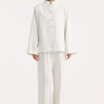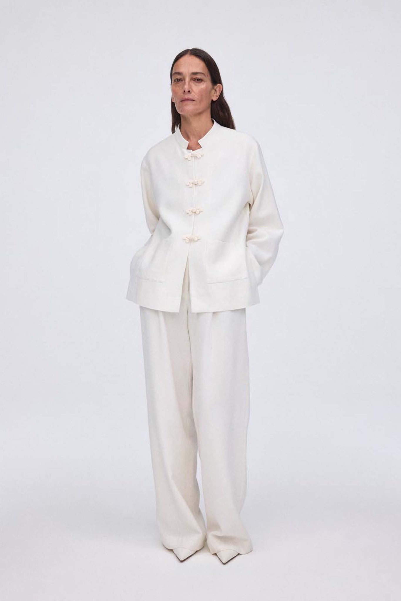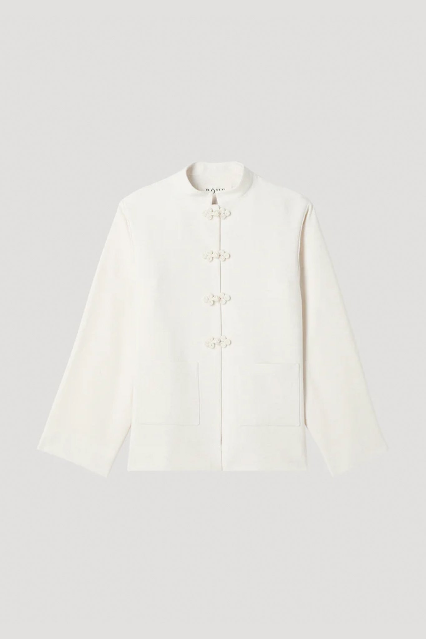 Signature round-neck jacket in silk-viscose blend. Features pankou closures along the front, wide sleeves, and two side patch pockets.