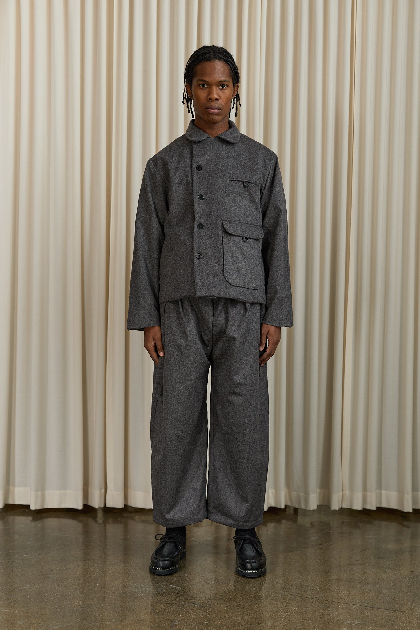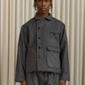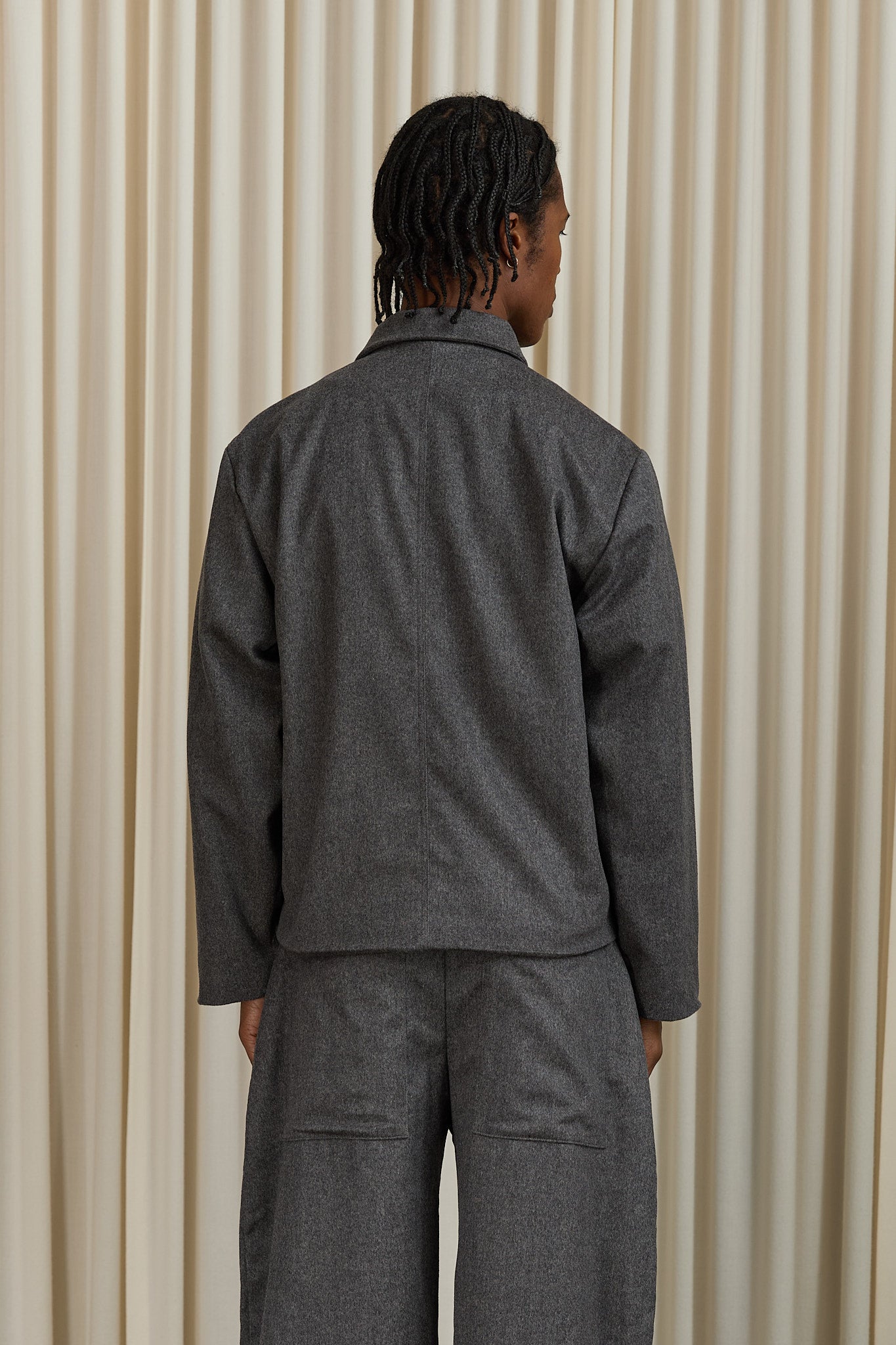 Boxy, slightly cropped jacket with asymmetrical corozo button closure. Featuring a double welt pocket with button loop closure on the left chest, a rounded patch pocket on the lower left front, hidden side seam pockets with bartacking for reinforcement. Fully lined with a brushed cotton twill.